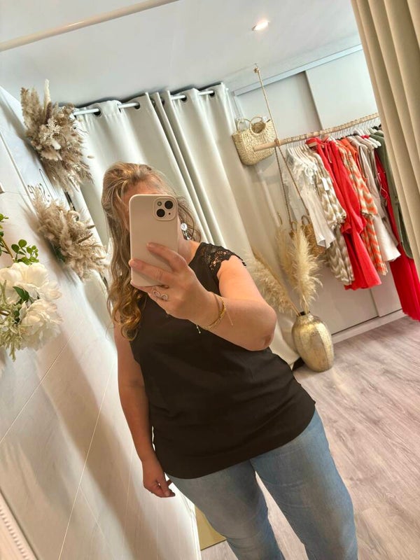* Blouse chic et classique noire avec de la dentelle aux épaules.