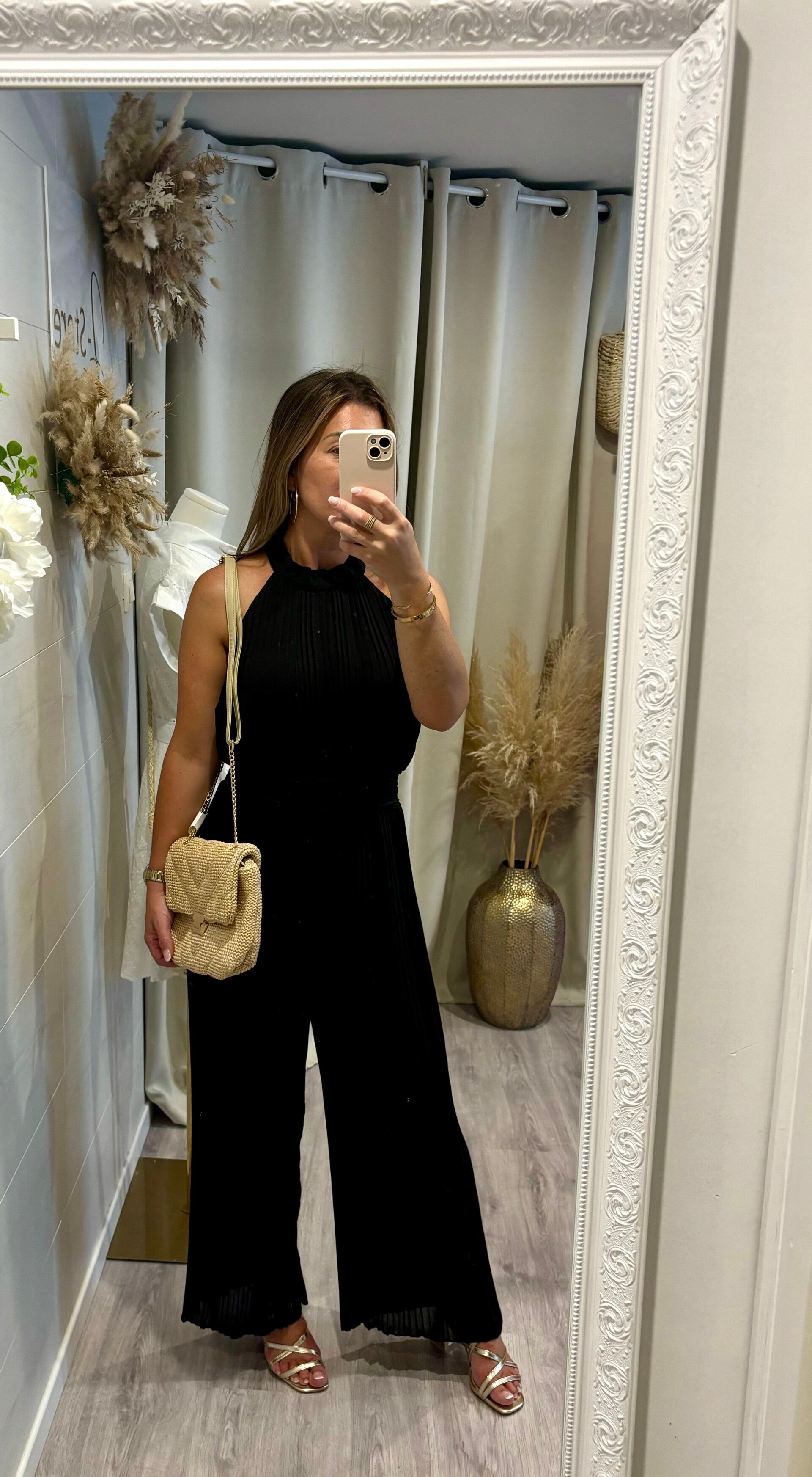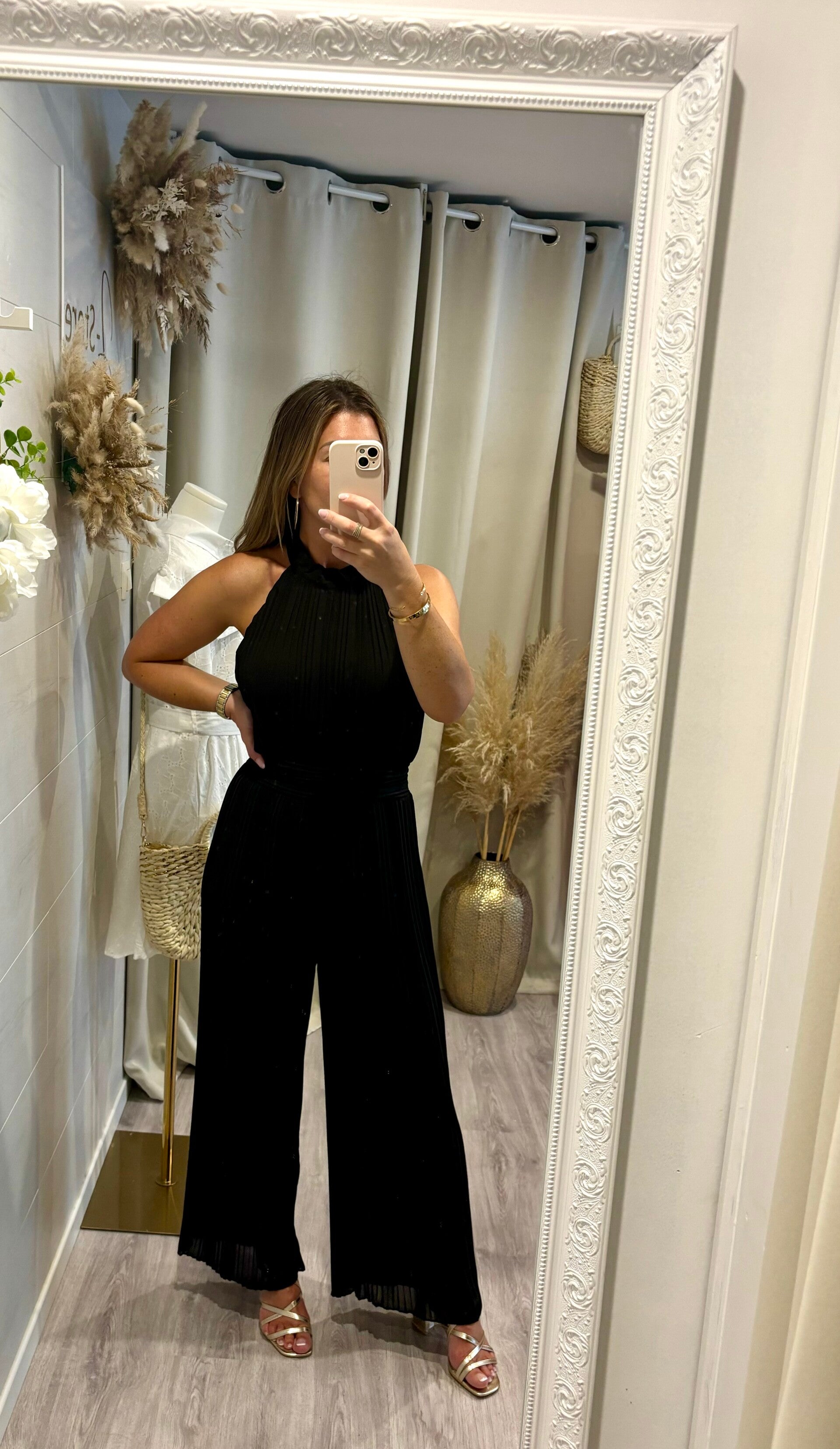 * combinaison fluide noire, serrée à la taille par un élastique et fermée dans le cou par 2 boutons.