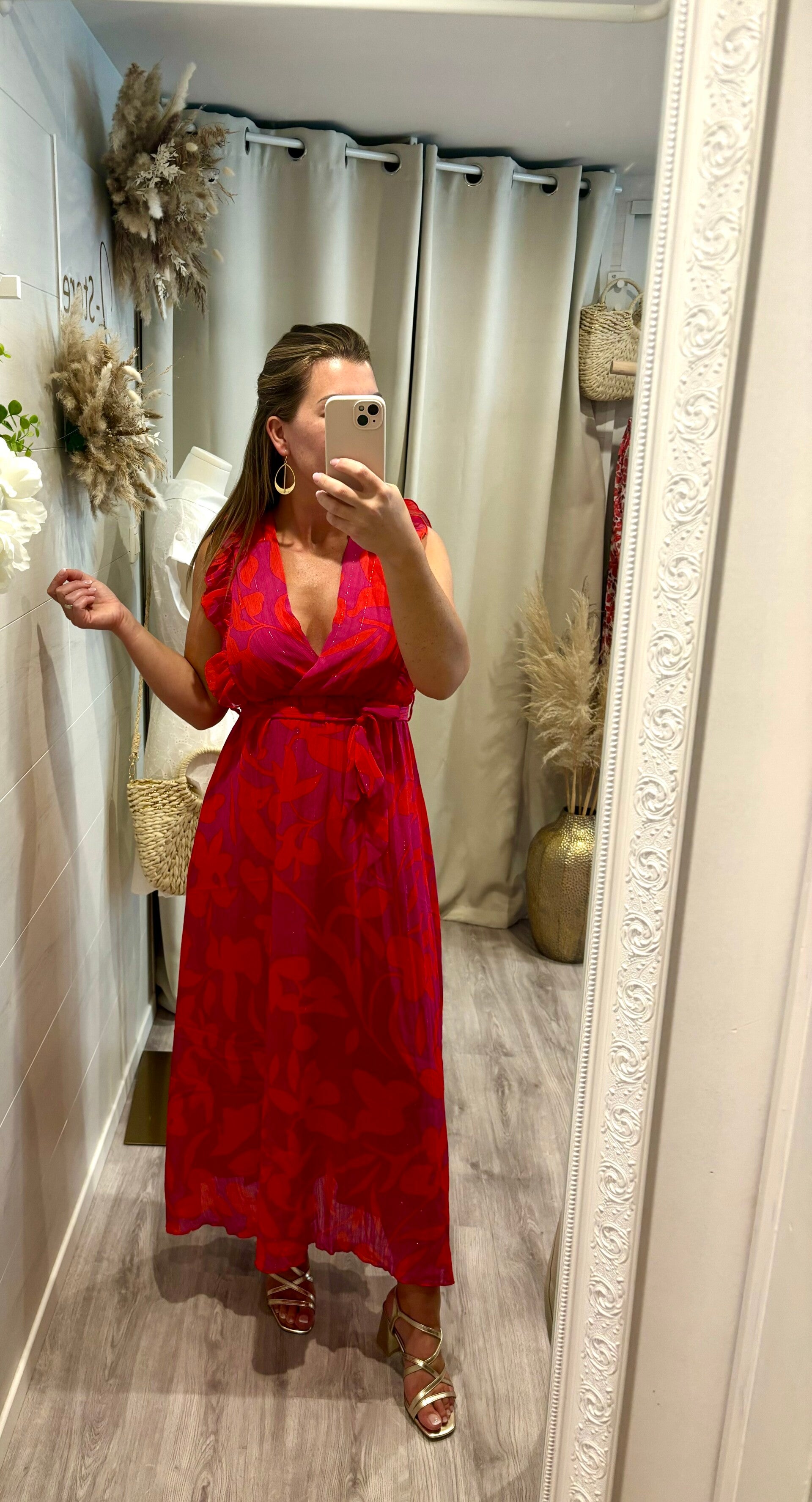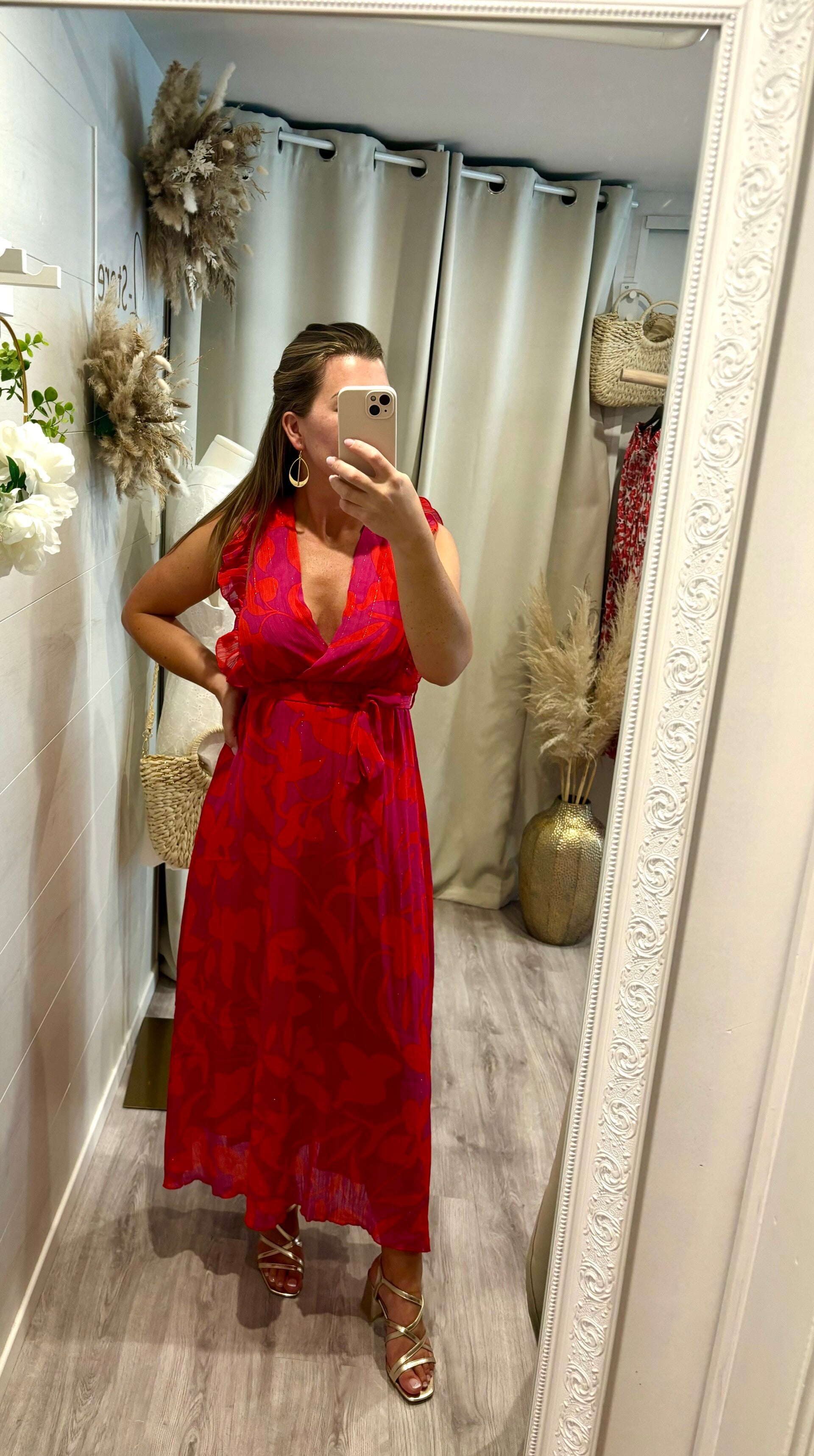 Longue robe élégante avec son décolleté effet voilé et ses petites touches brillantes. Aux couleurs rayonnantes : orange & fushia.