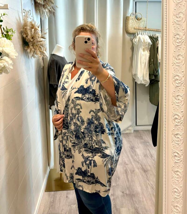 kimono chic & élégant avec sa matière satinée et ses imprimés marine/ écru.* composition : 80% viscose et 20% seta