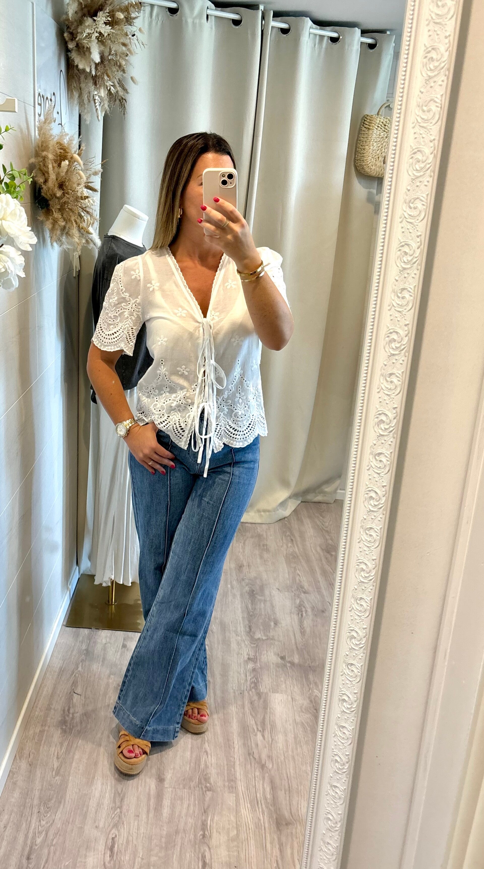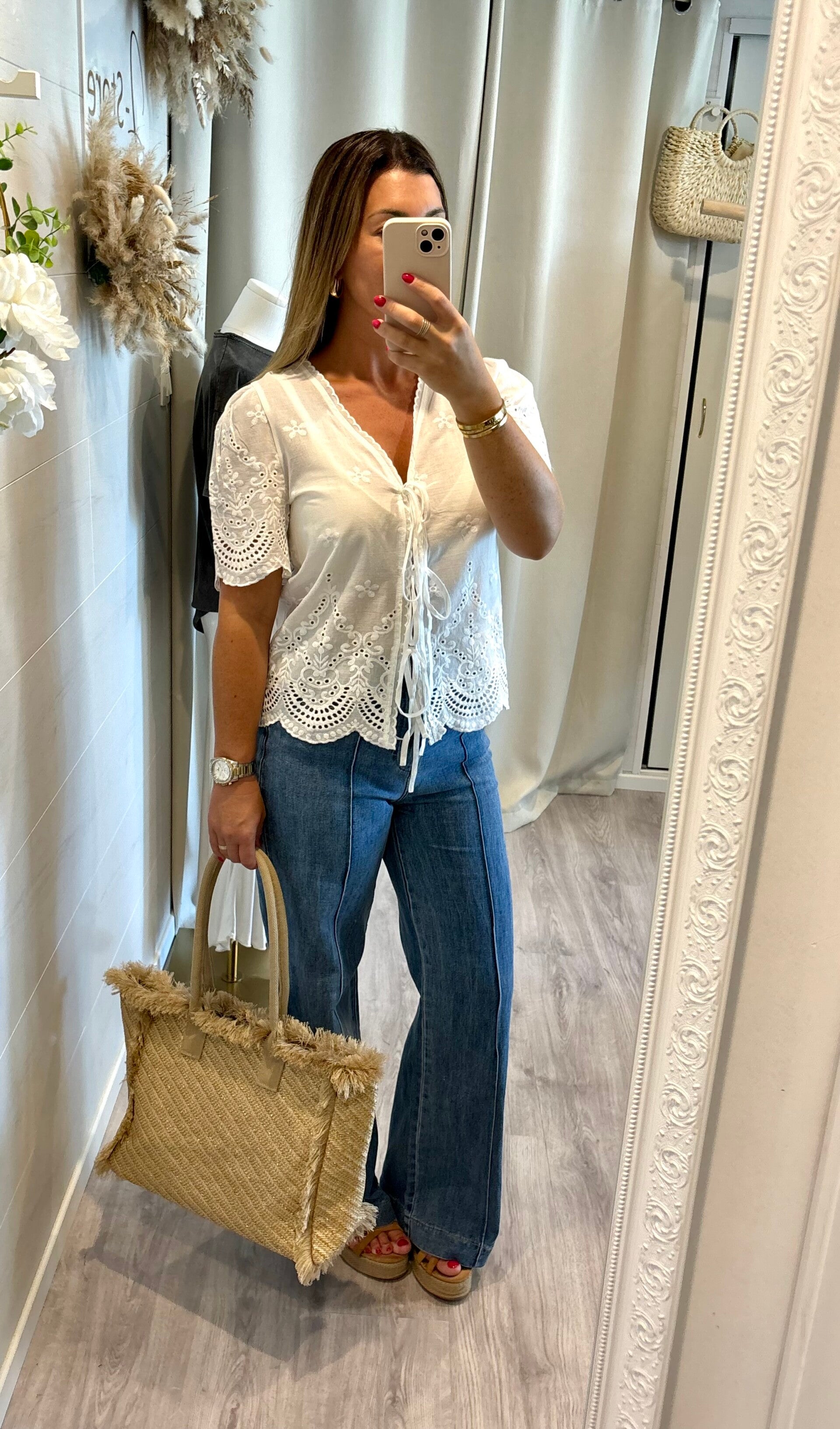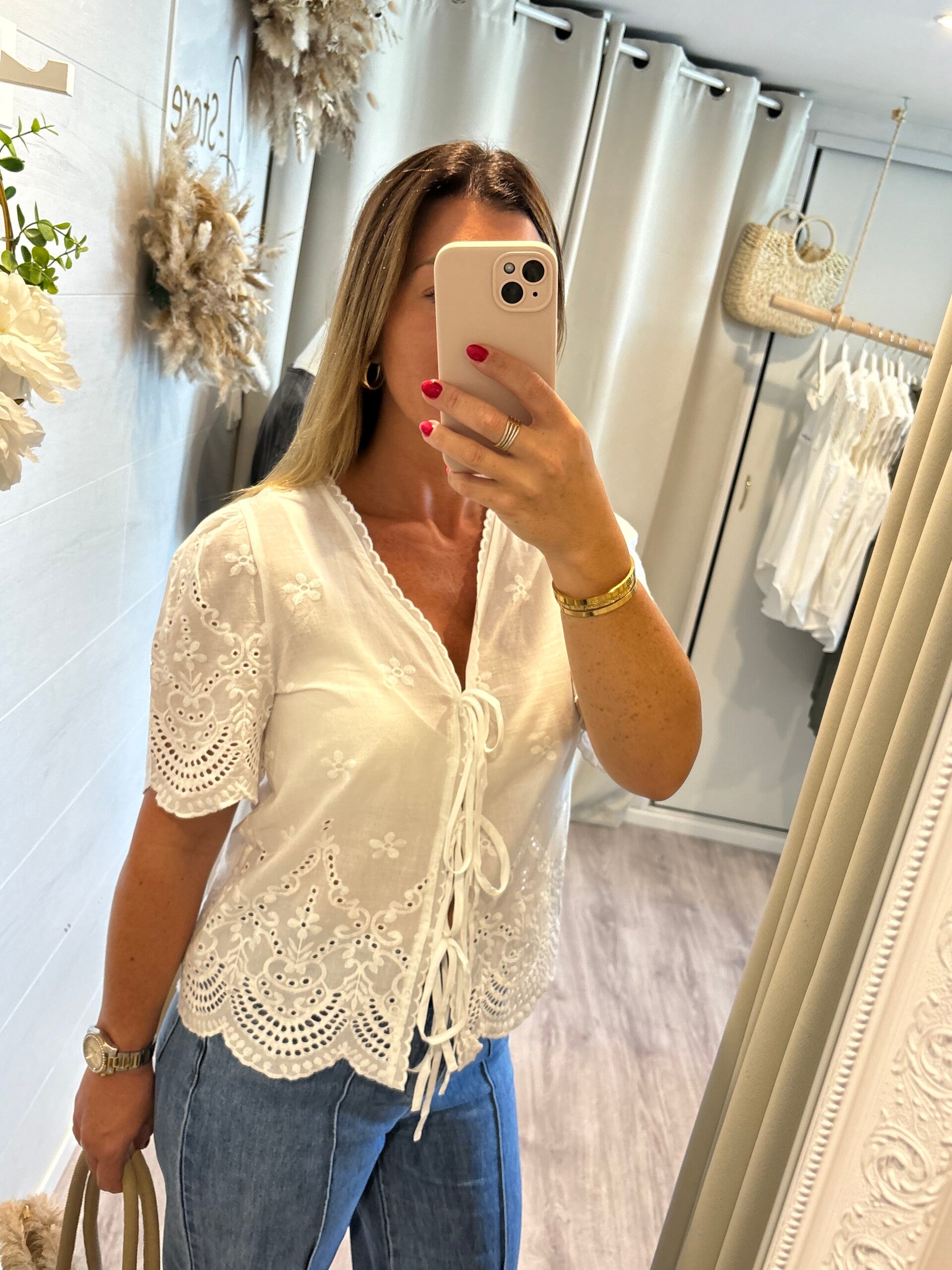 La voici de retour pour un effet plus doux avec sa broderie anglaise.