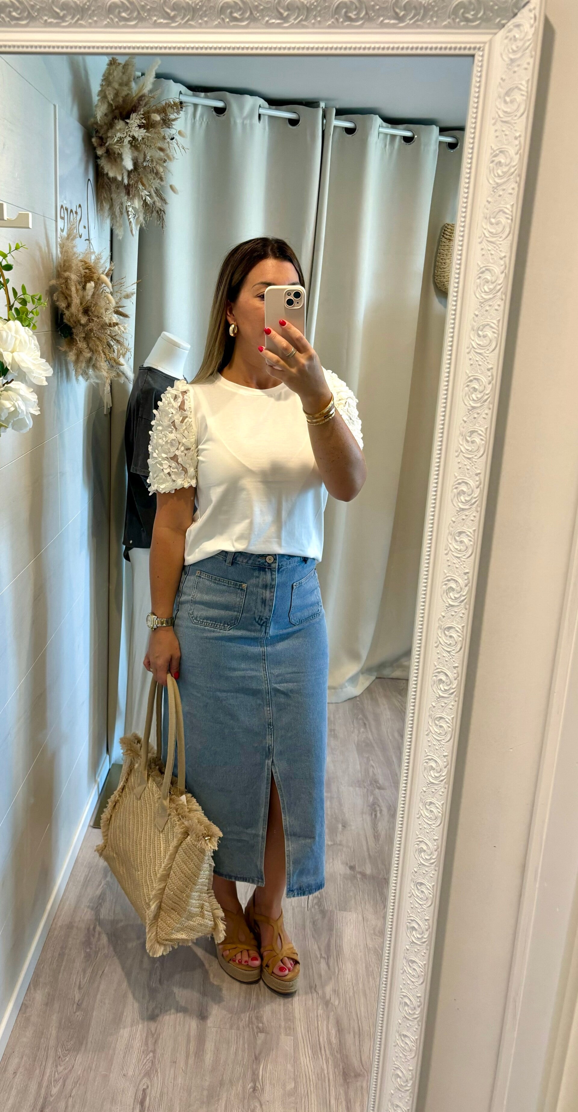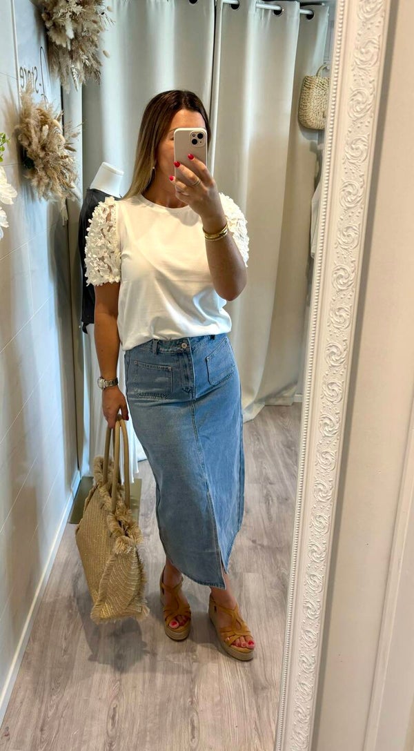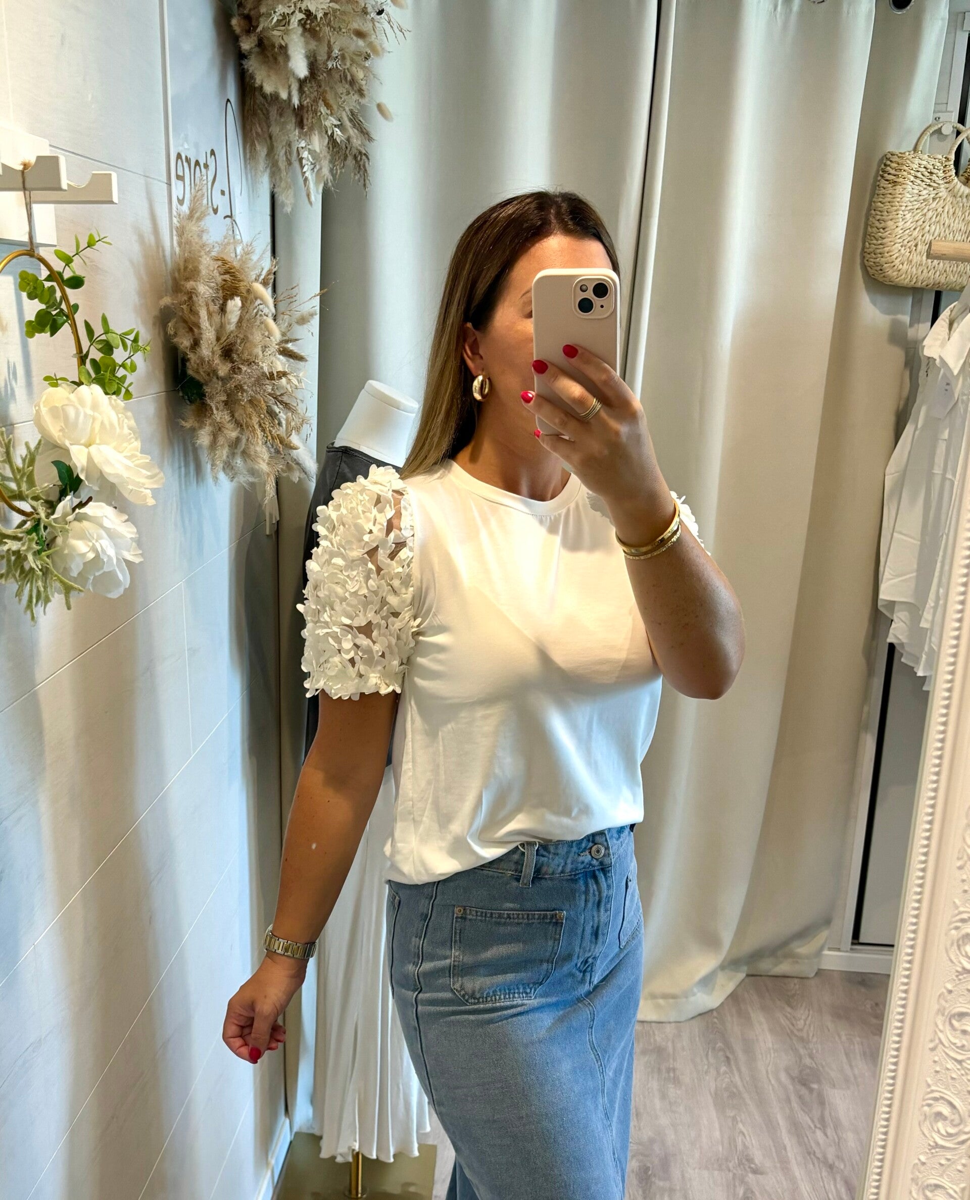 * manches légèrement bouffantes en tulles ornées de fleurs en tissus.