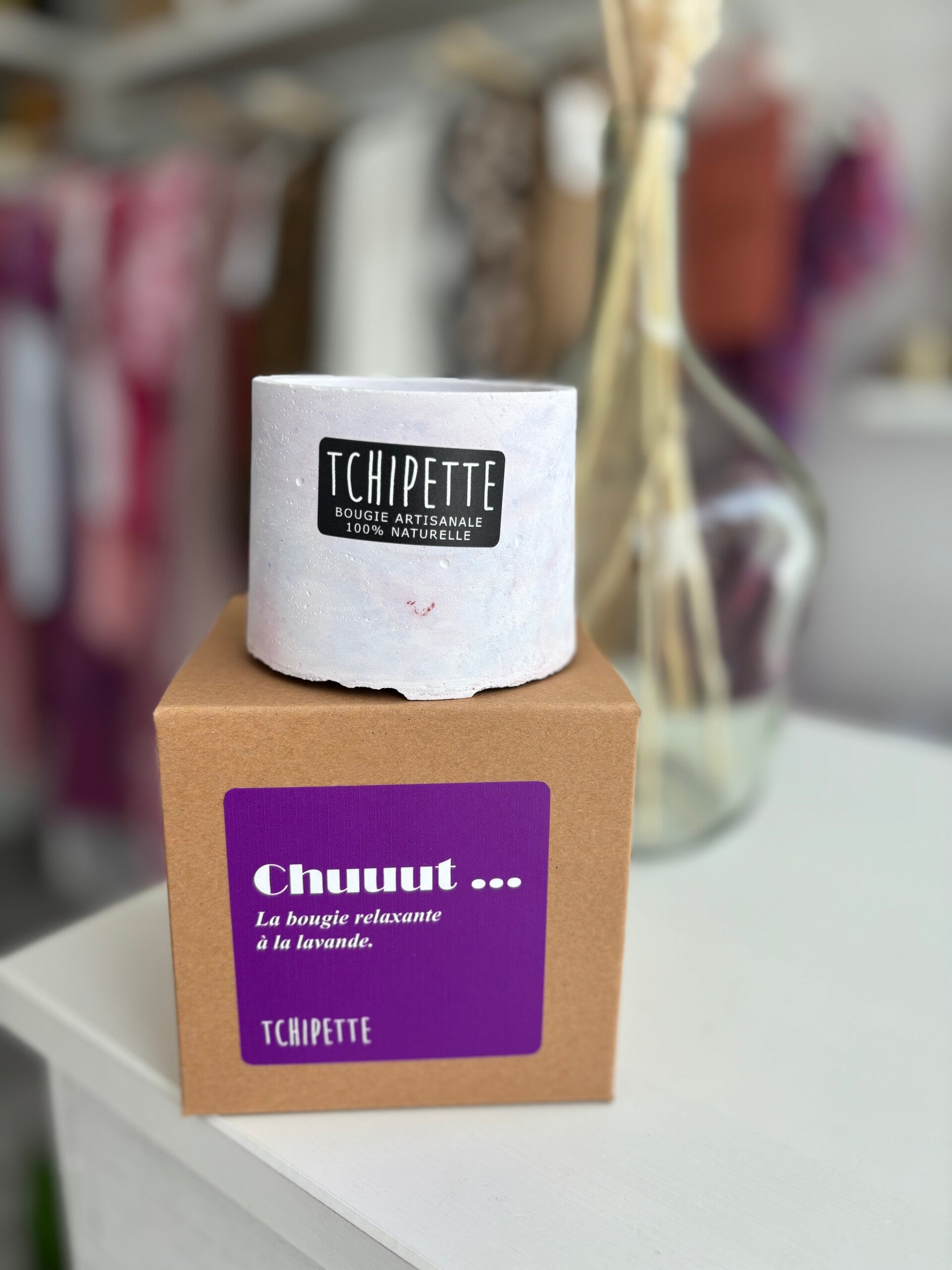 Bougie 100% naturelle de la créatrice Belge TCHIPETTE , en béton coloré qui se décline en plusieurs modèles .