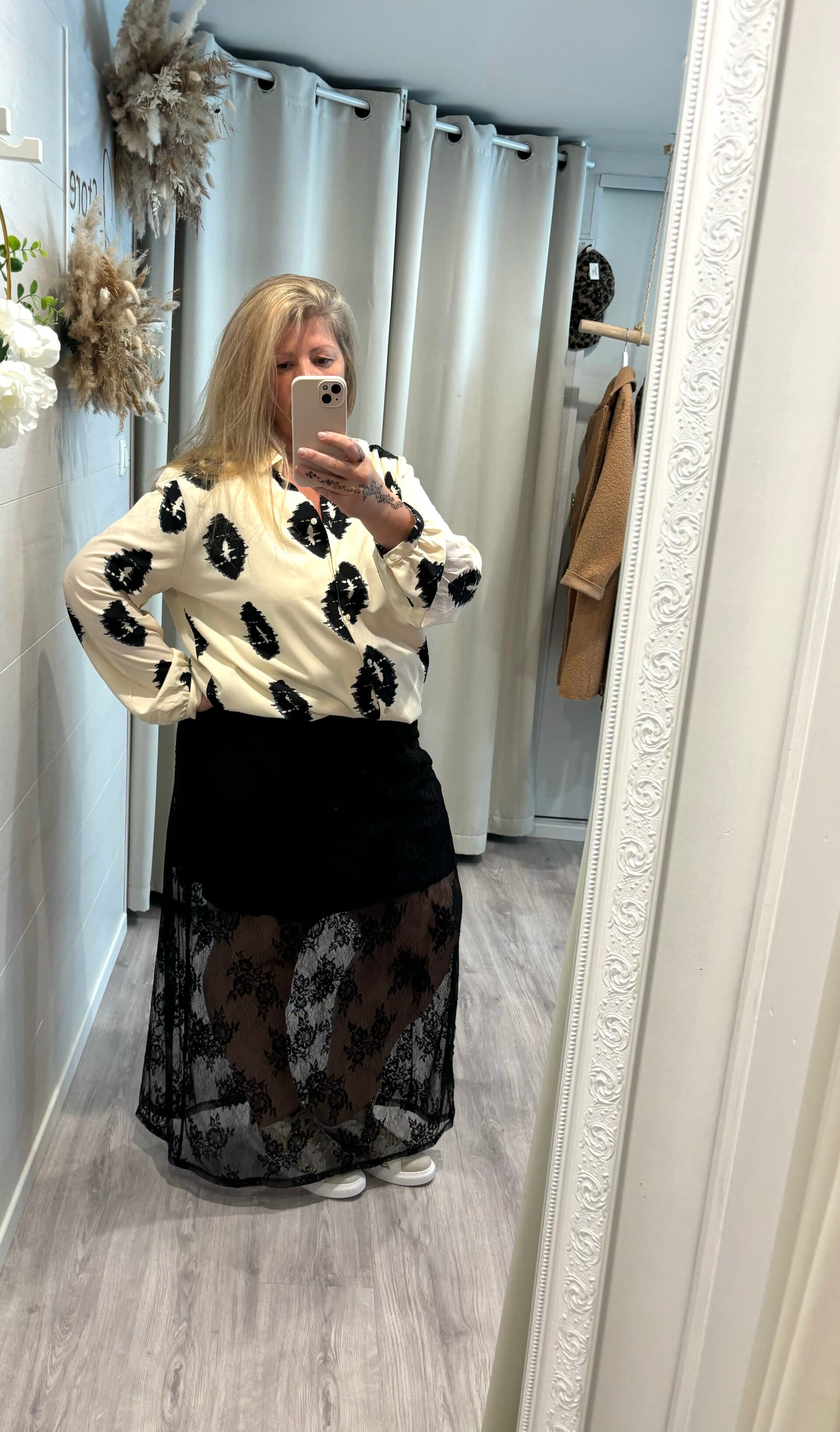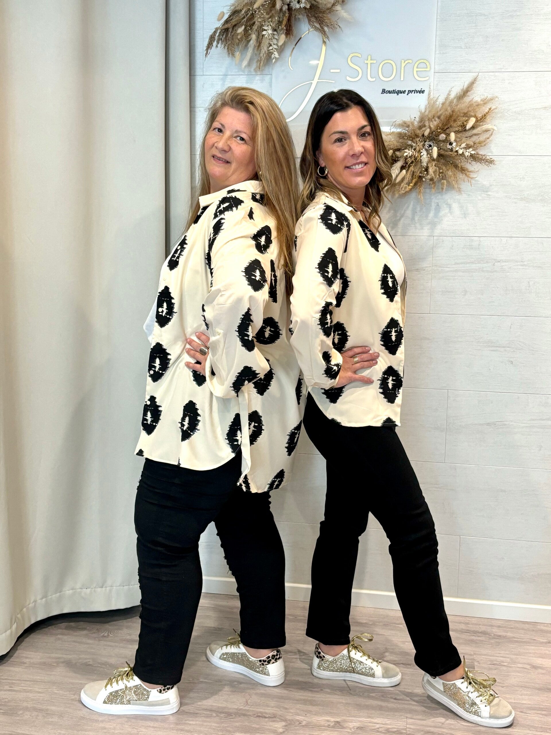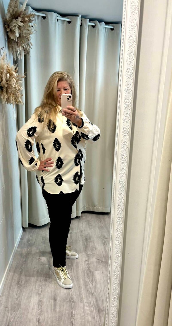 Ce chemisier reste une pièce classique et originale avec son imprimé , noir & écru .