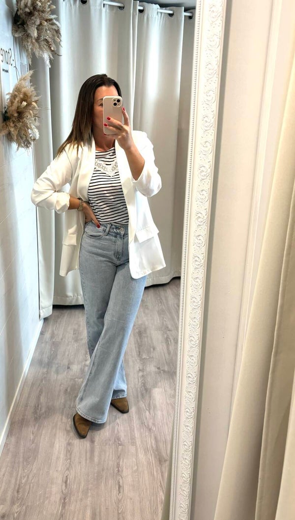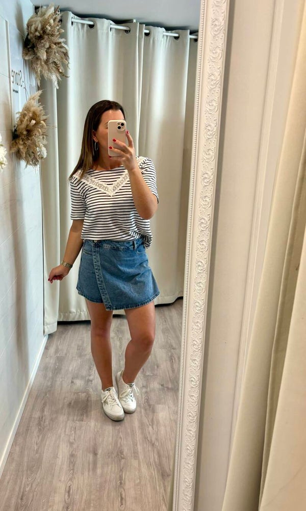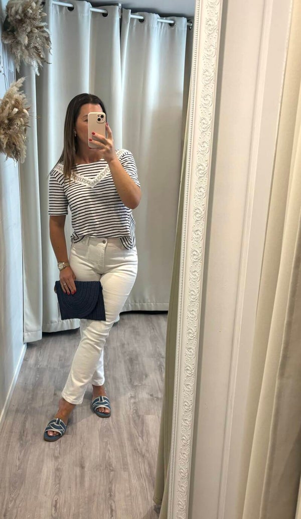 On craque pour ce modèle de tee-shirt effet marinière, avec son détail en dentelle sur la poitrine et son dos croisé .