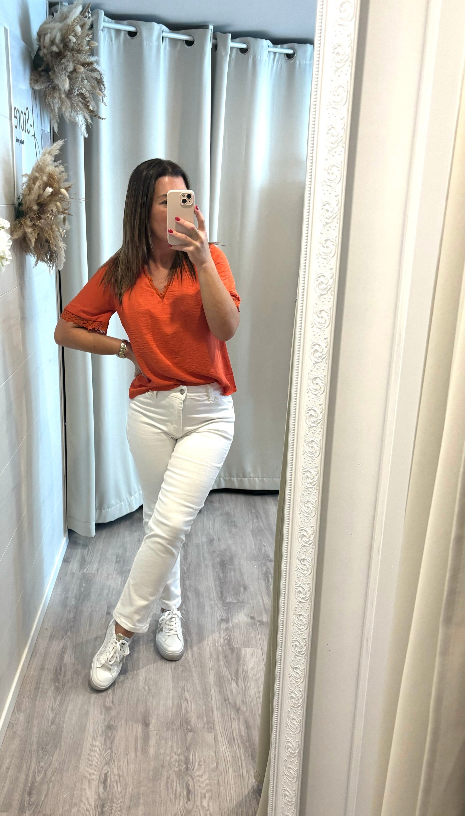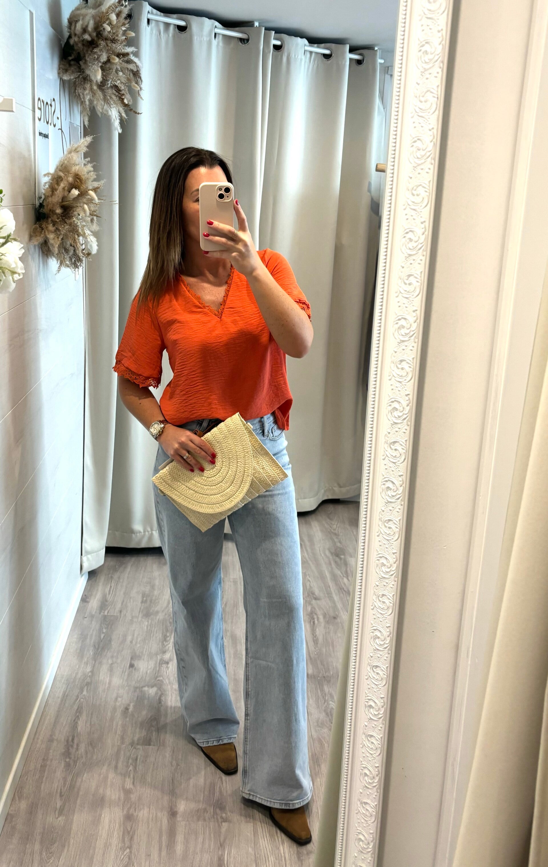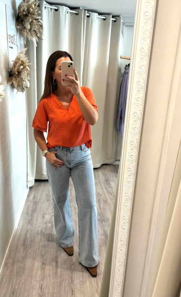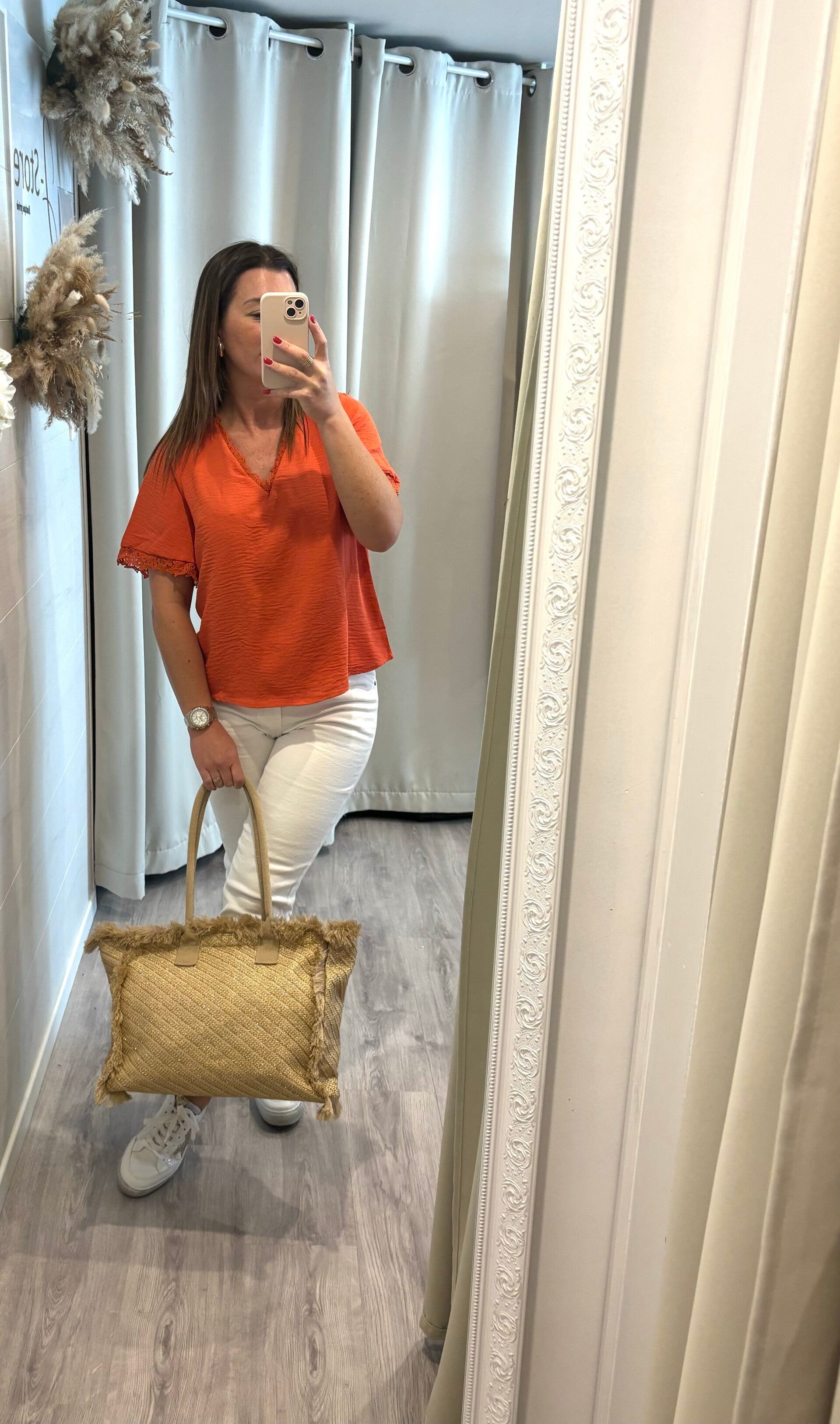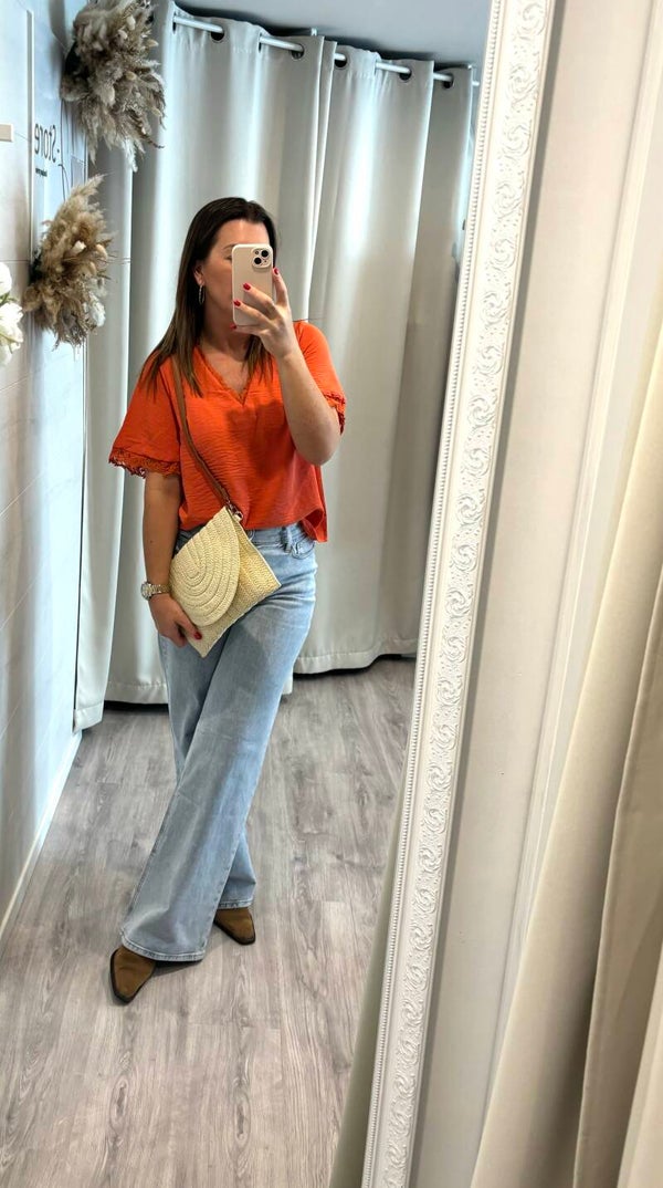 Petite blouse légère et élégante avec sa dentelle au bord des manches et de son encolure .