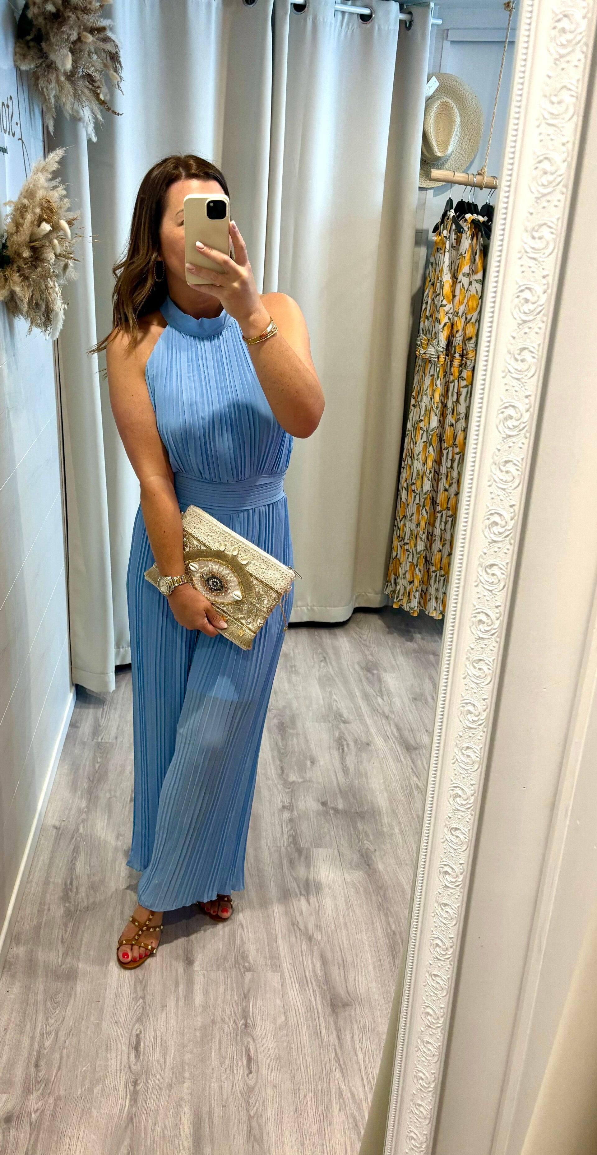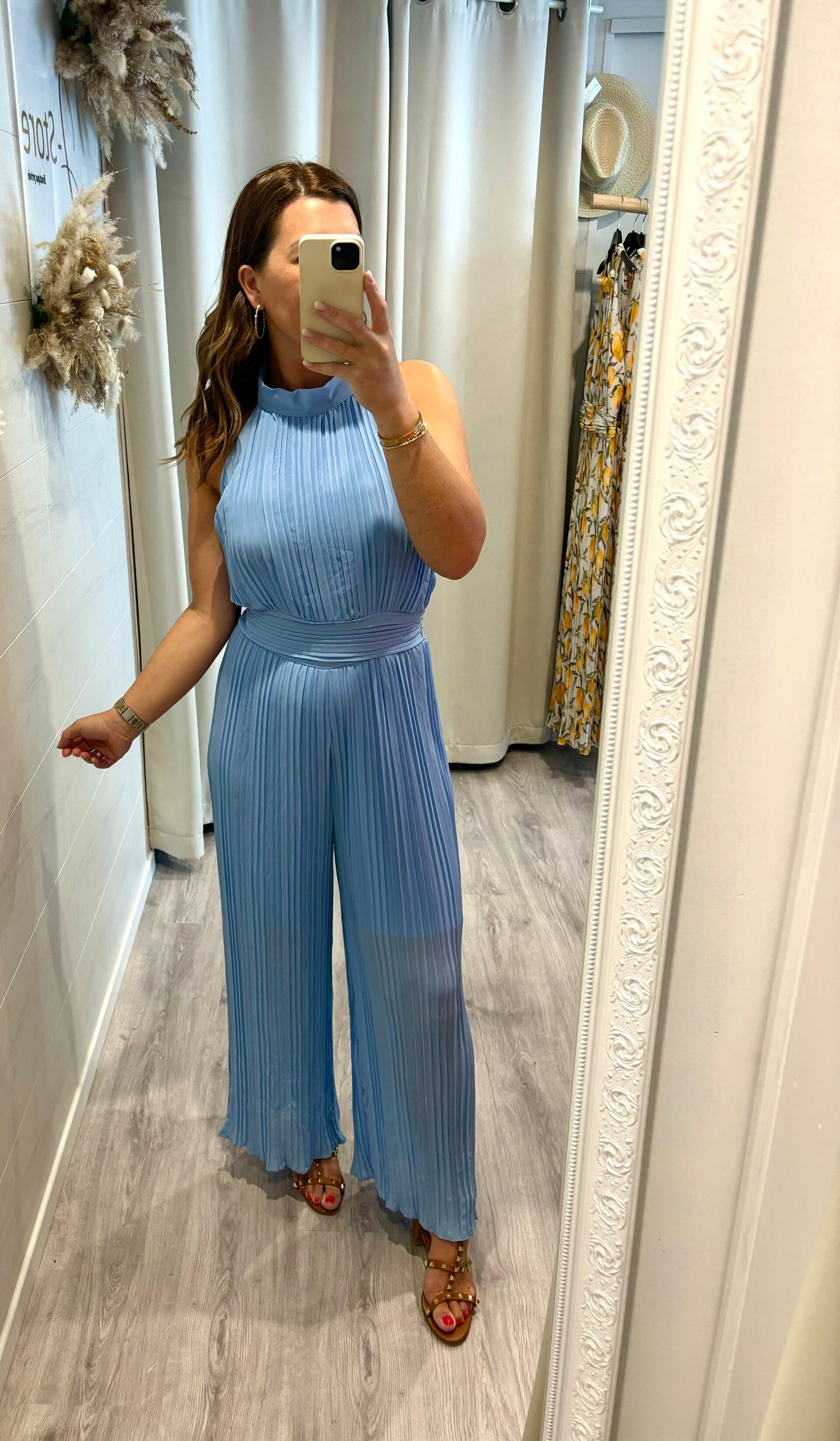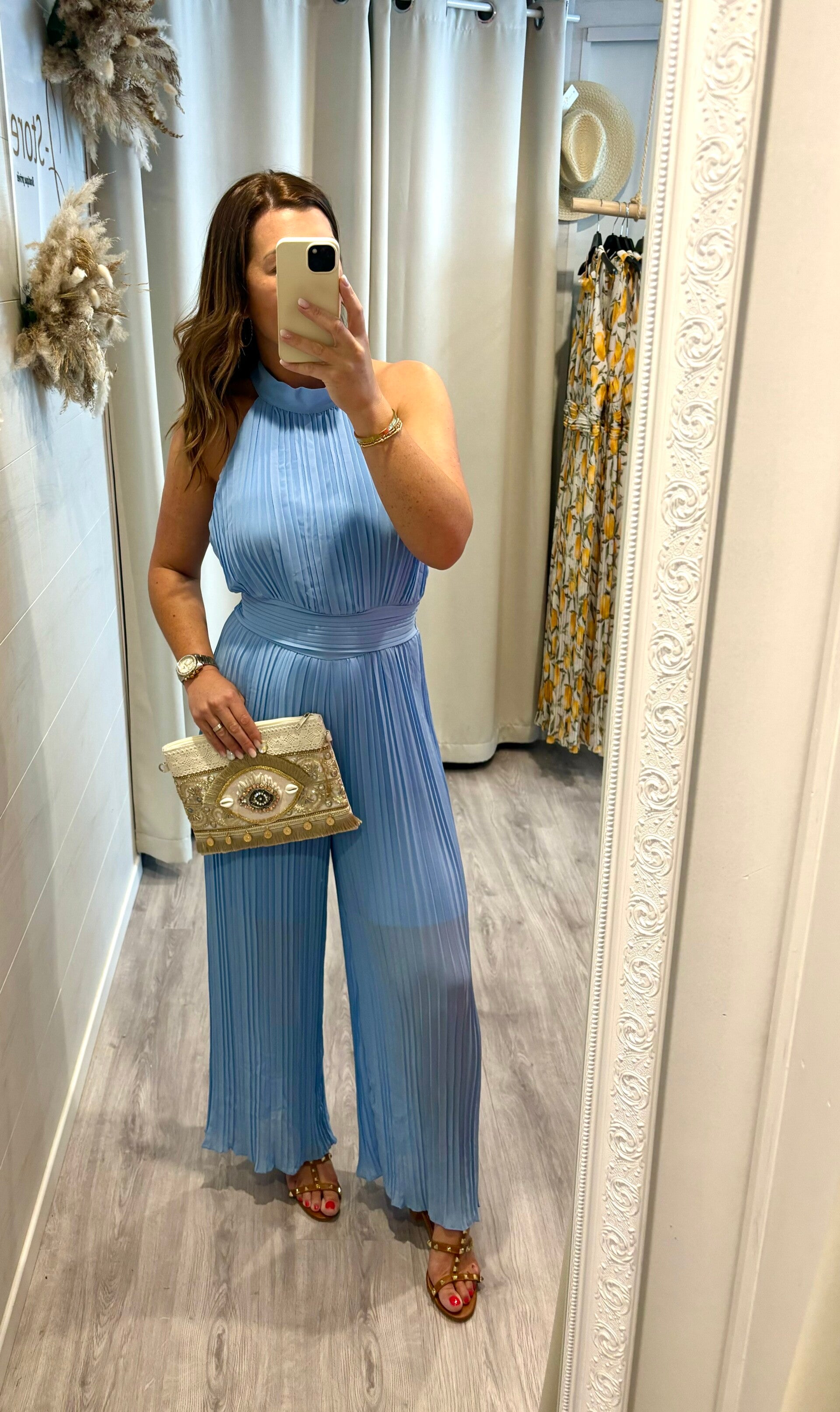 * combinaison fluide bleu ciel, serrée à la taille par un élastique et fermée dans le cou par 2 boutons.