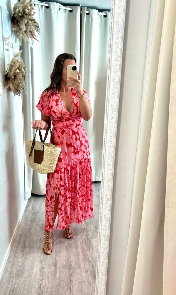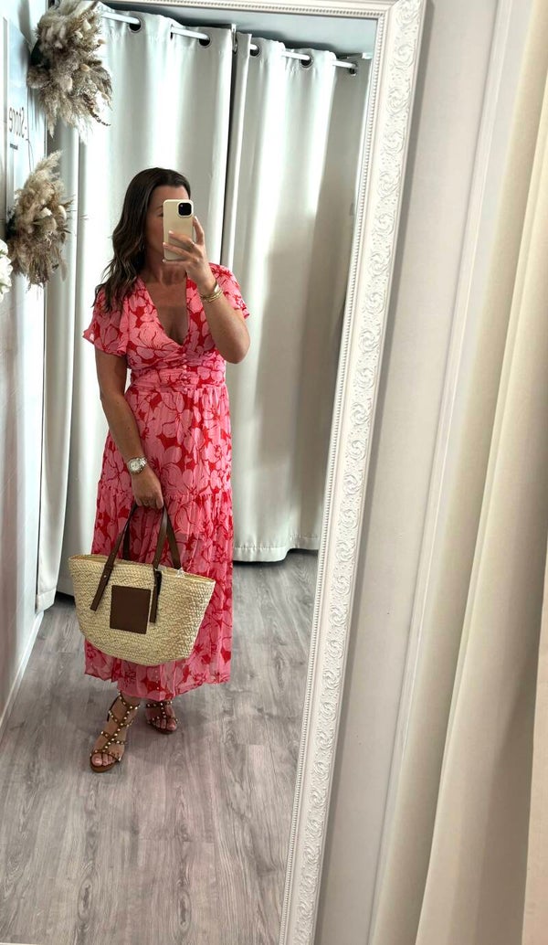Longue robe fluide aux impriés rose & rouge qui donnera un aspect chic et élégant grâce à son dos nu.