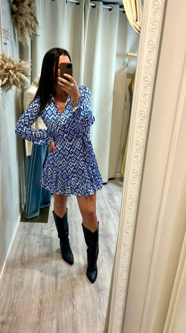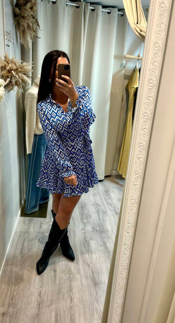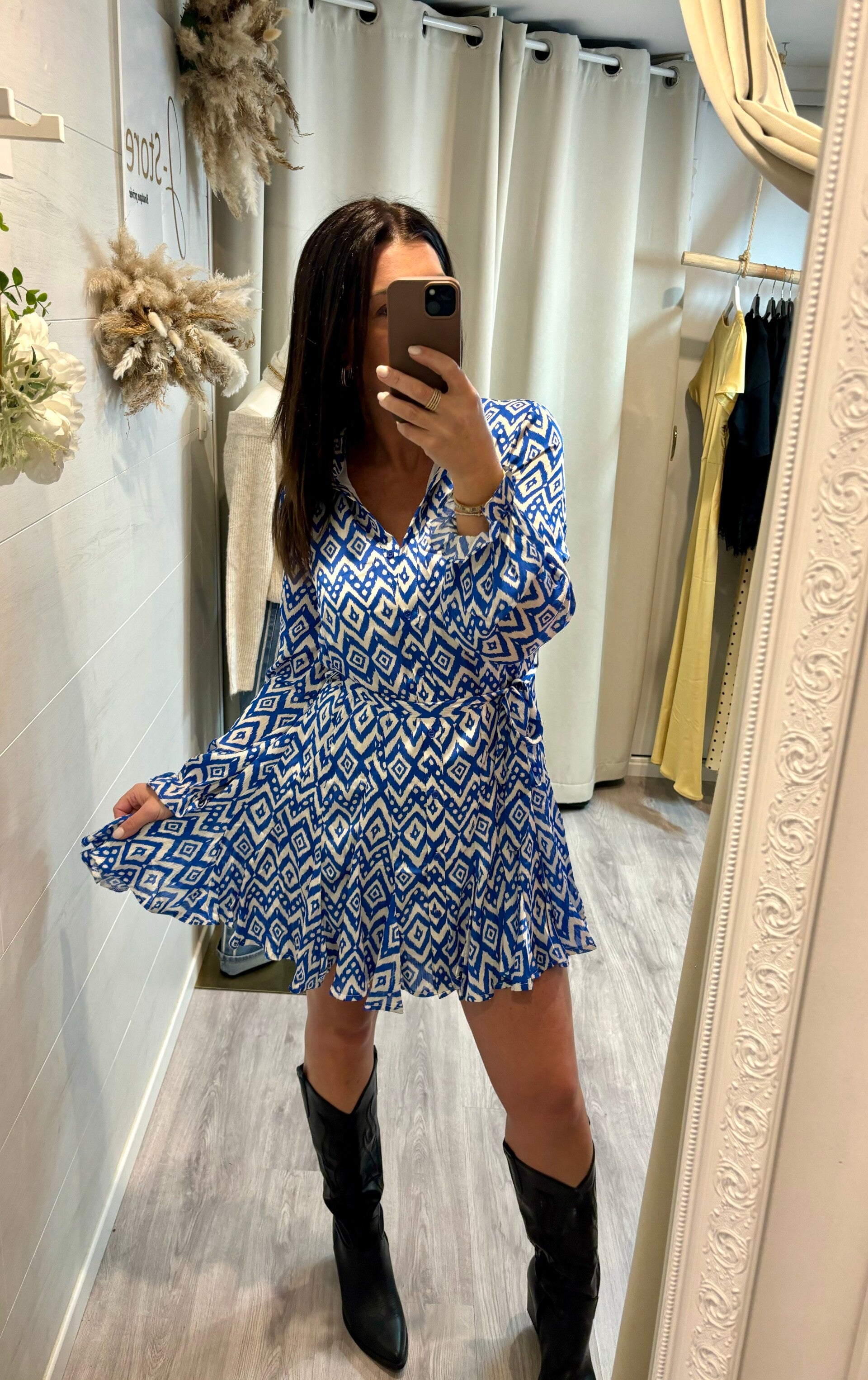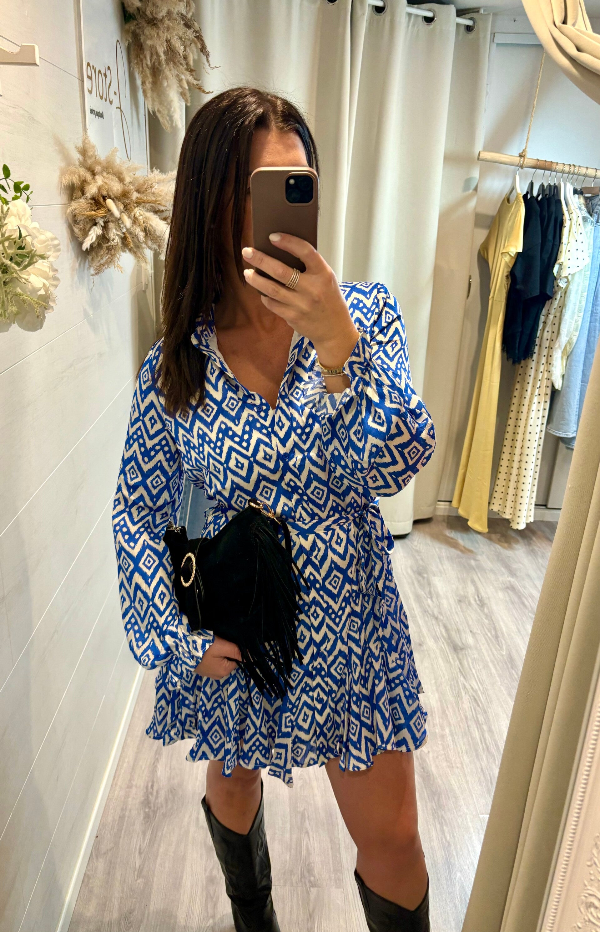 Succombez au charme de notre robe courte fluide, aux teintes bleu et blanc éclatantes. Légère et élégante, elle danse avec vous à chaque pas. Parfaite pour vos journées ensoleillées comme vos soirées.