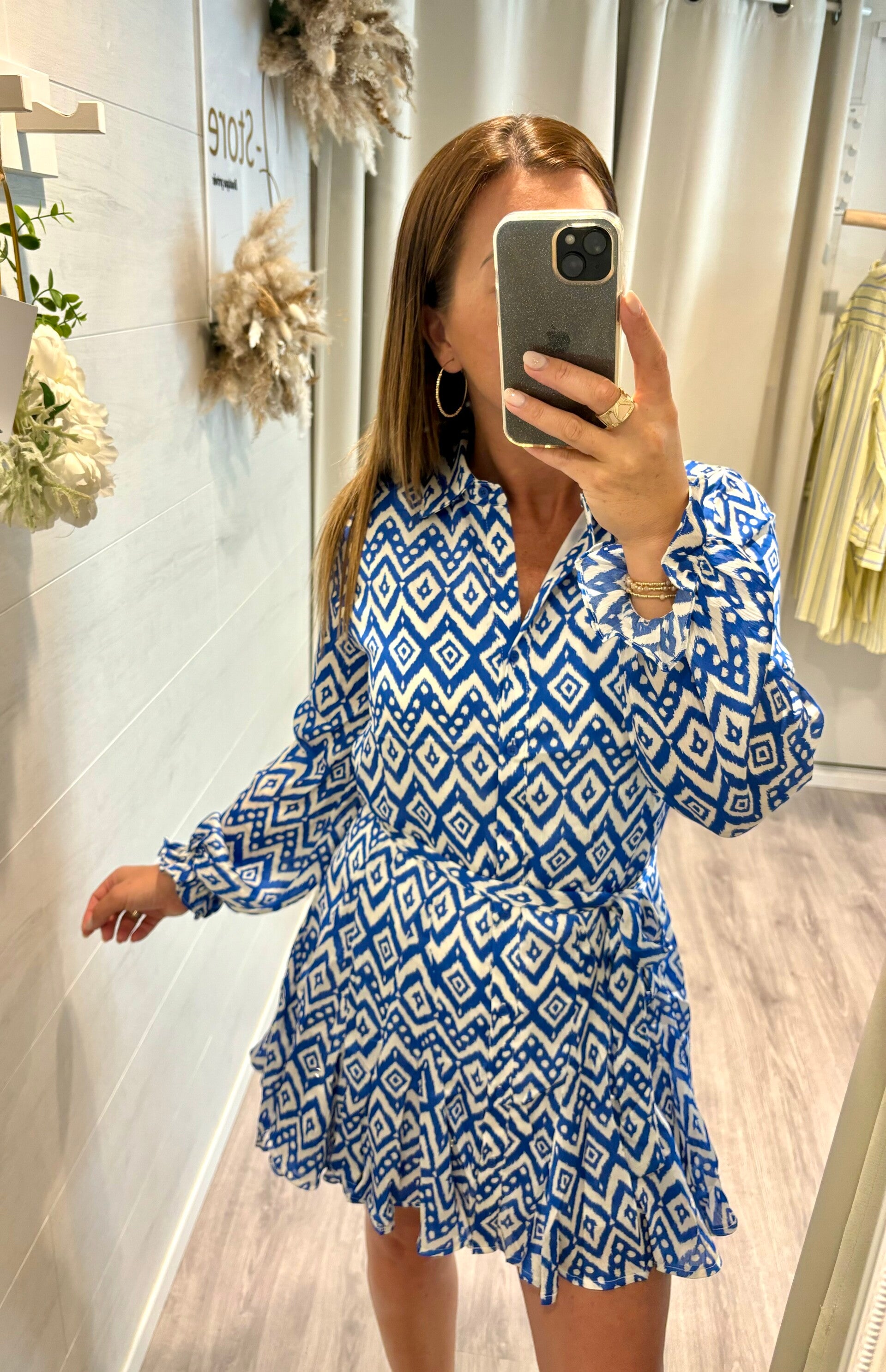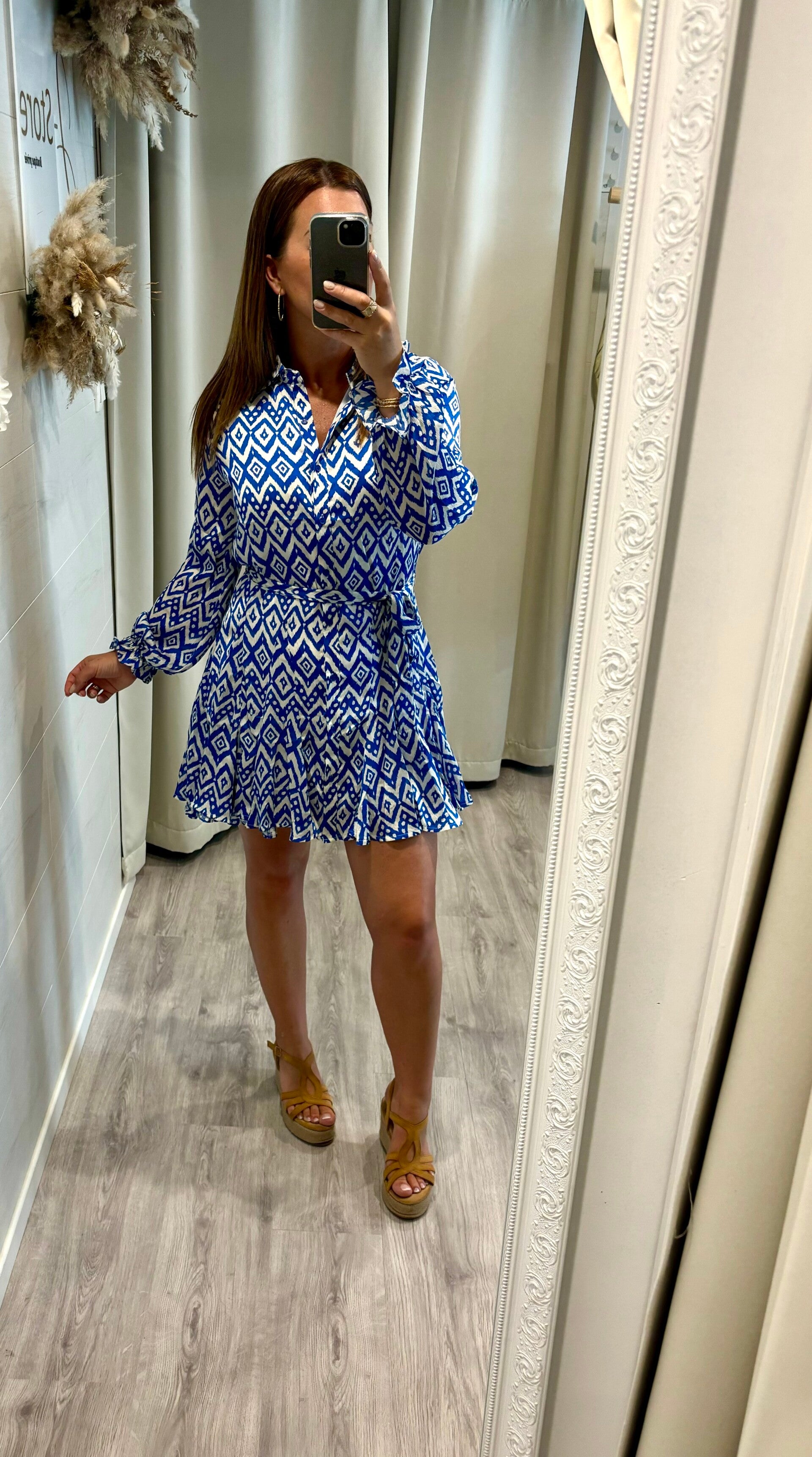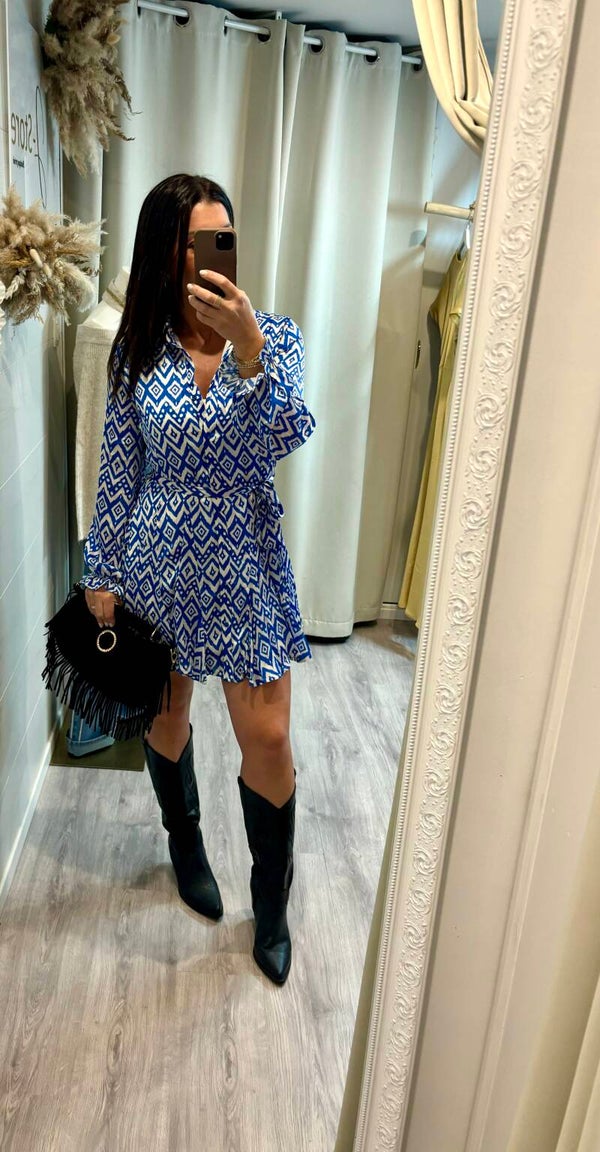 Succombez au charme de notre robe courte fluide, aux teintes bleu et blanc éclatantes. Légère et élégante, elle danse avec vous à chaque pas. Parfaite pour vos journées ensoleillées comme vos soirées.