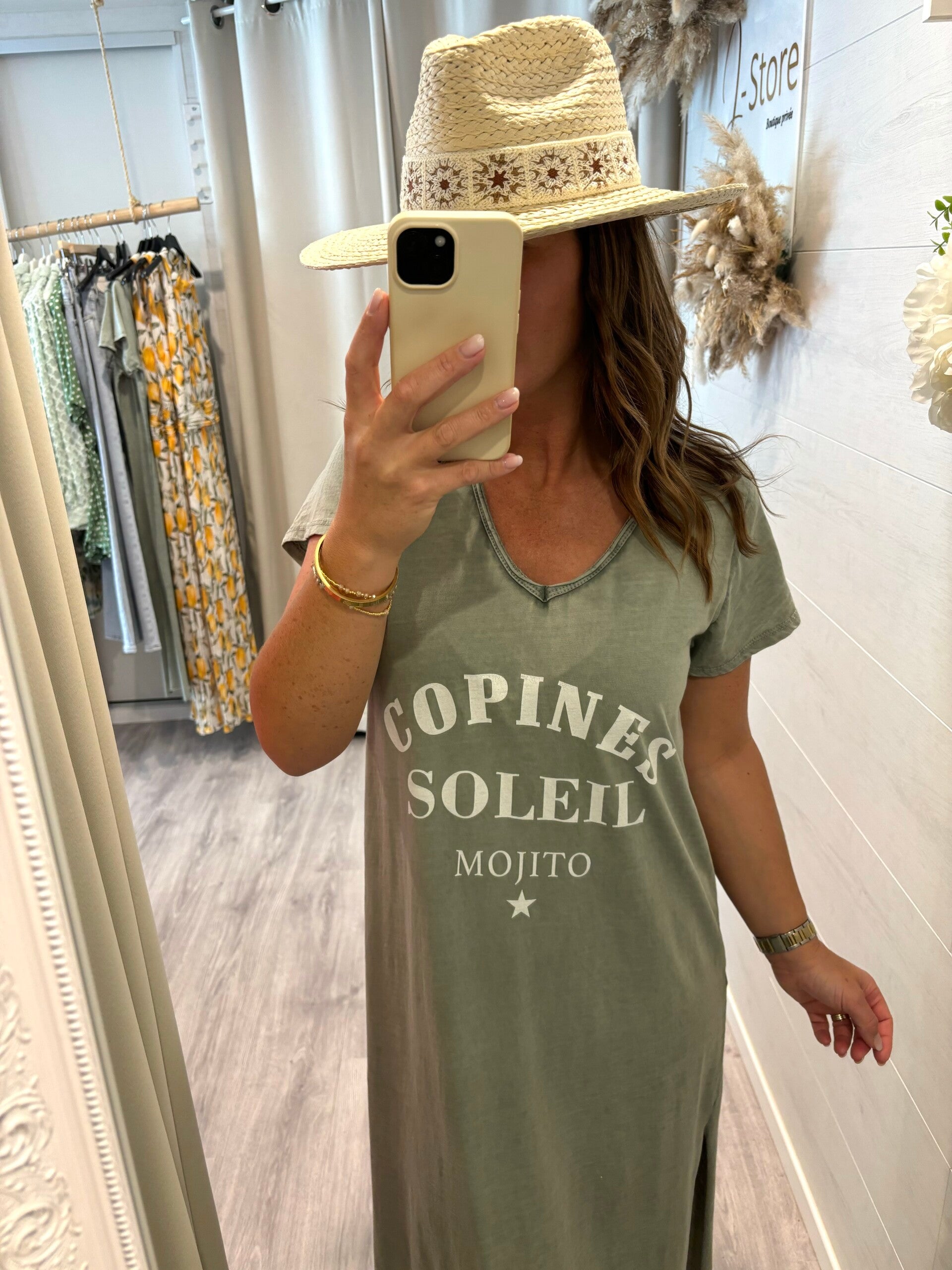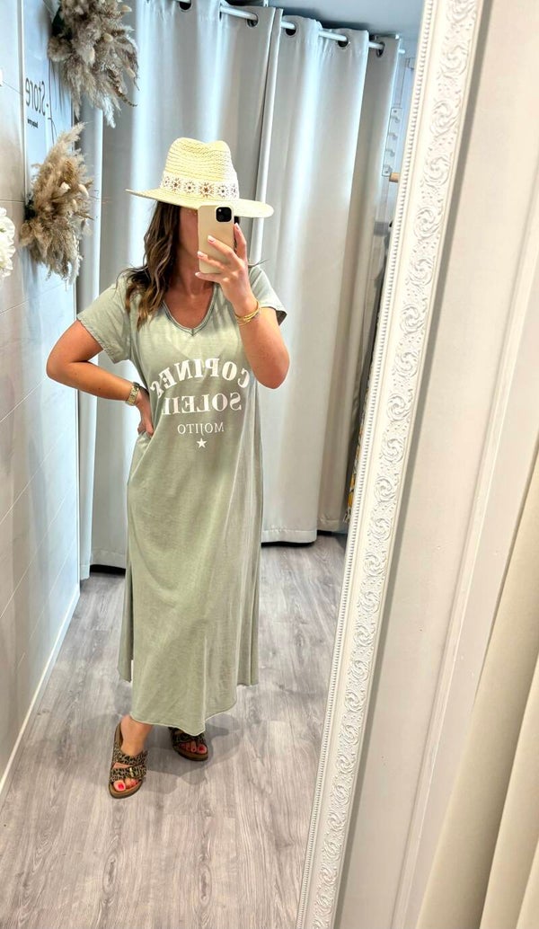 Longue robe décontractée avec message sympa — confort et bonnes vibes au rendez-vous.