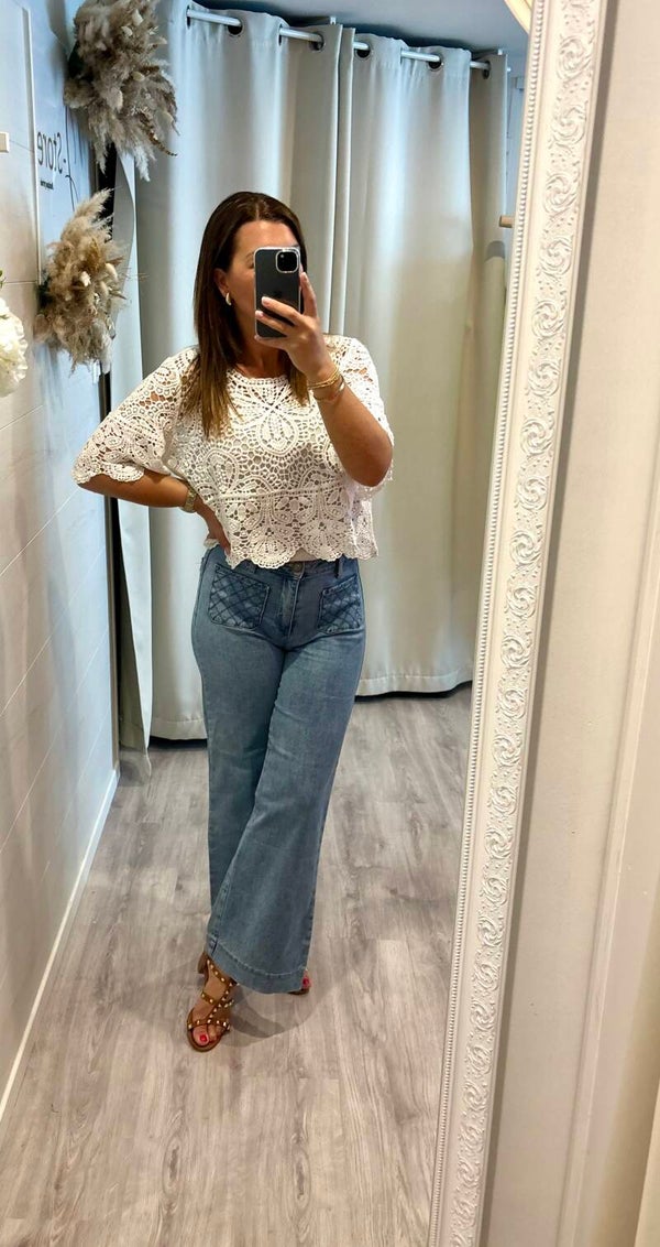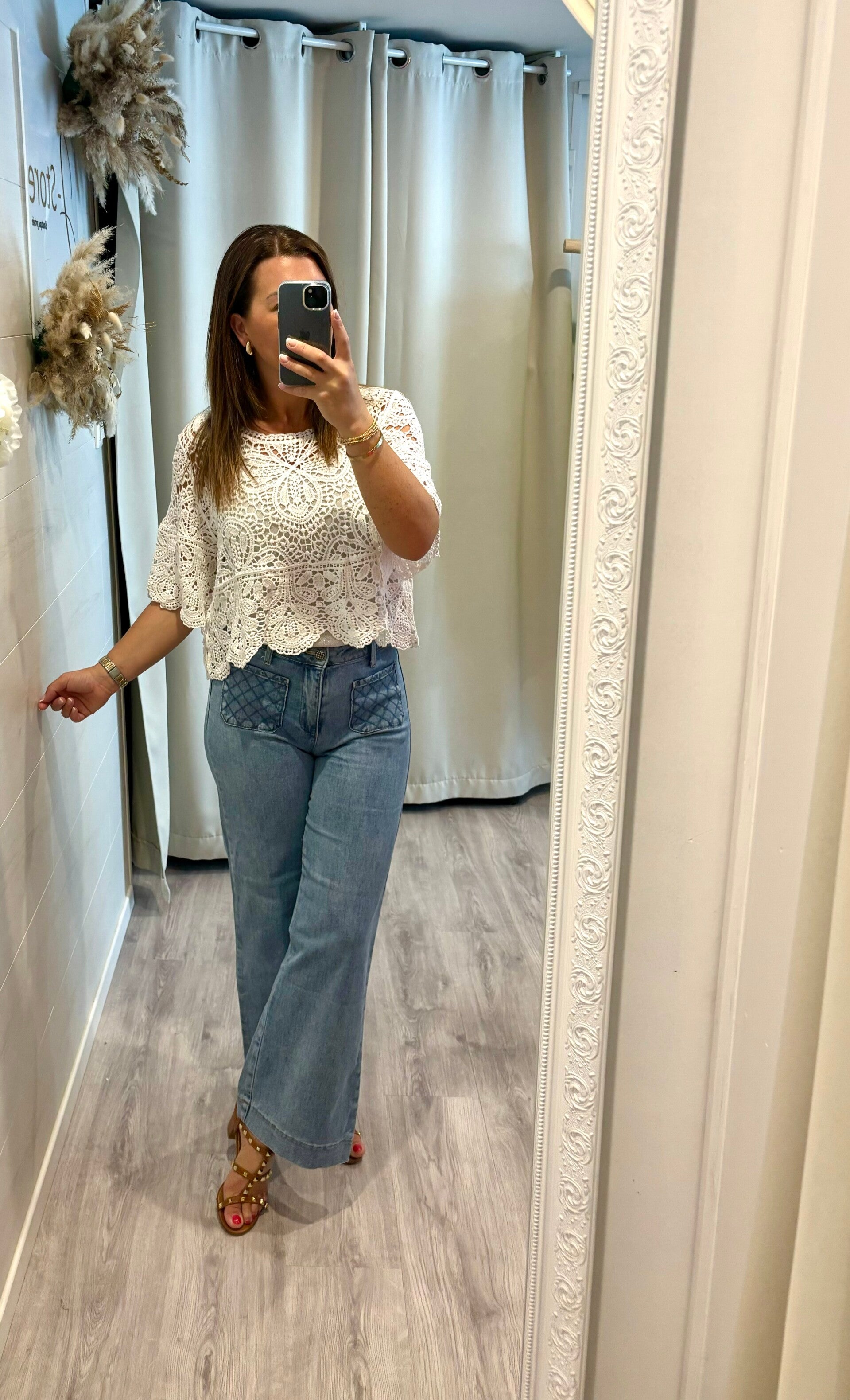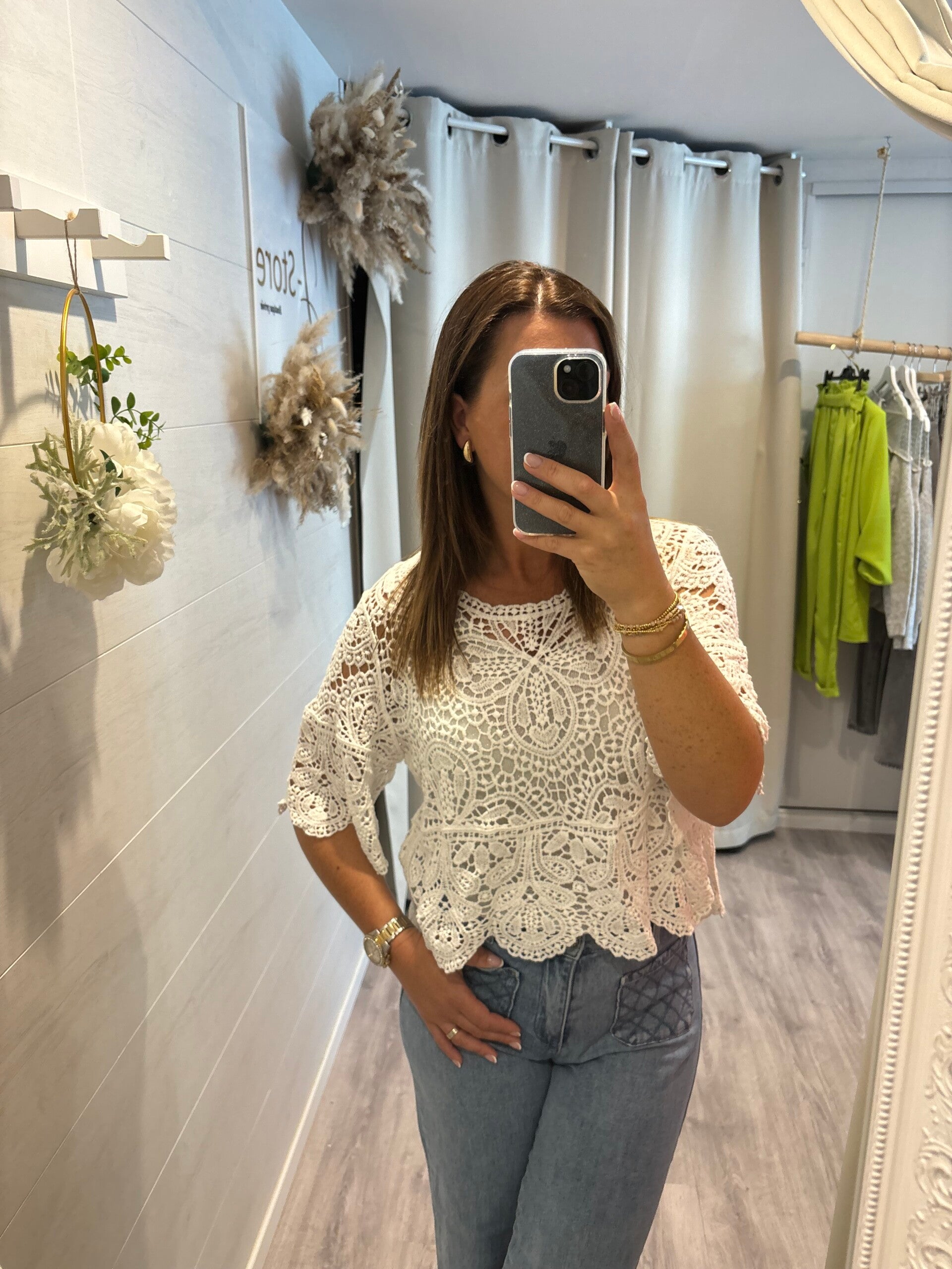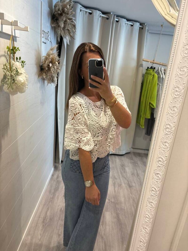 Légère, bohème et délicatement travaillée, notre blouse en crochet blanc sublime vos journées ensoleillées. Avec ses petites manches et ses détails raffinés, elle est parfaite pour un look chic et décontracté. À porter sans modération.
