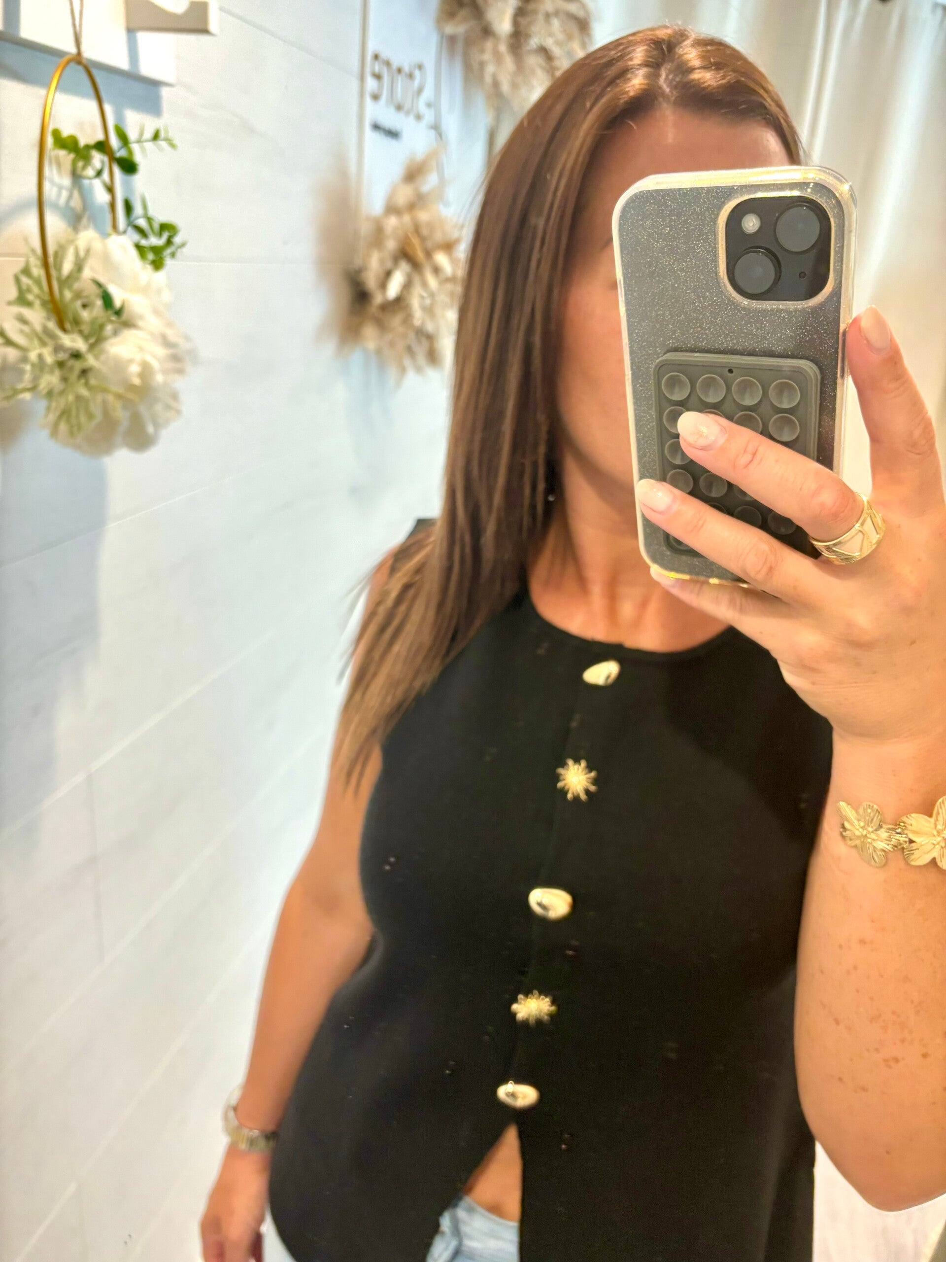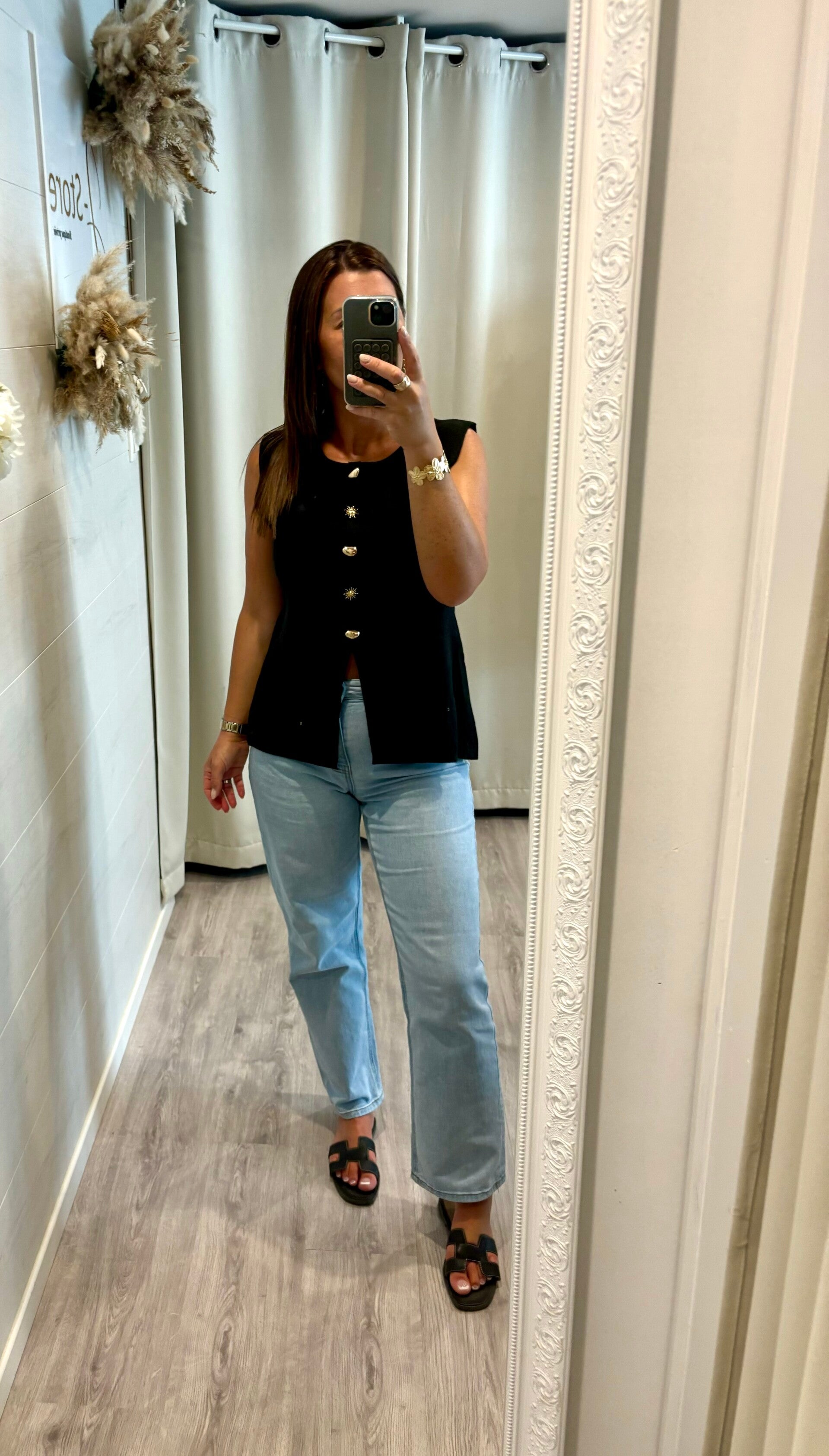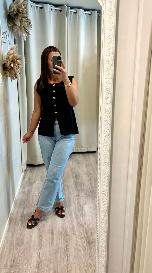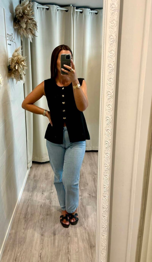 Ce gilet noir iconique, rehaussé de boutons dorés façon soleil, illumine vos looks en un clin d’œil.