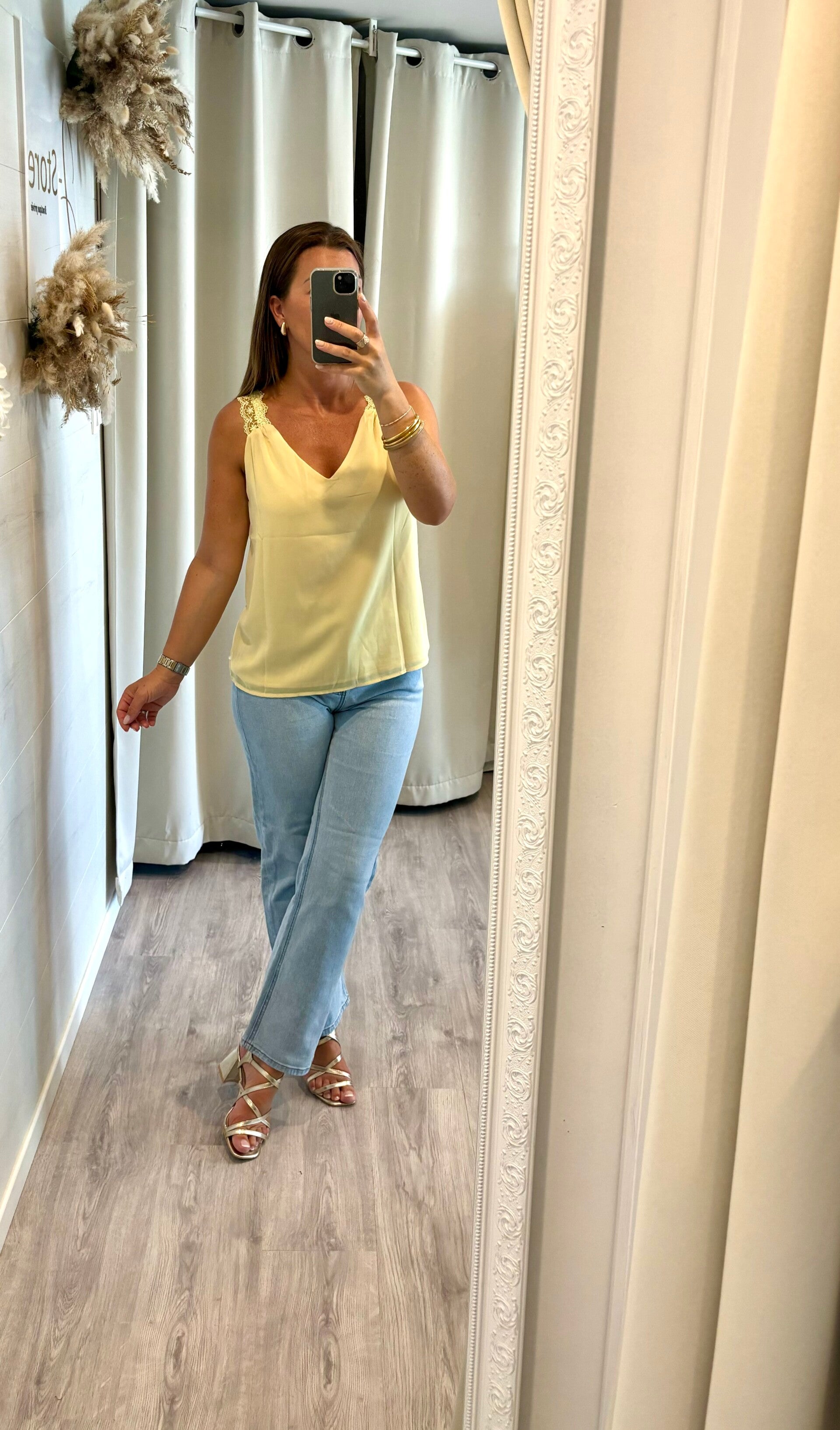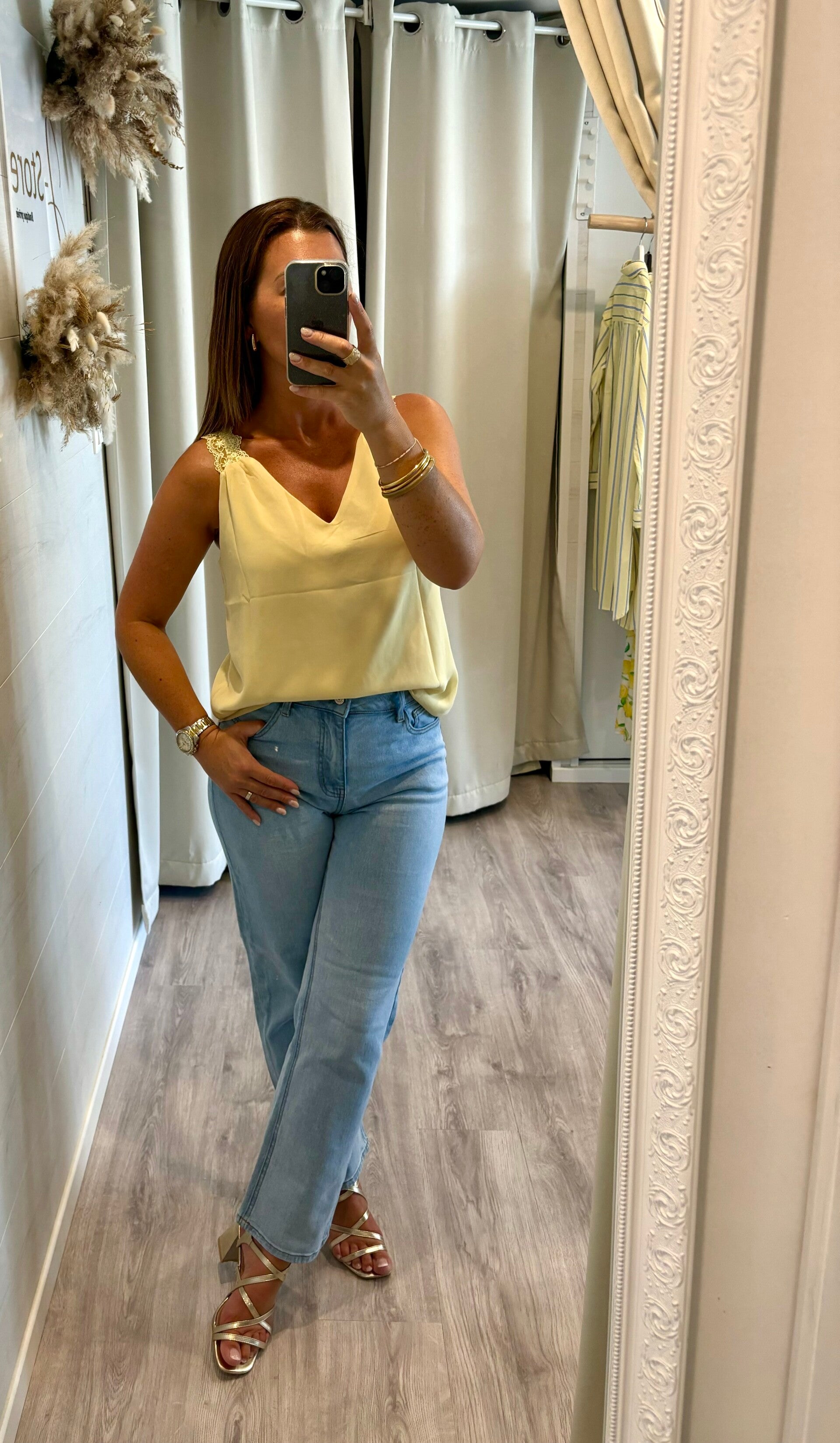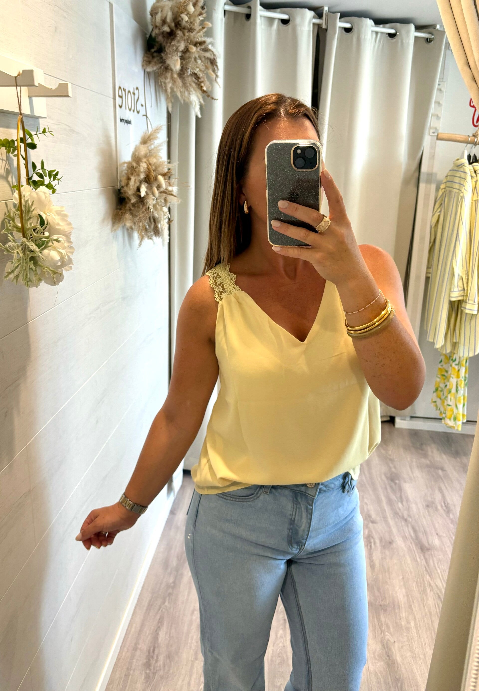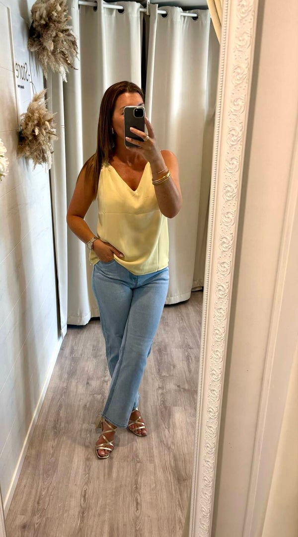 Élégante sans en faire trop, cette blouse jaune sans manches séduit par son encolure en dentelle délicate.