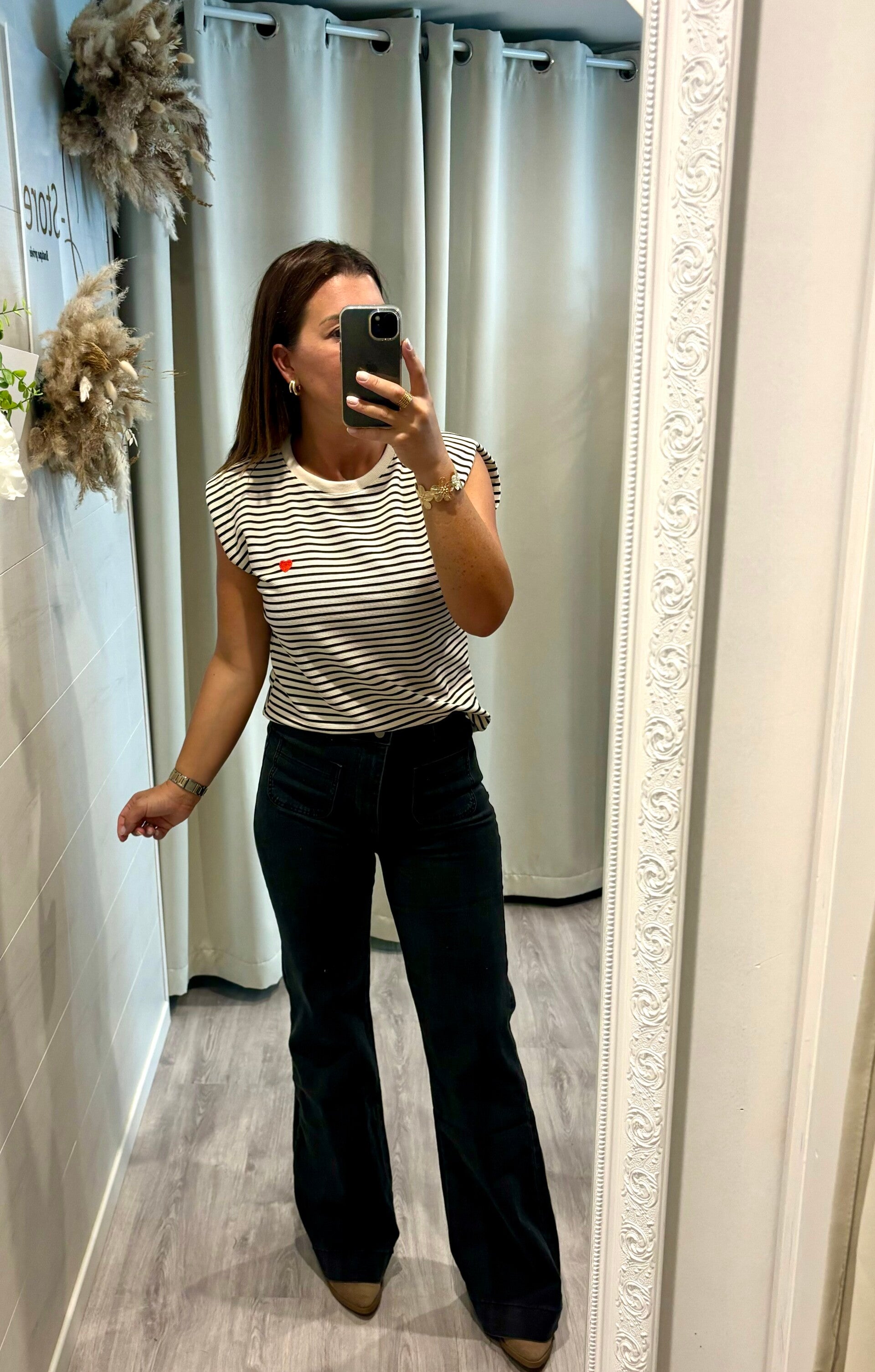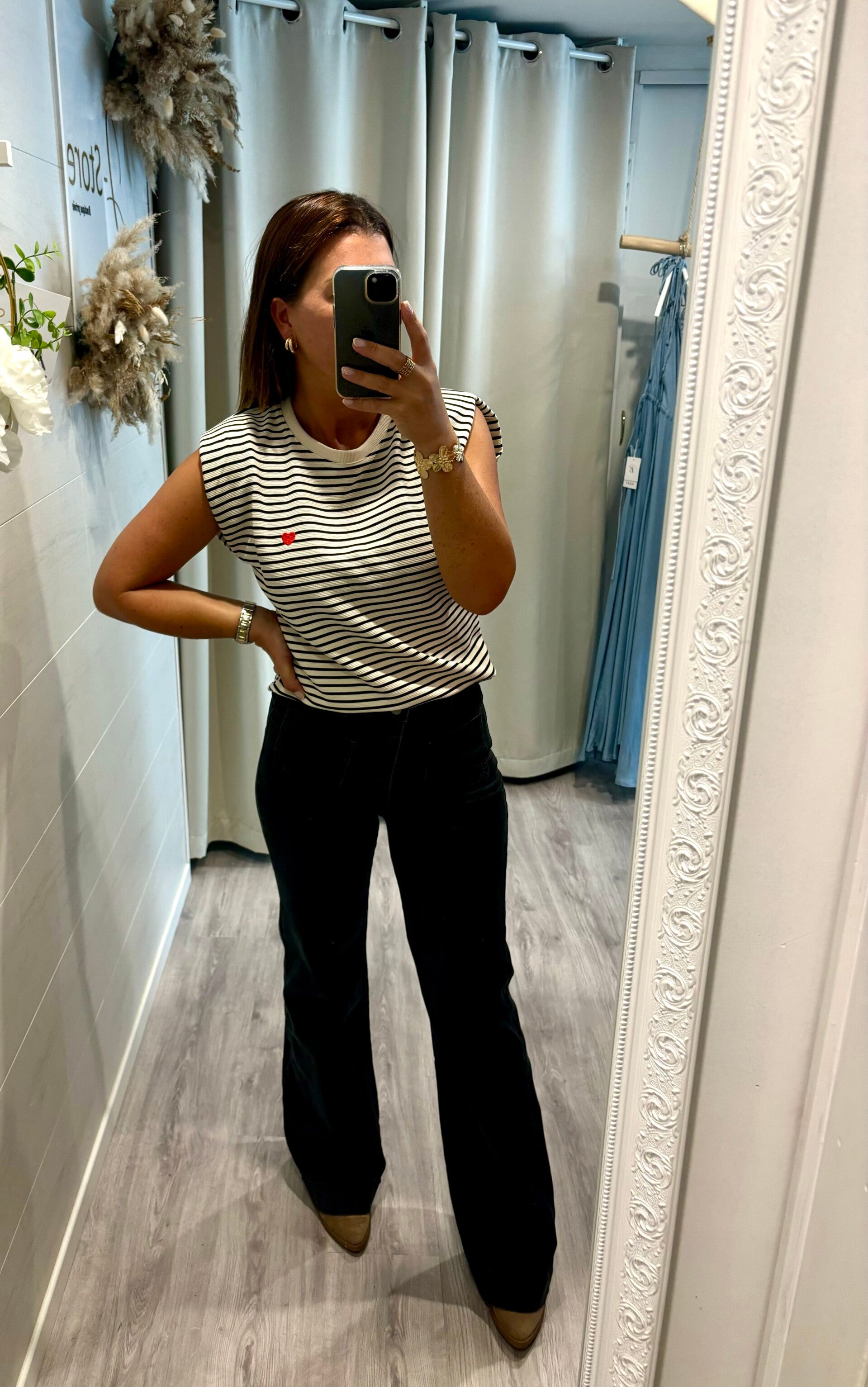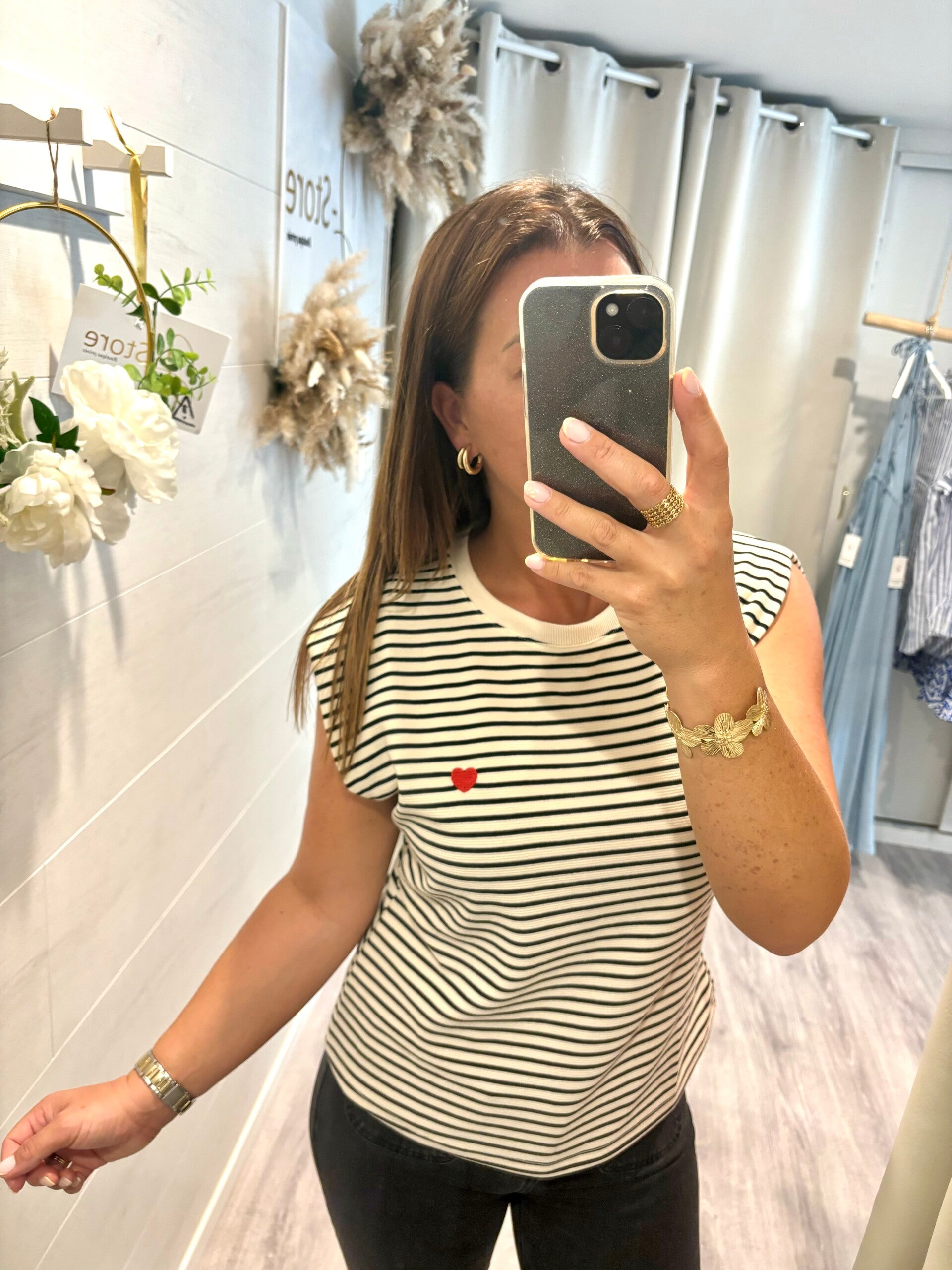 Craquez pour l’élégance intemporelle de la blouse marinière noir et blanc, revisitée avec une touche romantique : délicat petit motif cœur sur le devant 💕.