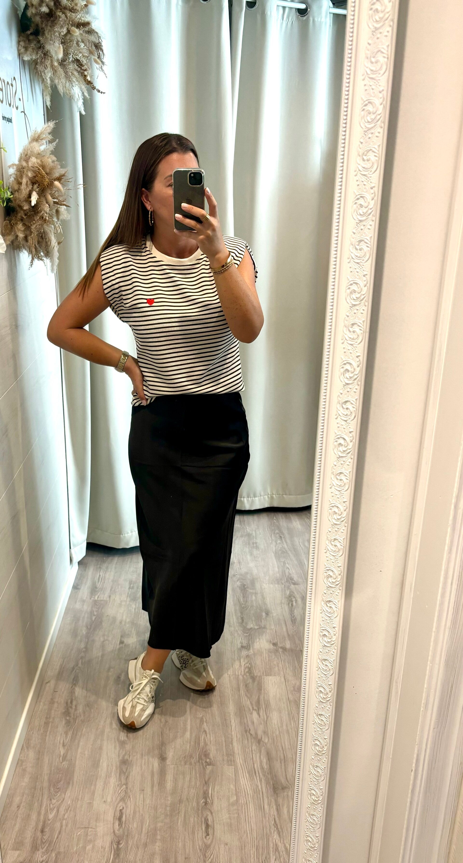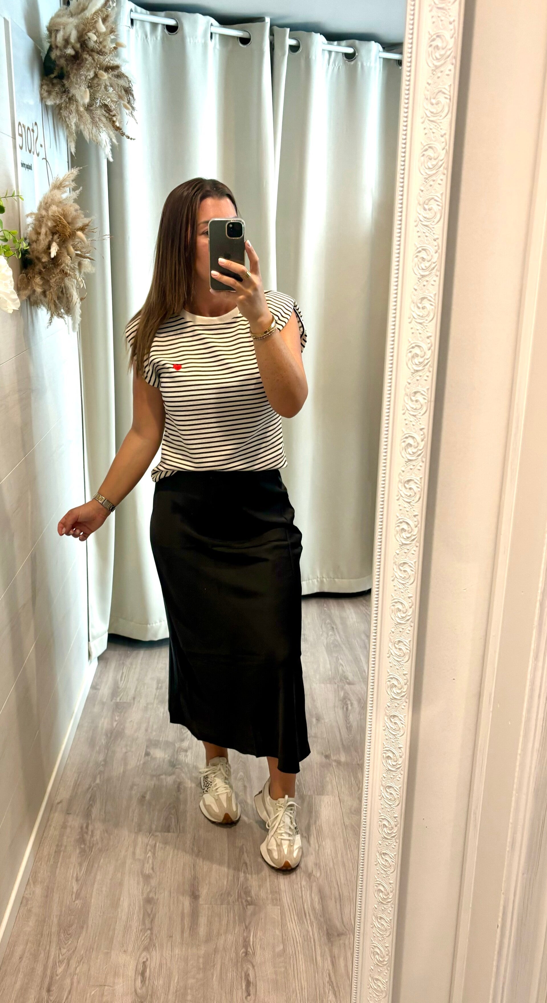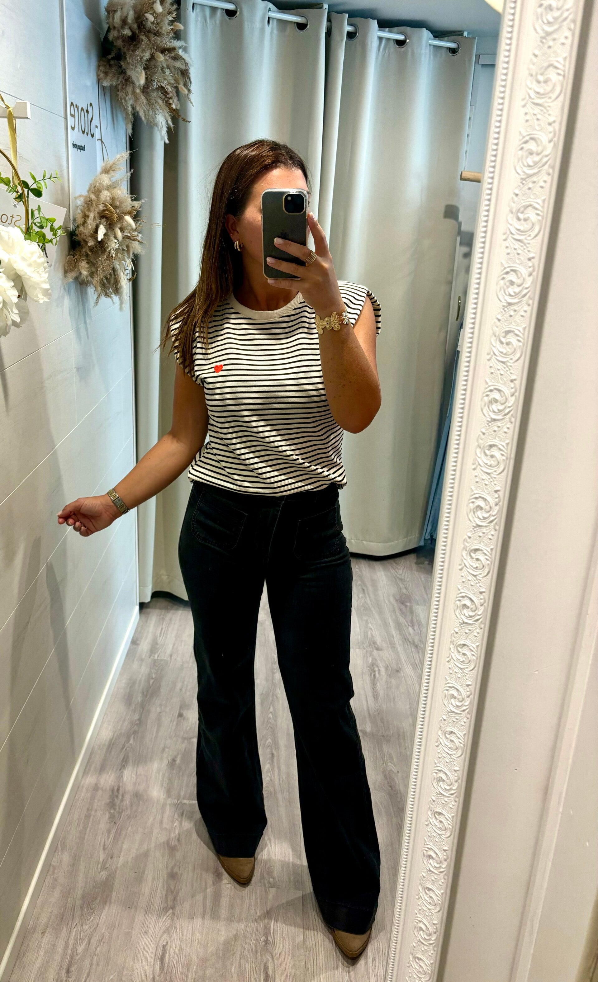 Craquez pour l’élégance intemporelle de la blouse marinière noir et blanc, revisitée avec une touche romantique : délicat petit motif cœur sur le devant 💕.
