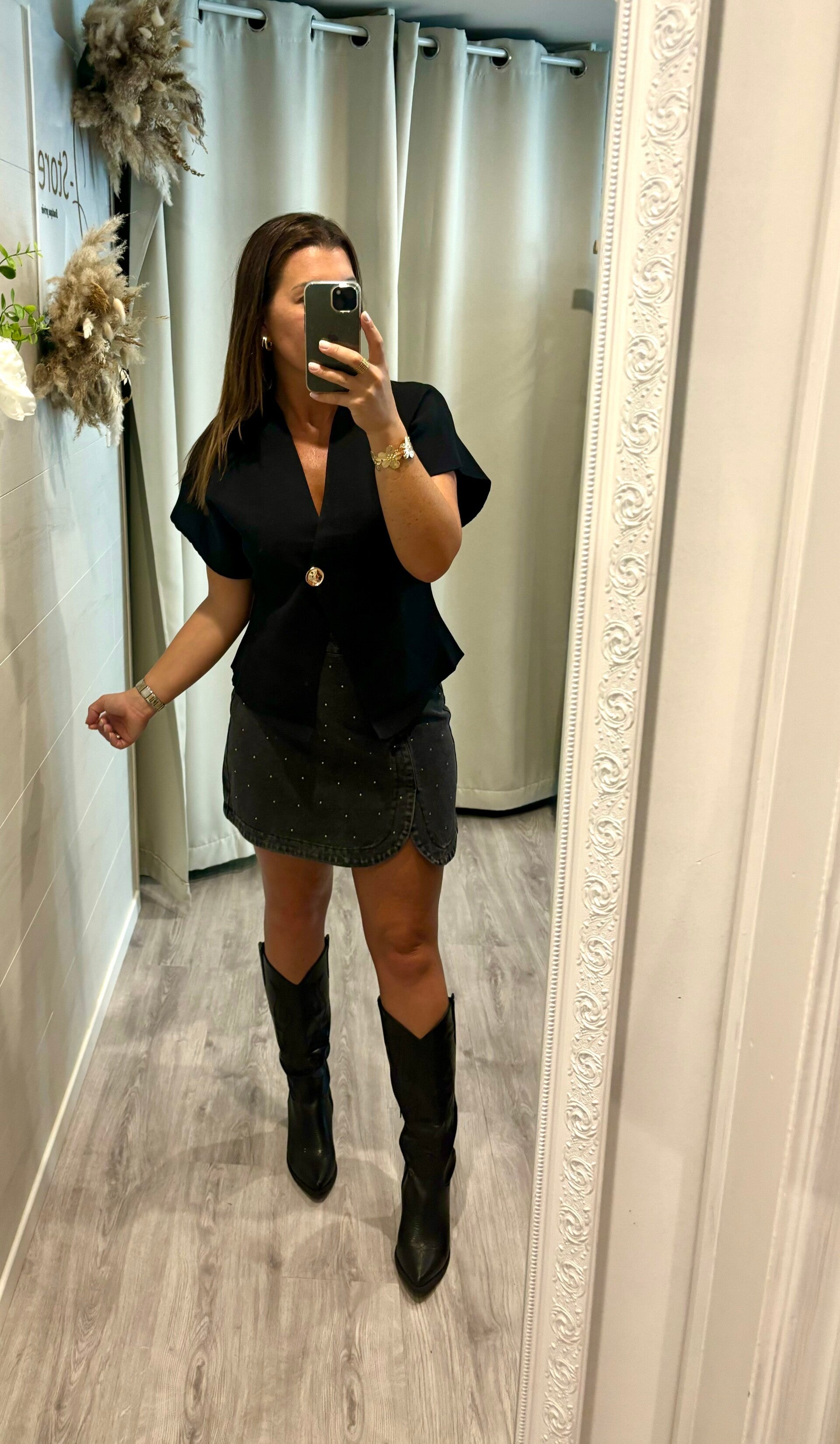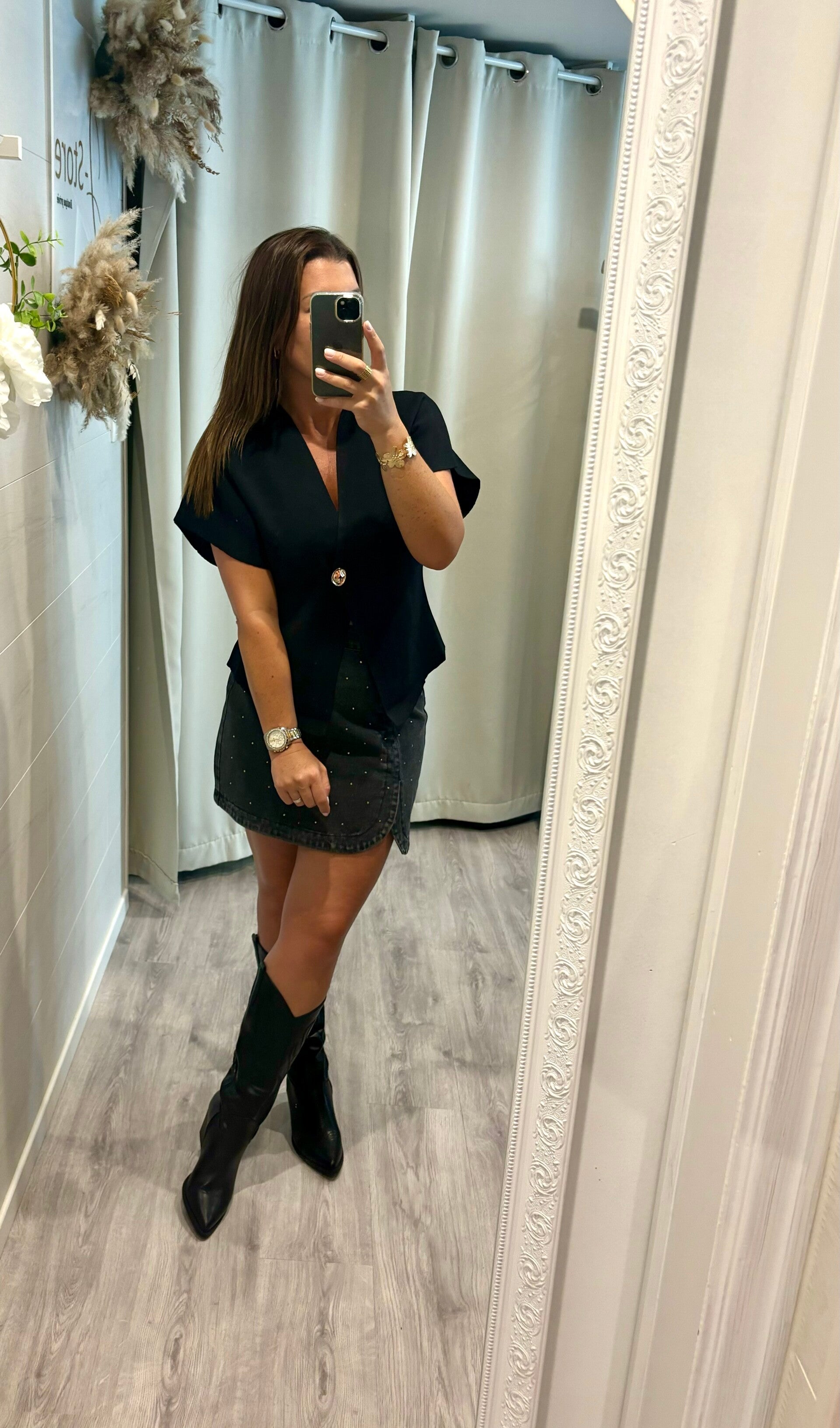 Découvrez le gilet noir tendance sublimé par un gros bouton doré qui apporte une touche d’élégance et de caractère.