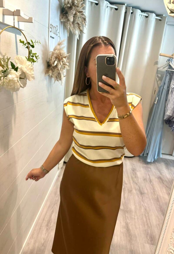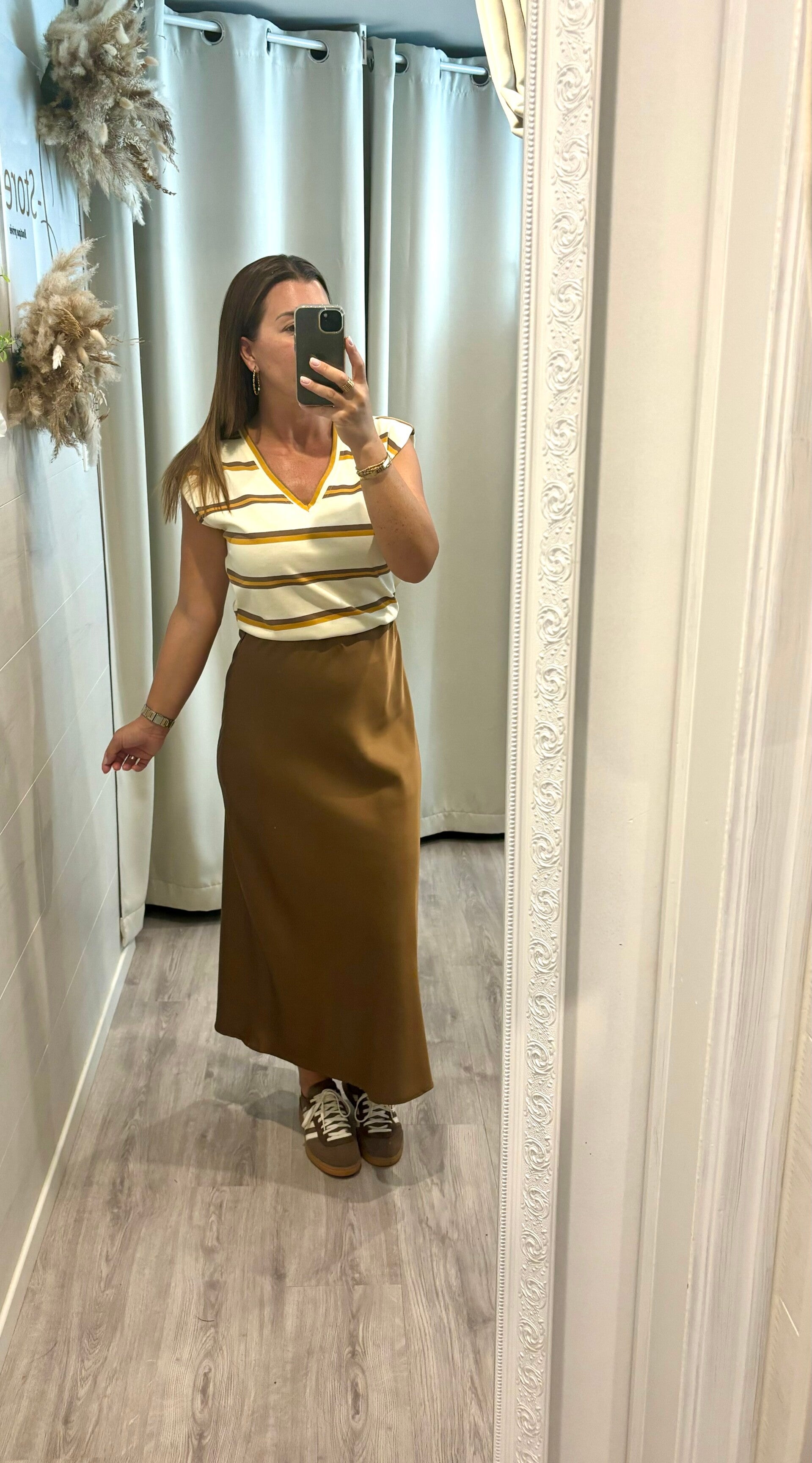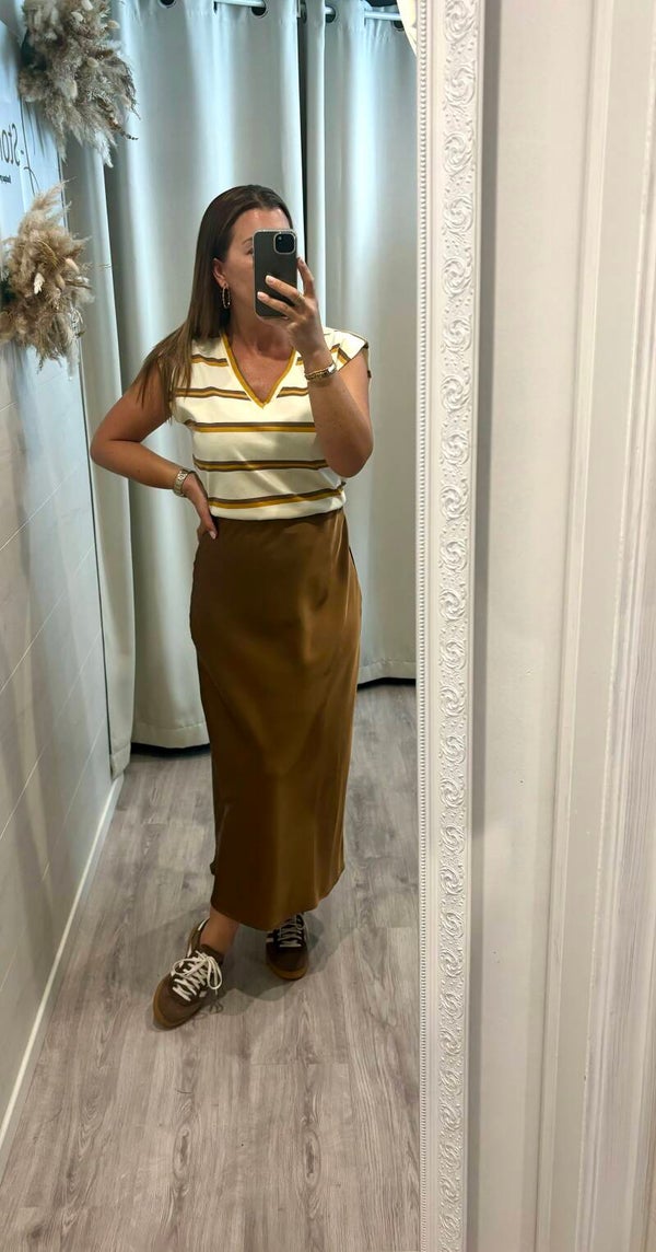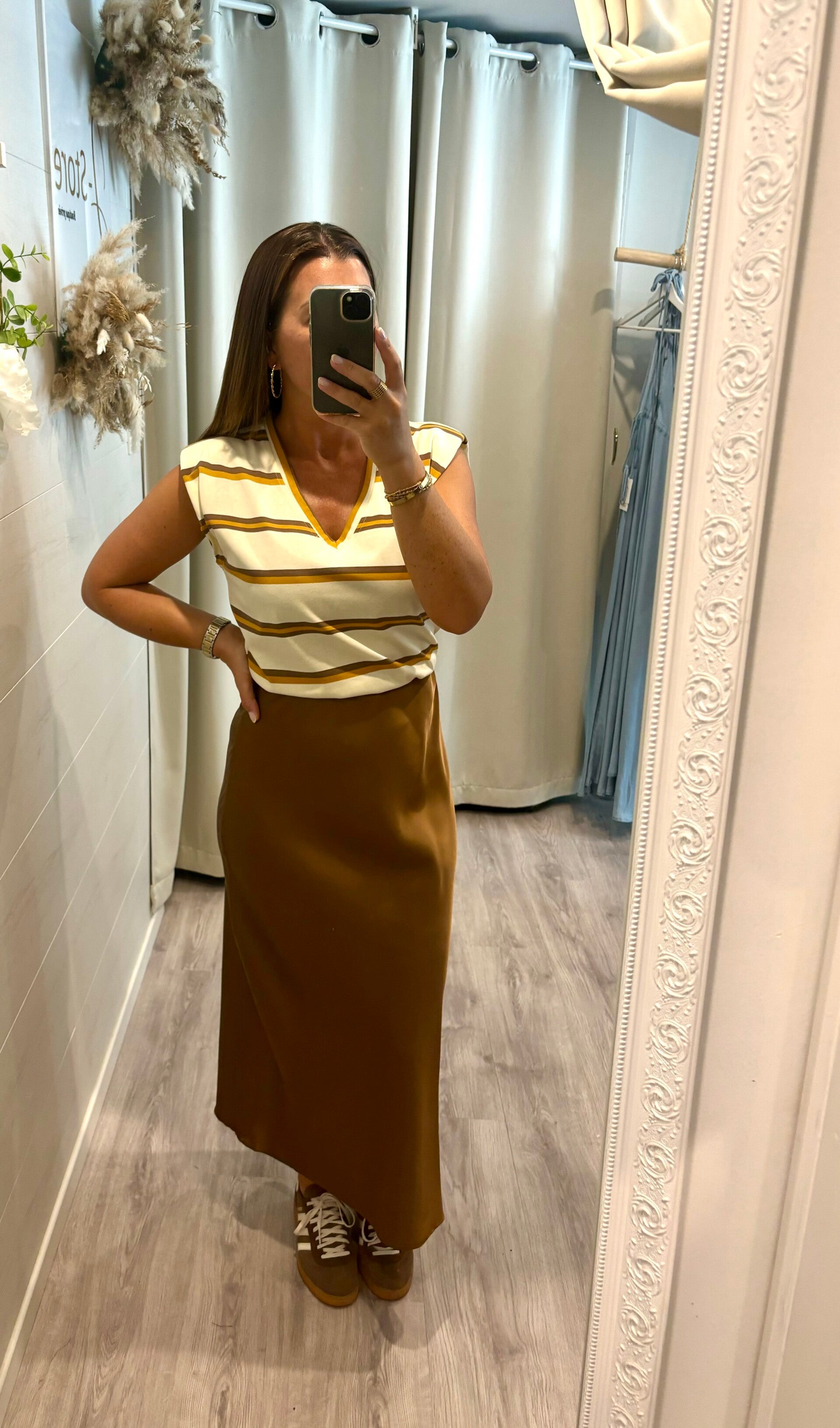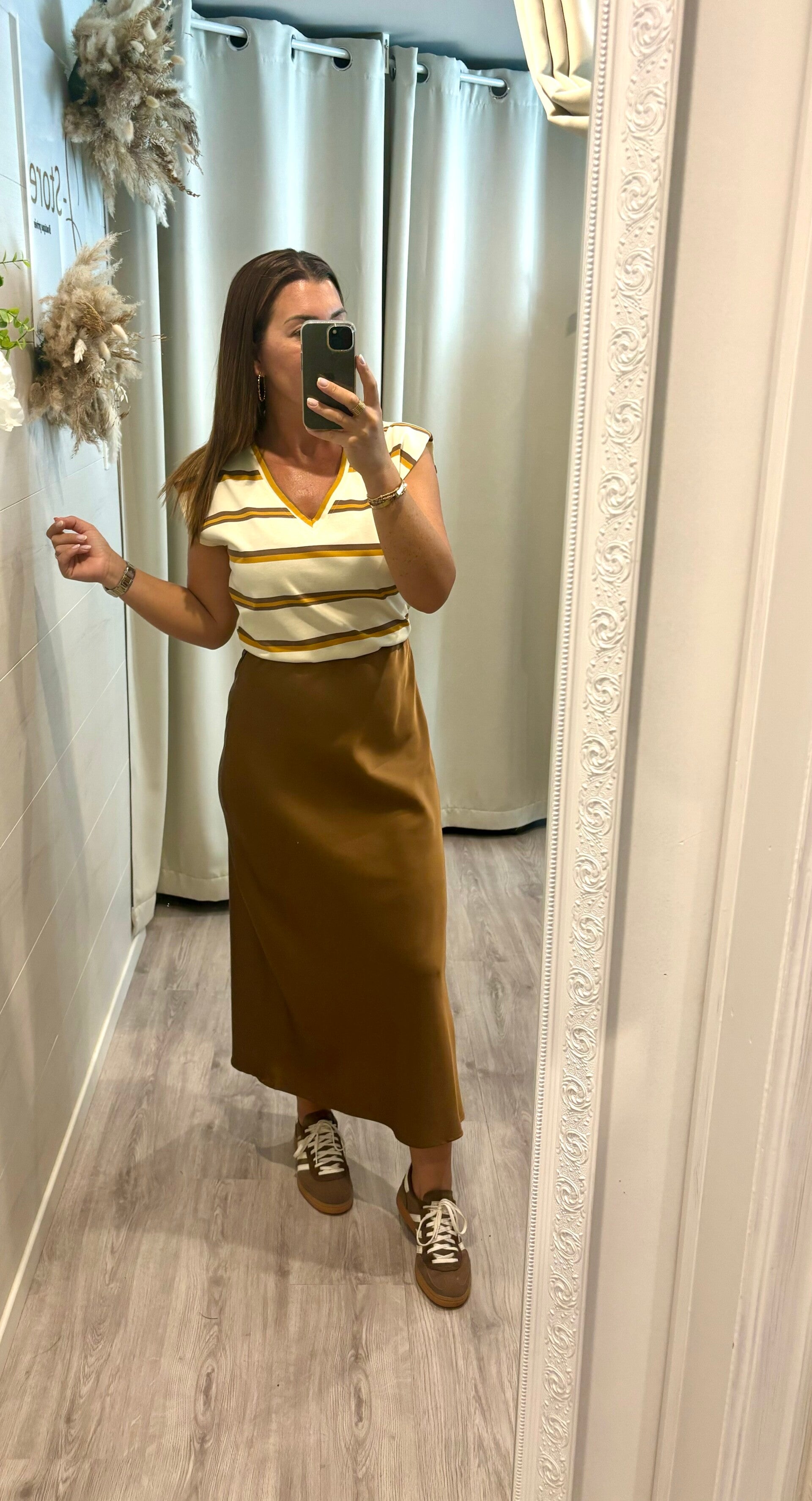 Découvrez notre robe bi-matière, alliance parfaite entre la fluidité d’une jupe satinée et le caractère affirmé d’un haut imprimé aux nuances camel.