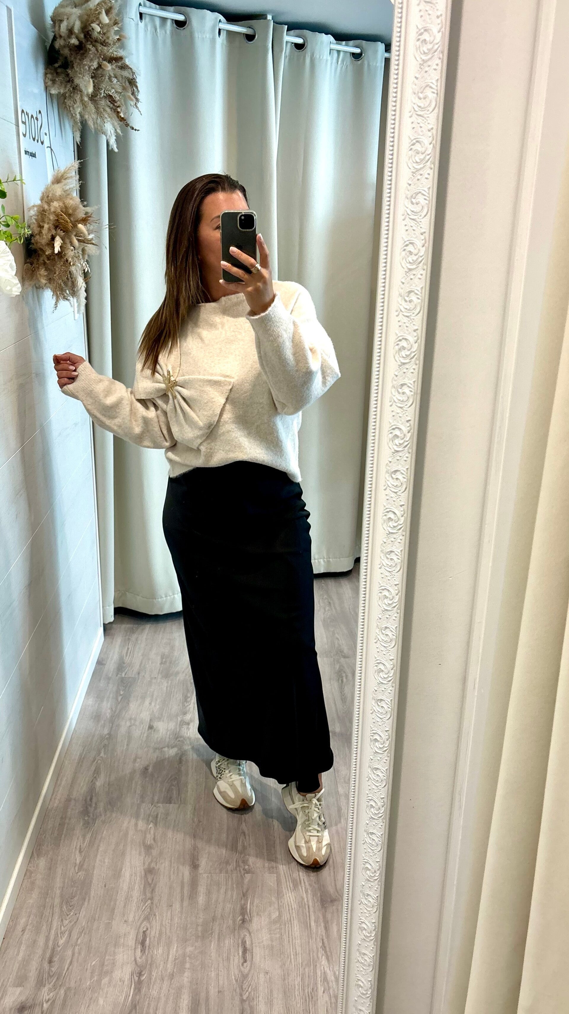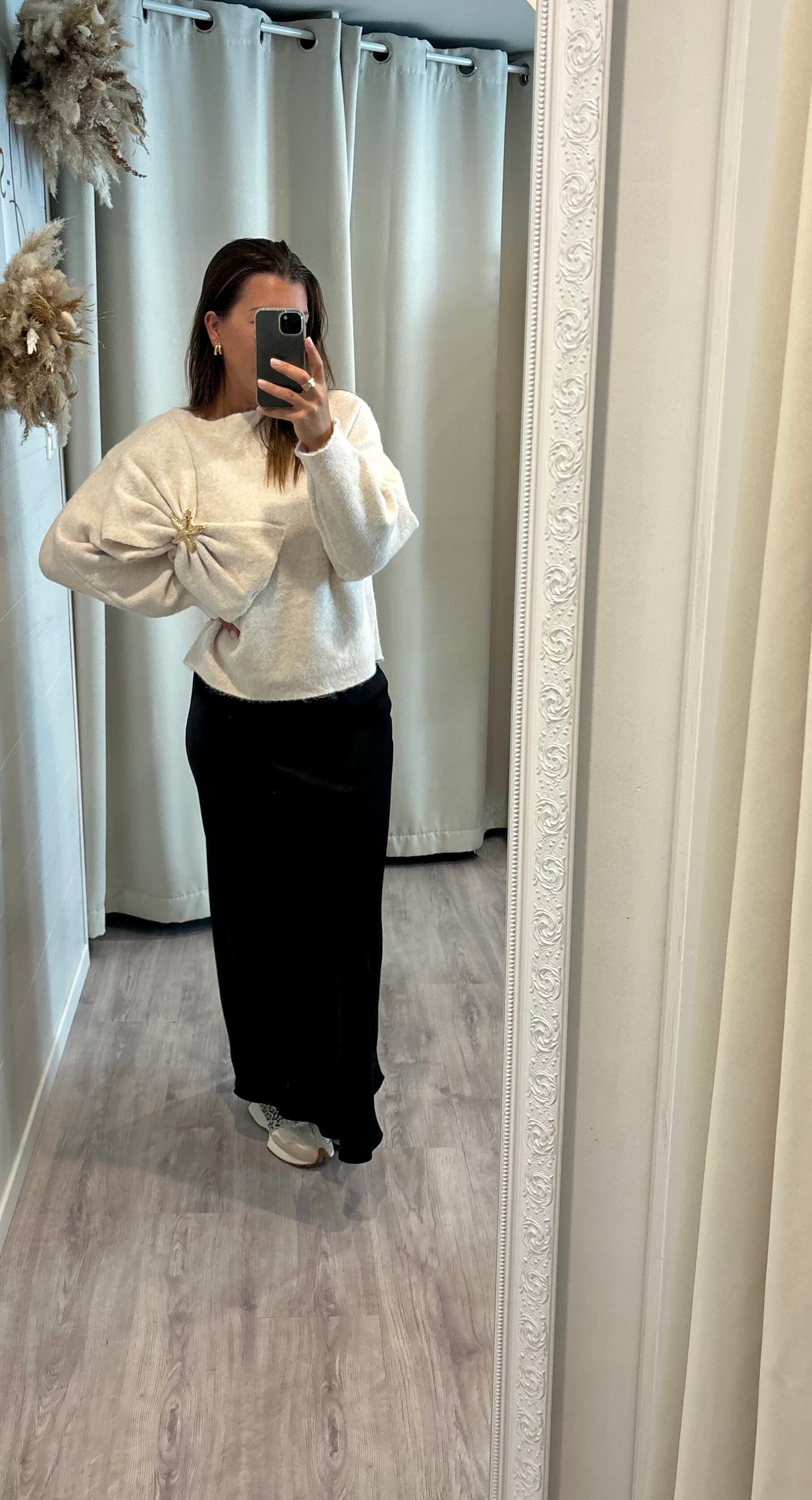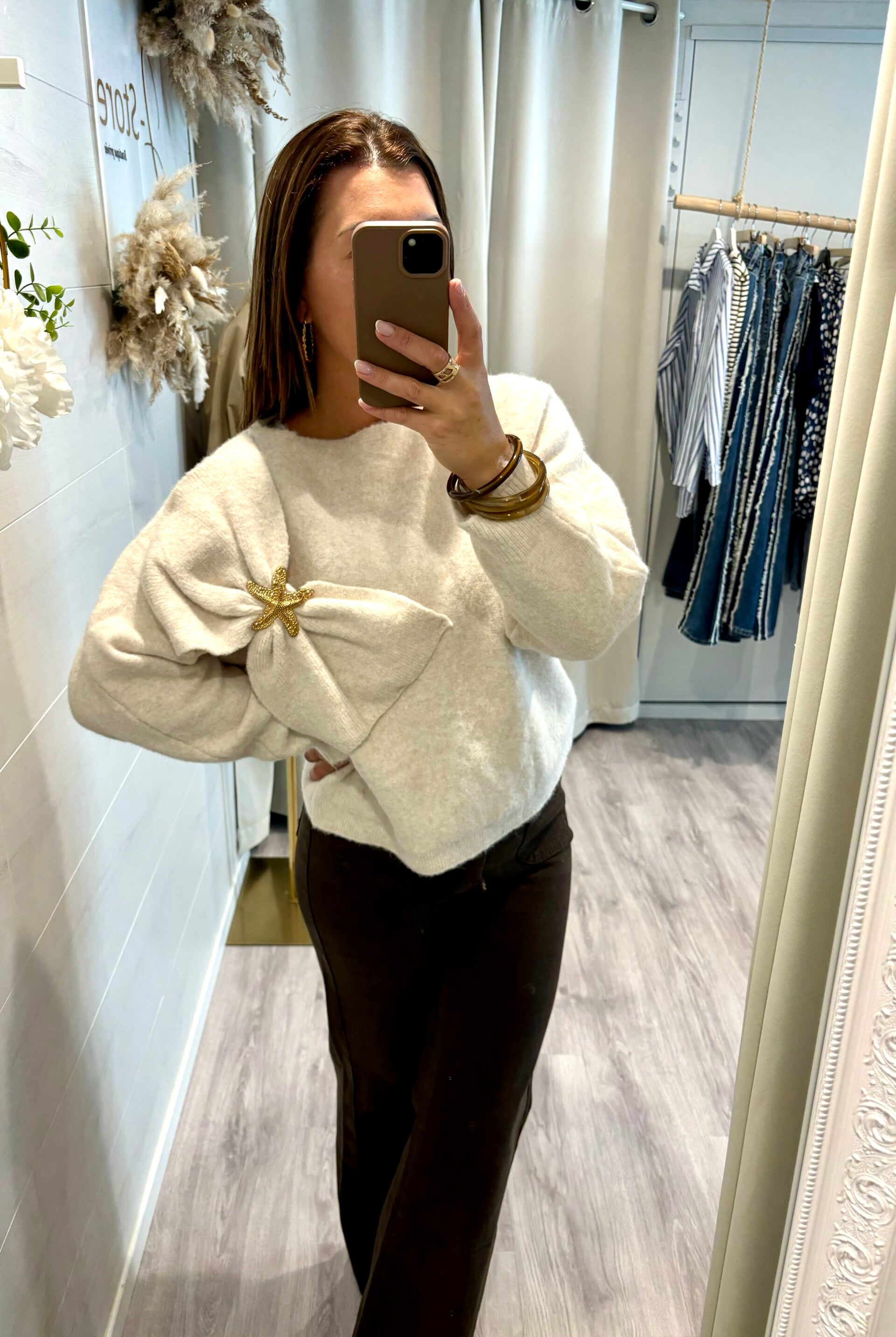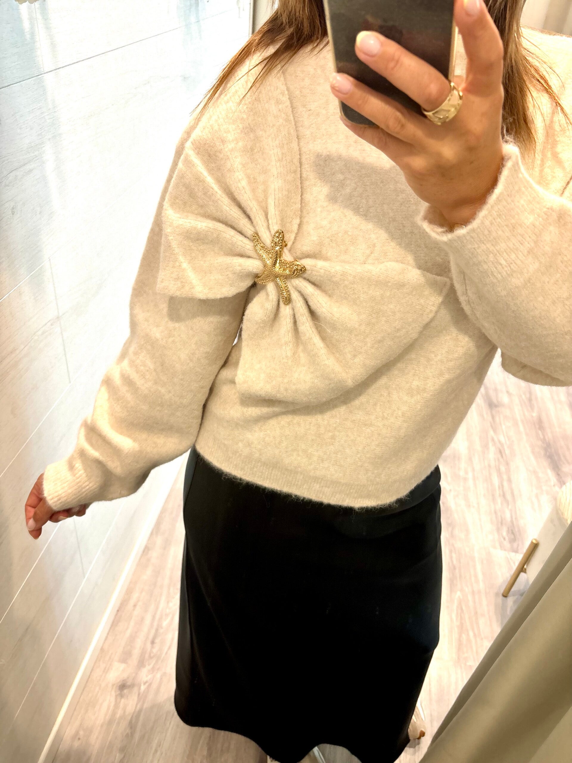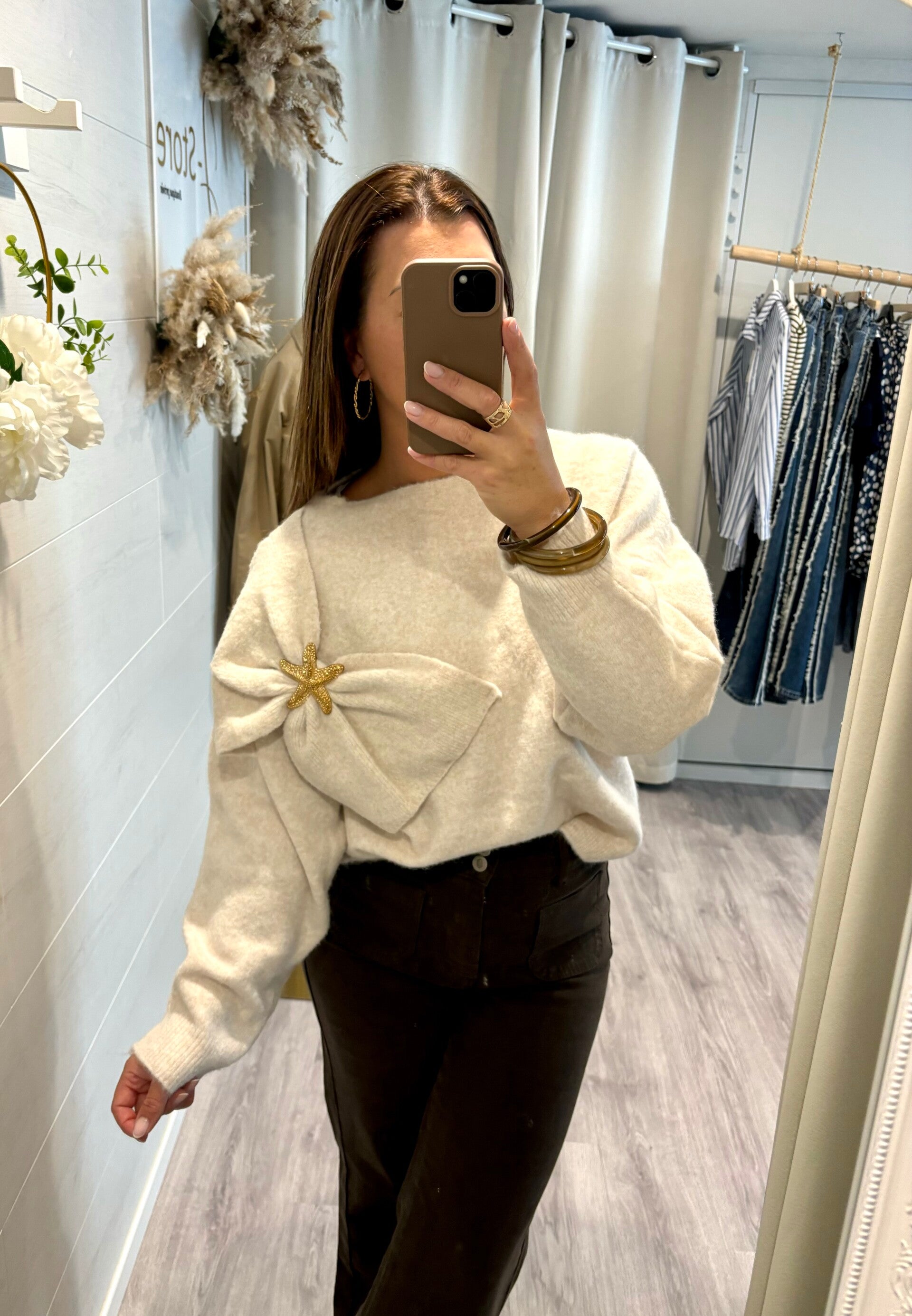 Laissez-vous séduire par notre pull tendance , rehaussé d’un grand noeud et bouton doré en forme d’étoile. Un jeu subtil entre fantaisie et élégance, qui apporte une touche lumineuse à votre style.