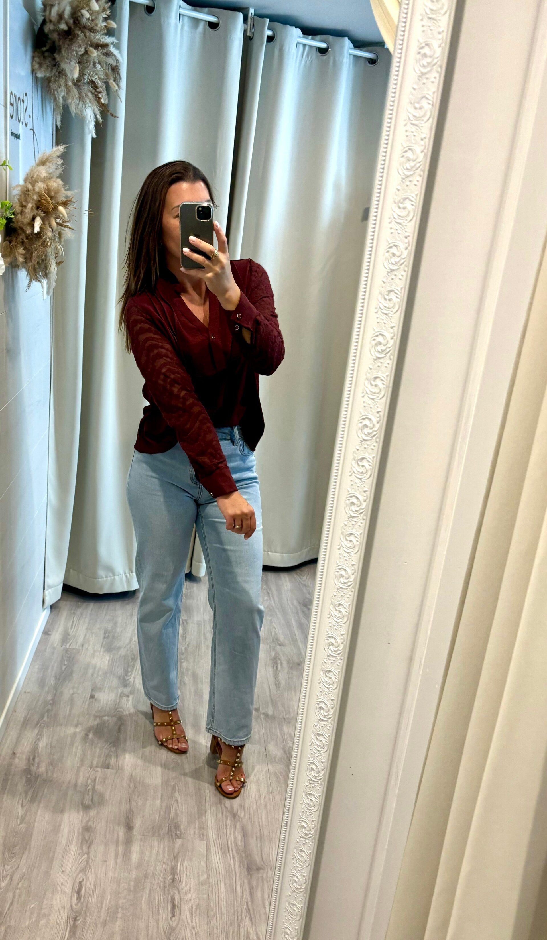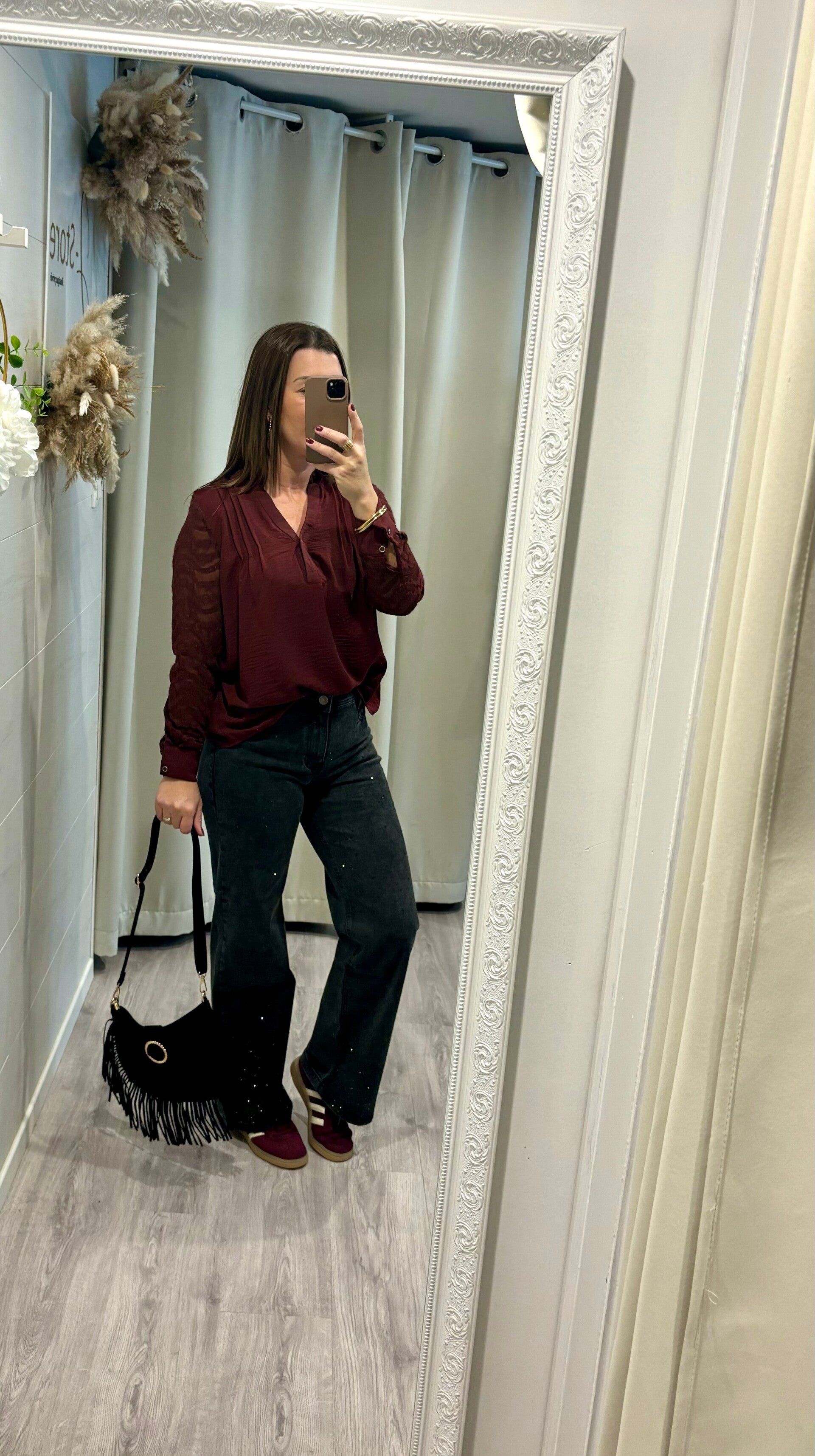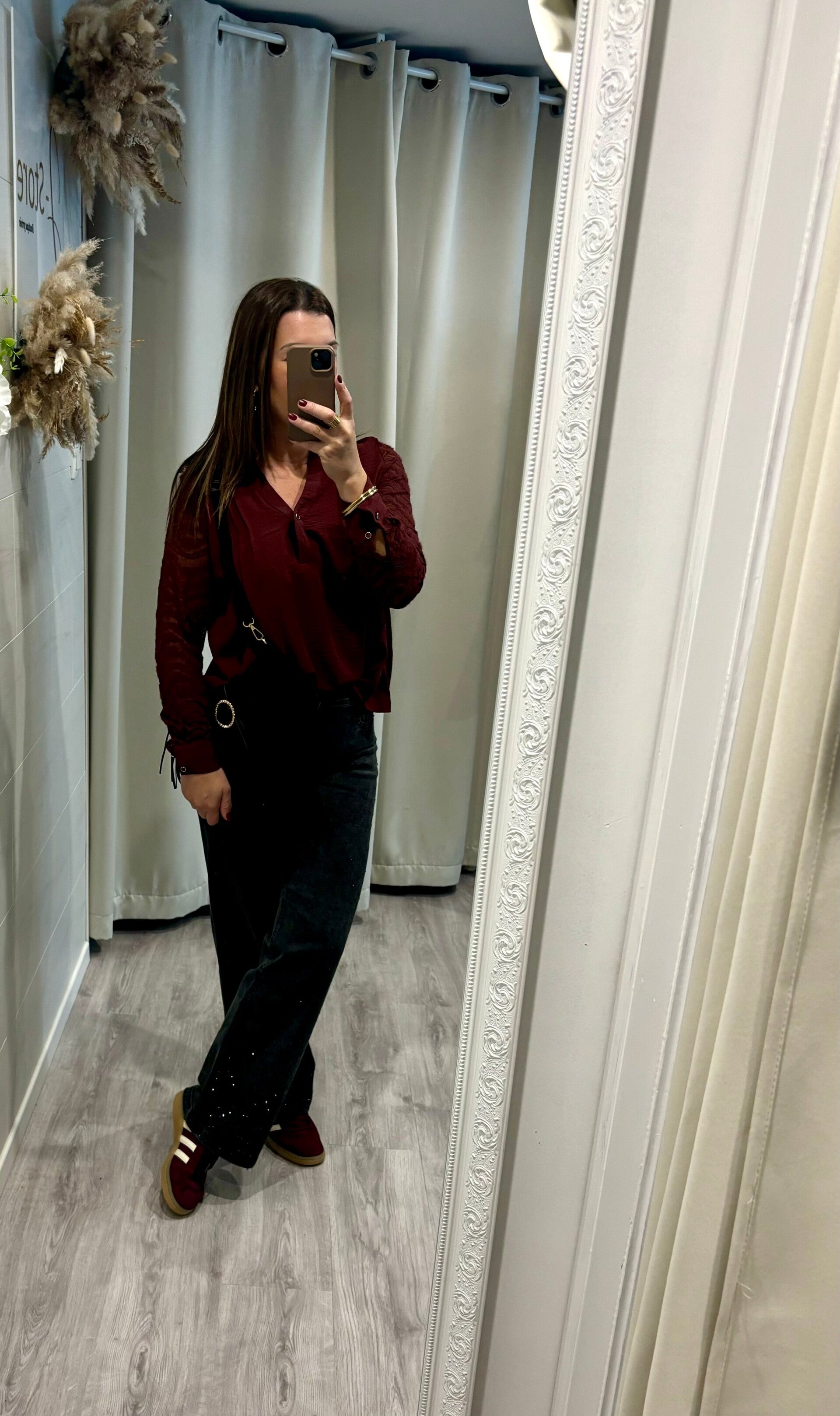 Succombez au charme de notre chemise bordeaux aux manches en dentelle, alliance parfaite entre intensité et délicatesse. Le bordeaux profond affirme une allure sophistiquée, tandis que la dentelle apporte une touche de féminité subtile et raffinée.