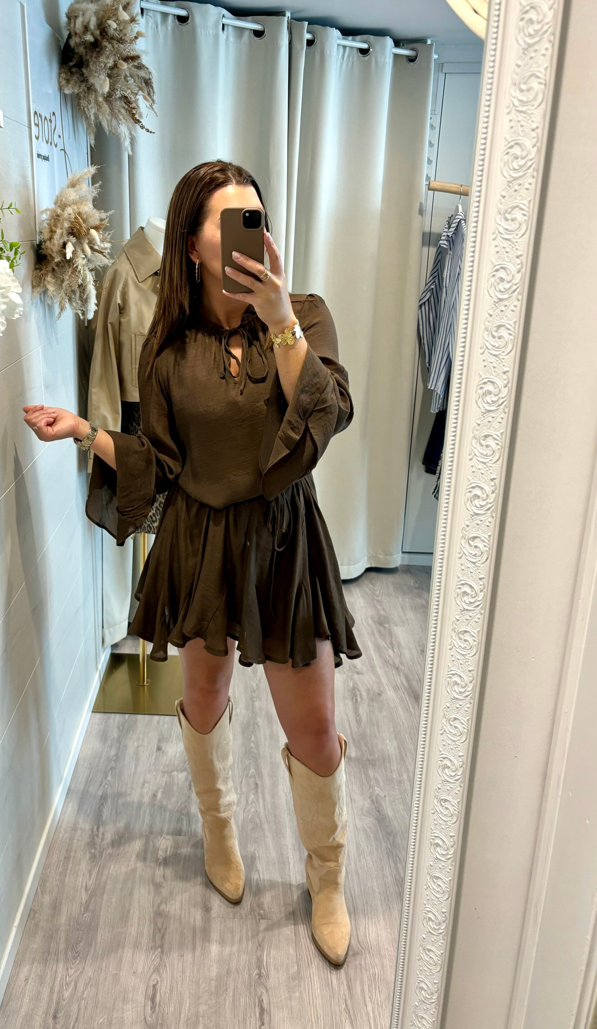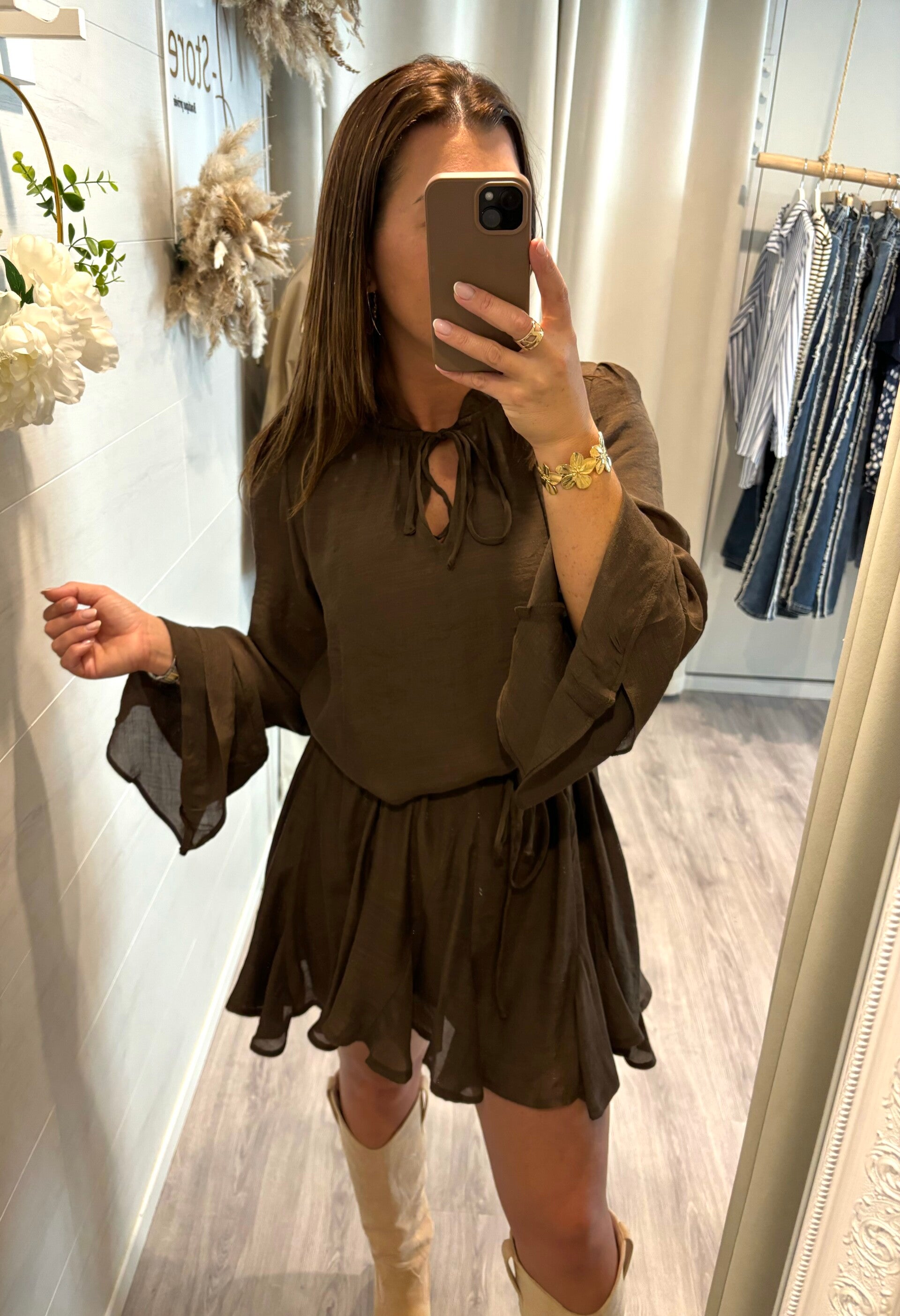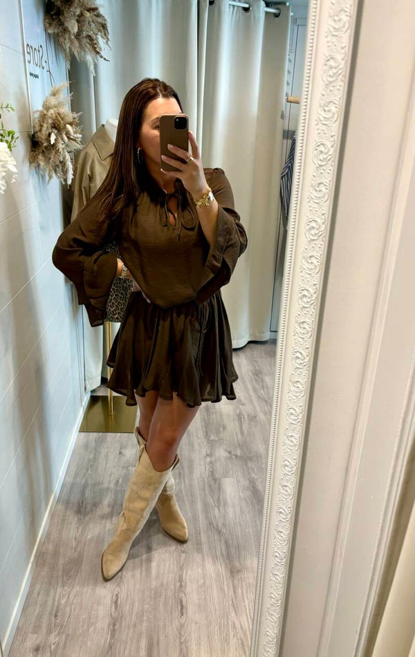 Succombez à la douceur de notre robe couleur café, fluide et légère. Son tombé parfait épouse vos mouvements avec grâce pour une allure naturelle, chic et sans effort.
