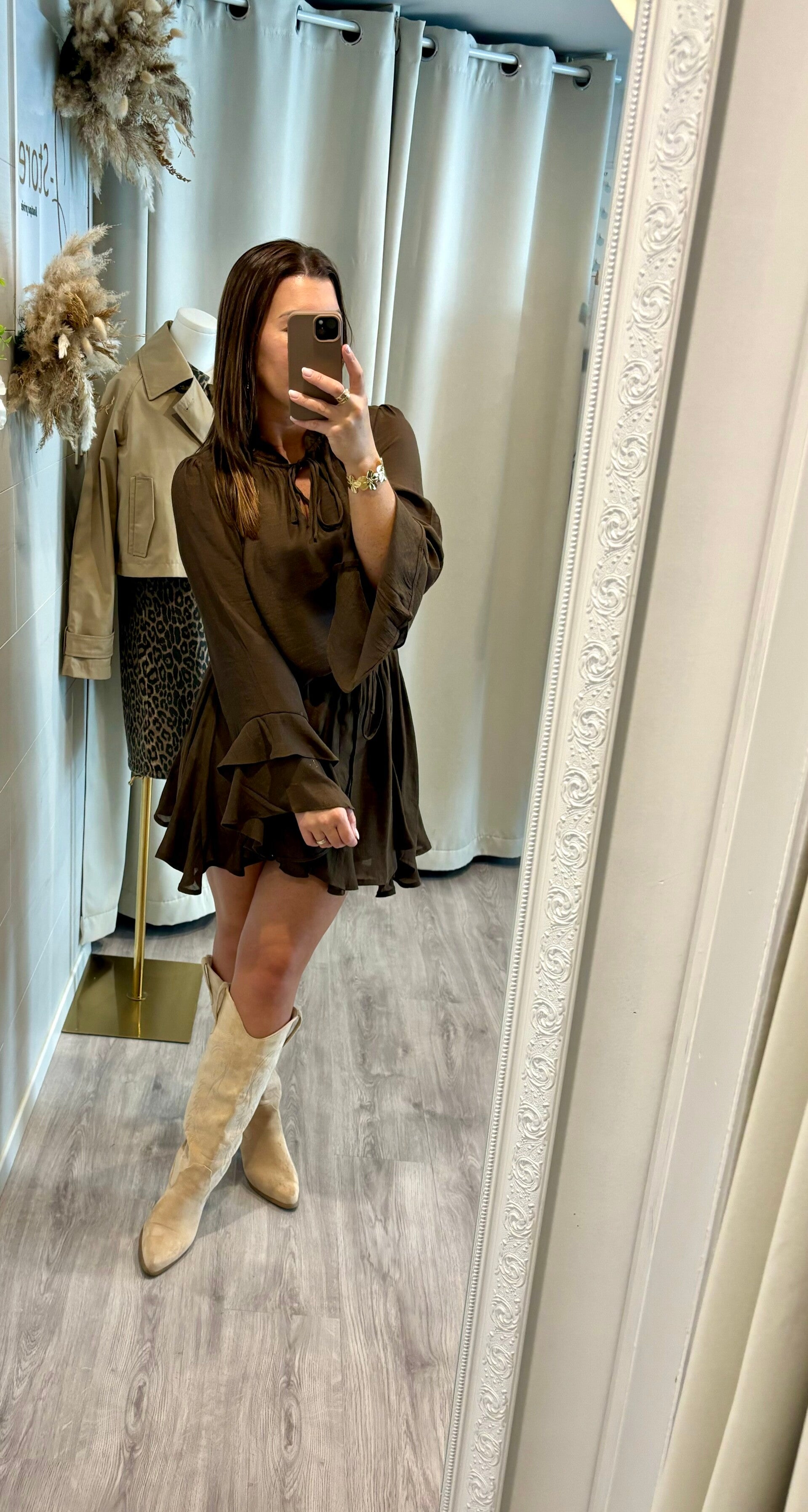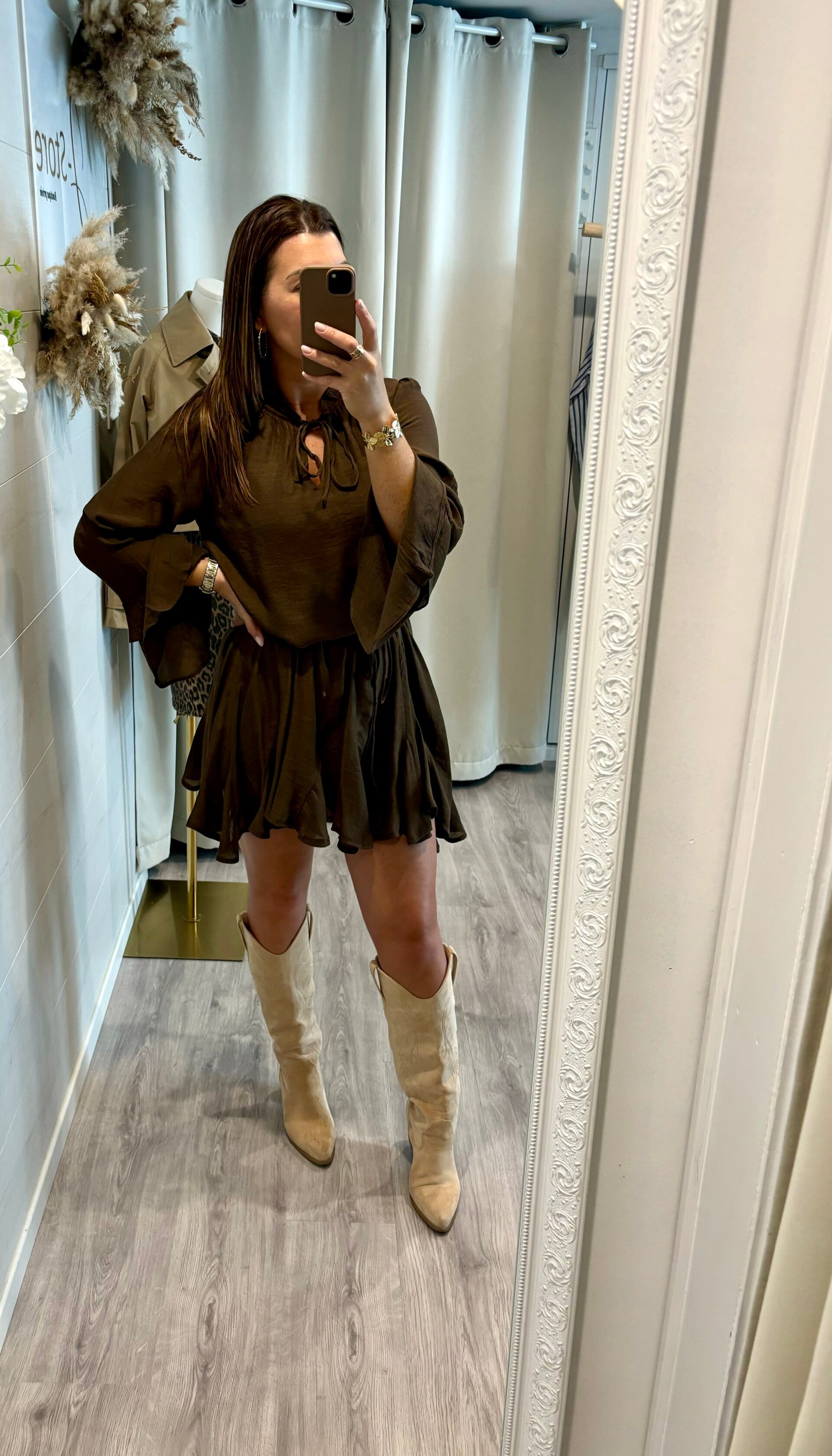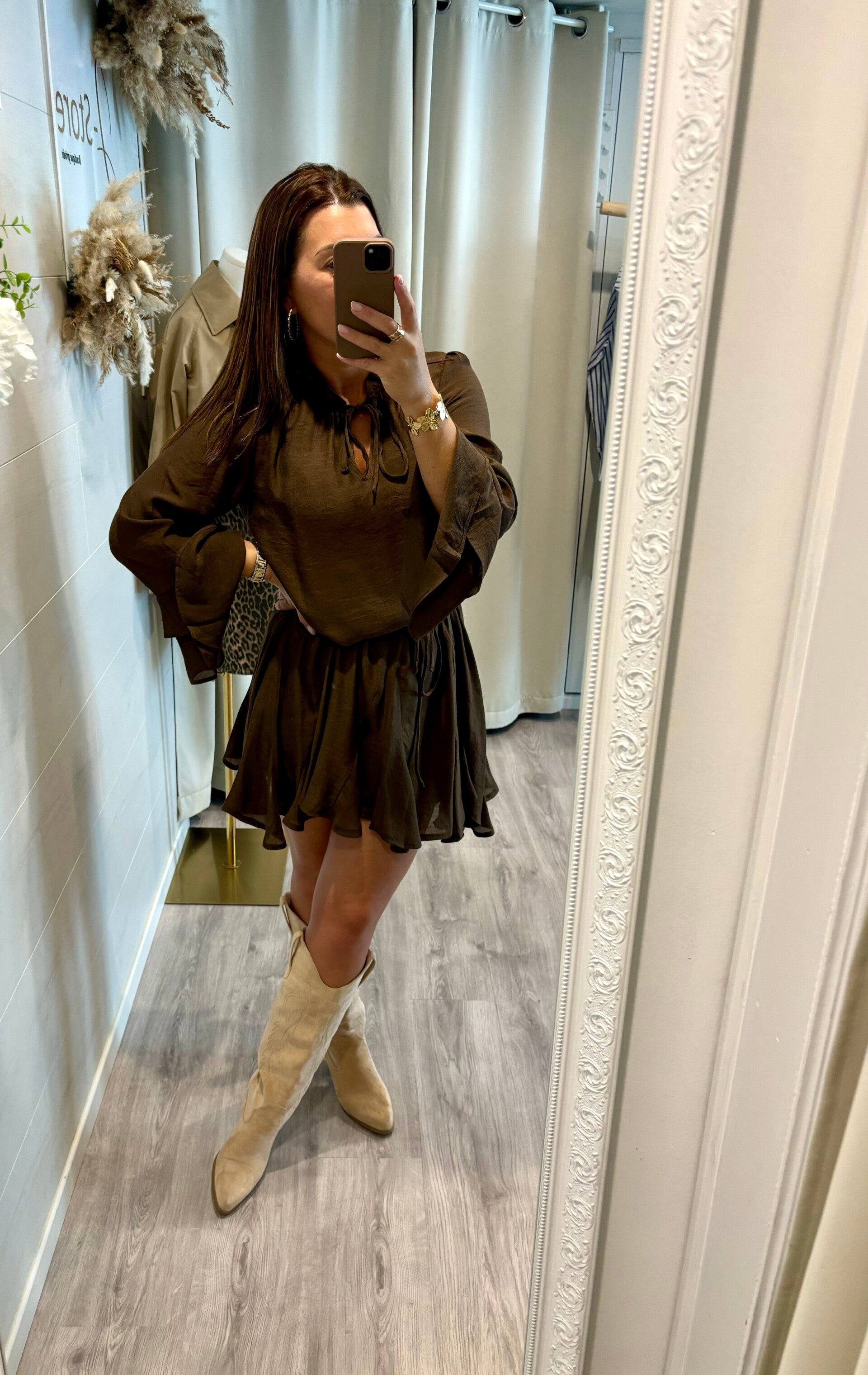 Succombez à la douceur de notre robe couleur café, fluide et légère. Son tombé parfait épouse vos mouvements avec grâce pour une allure naturelle, chic et sans effort.