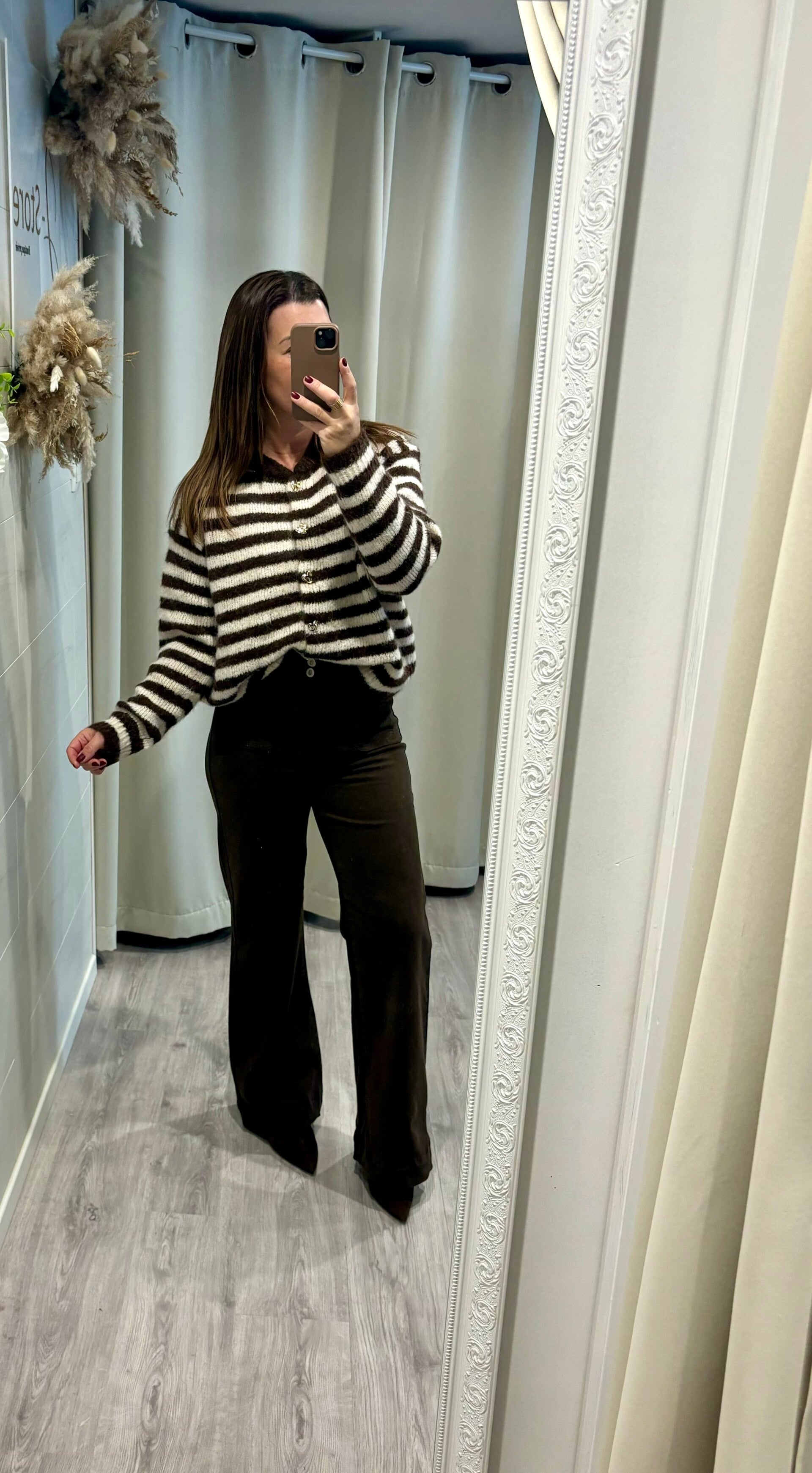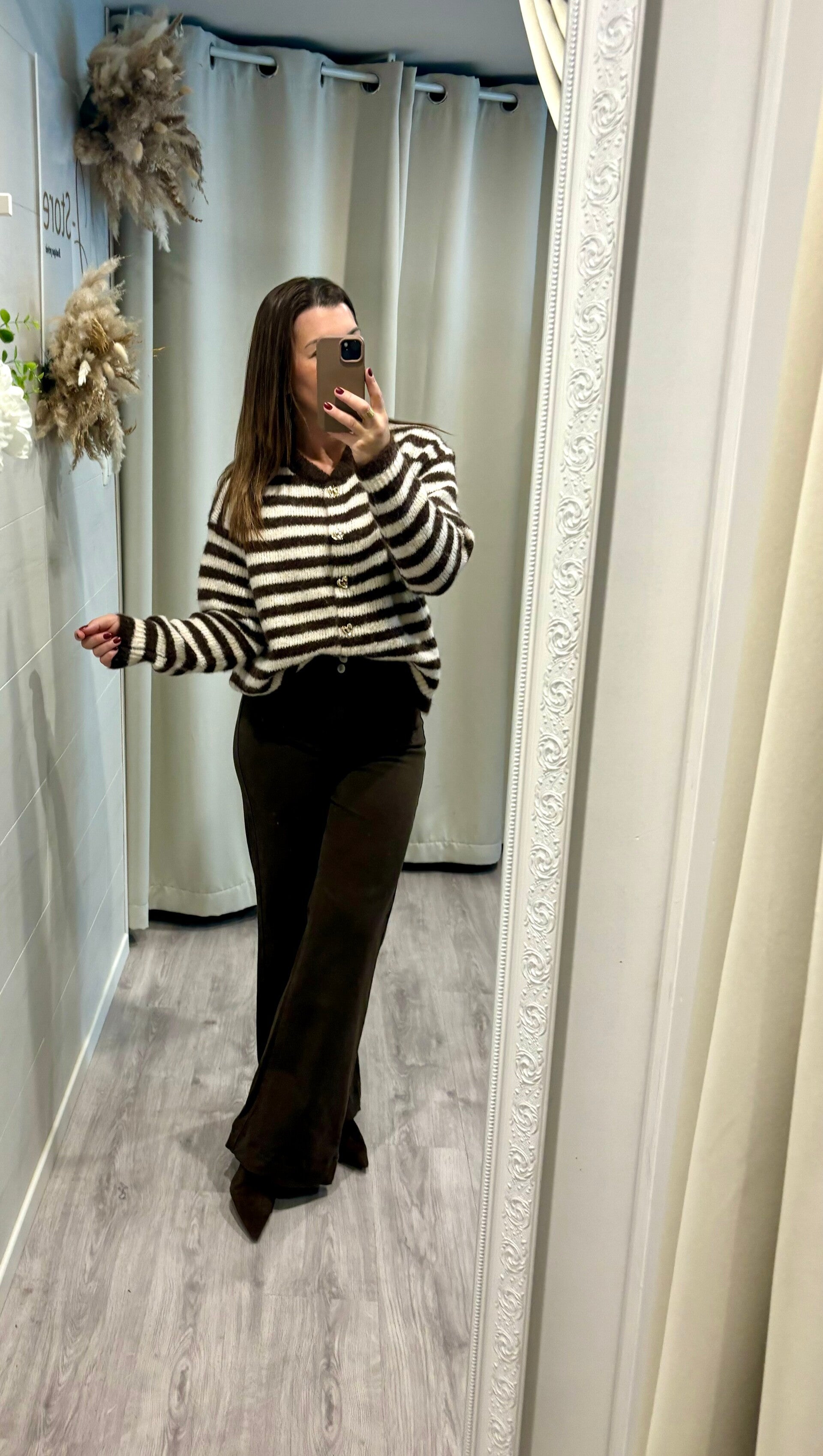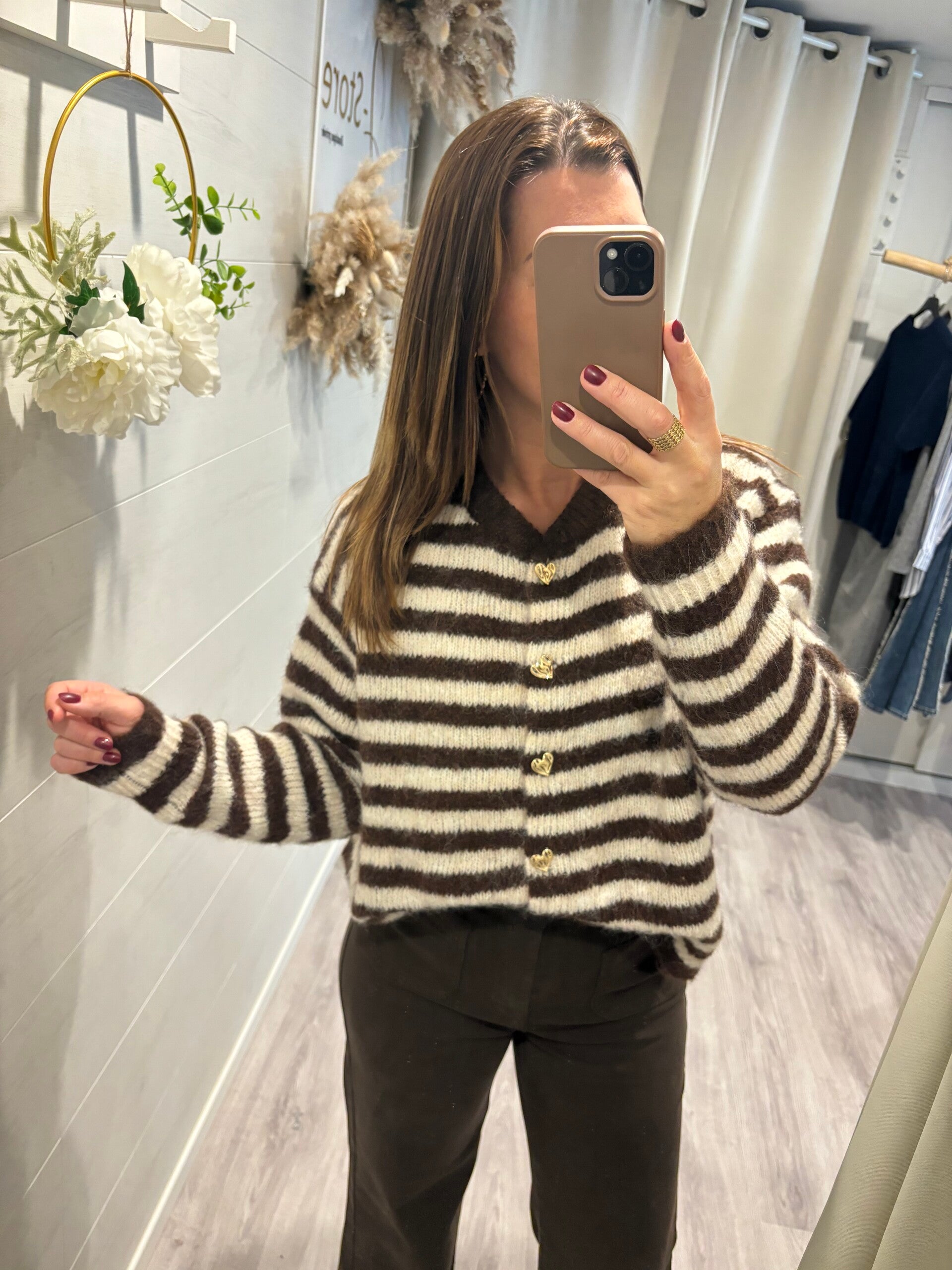 Craquez pour notre gilet brun/écru aux boutons dorés — la touche parfaite entre vintage et modernité.