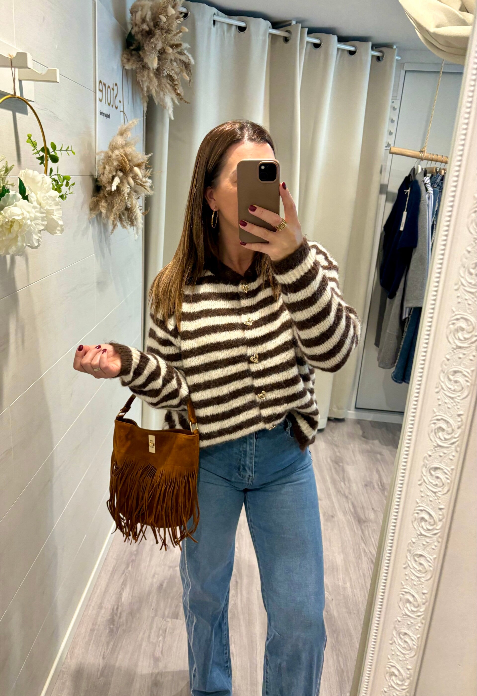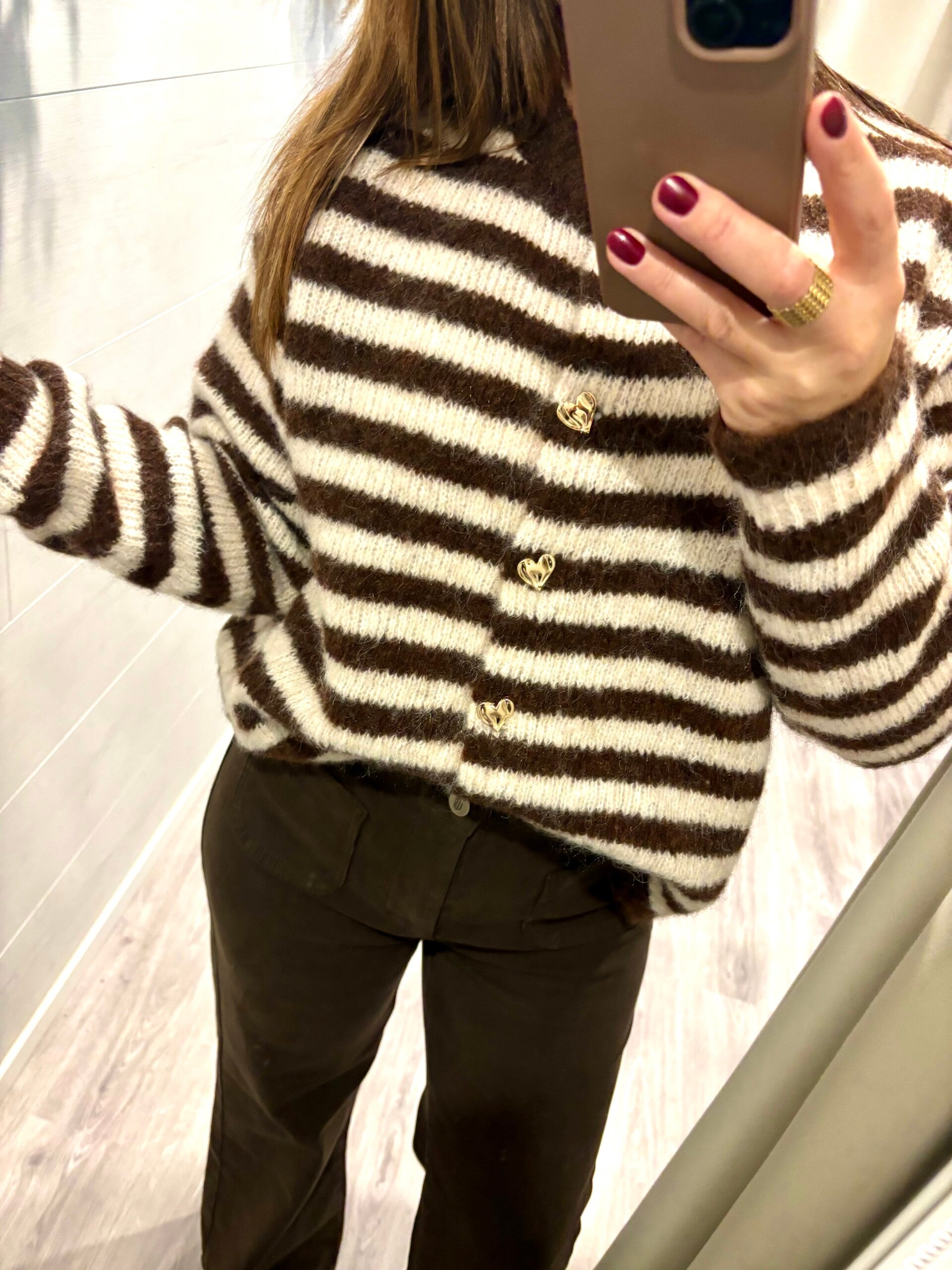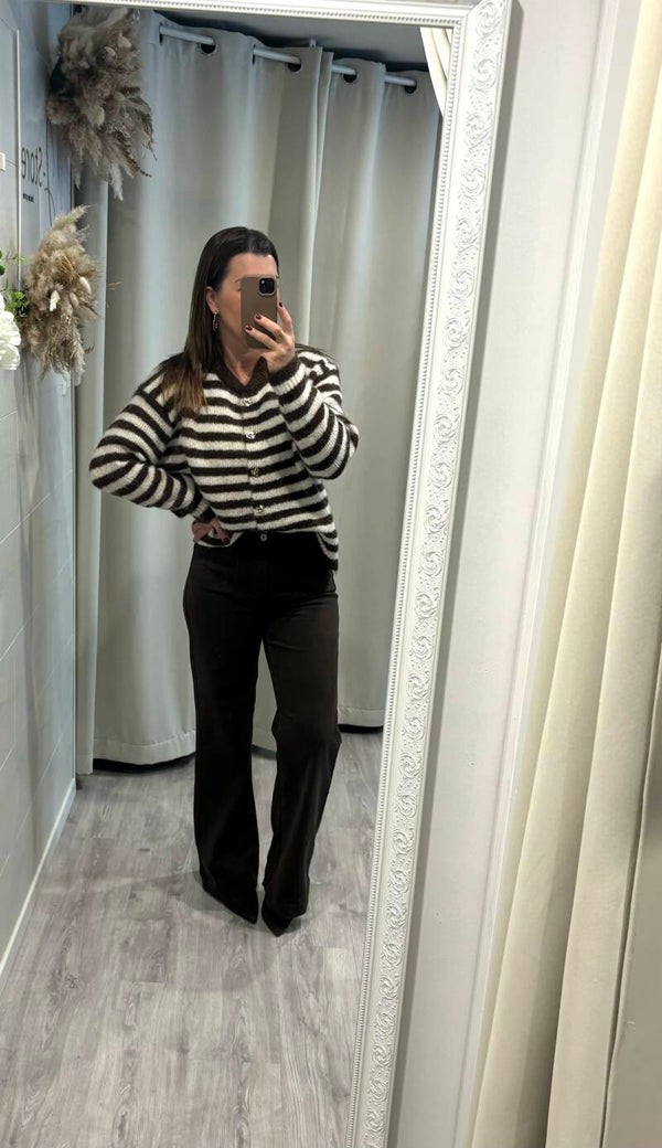 Craquez pour notre gilet brun/écru aux boutons dorés — la touche parfaite entre vintage et modernité.