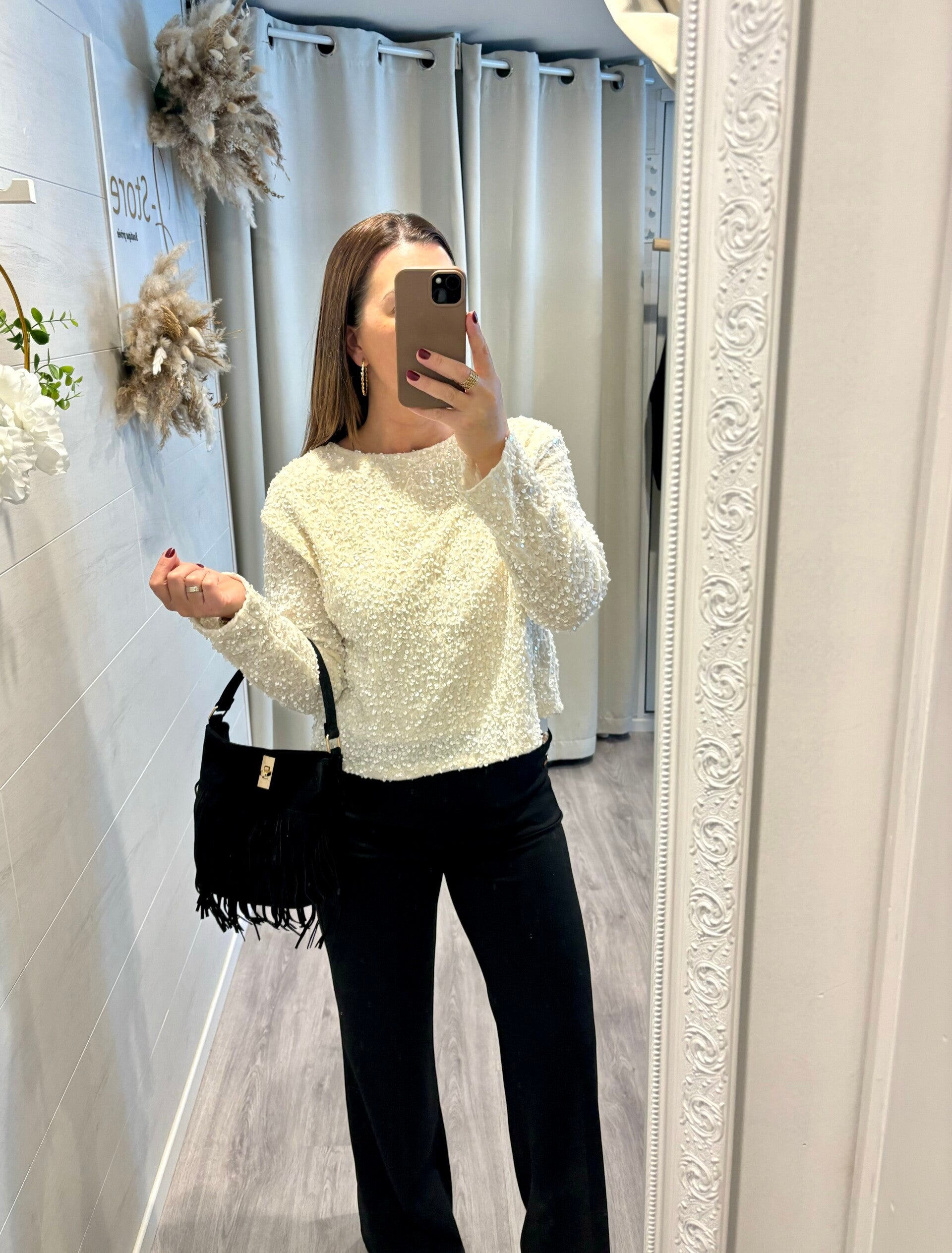 Craquez pour notre blouse perlée ivoire, une pièce d’exception qui allie raffinement et modernité.