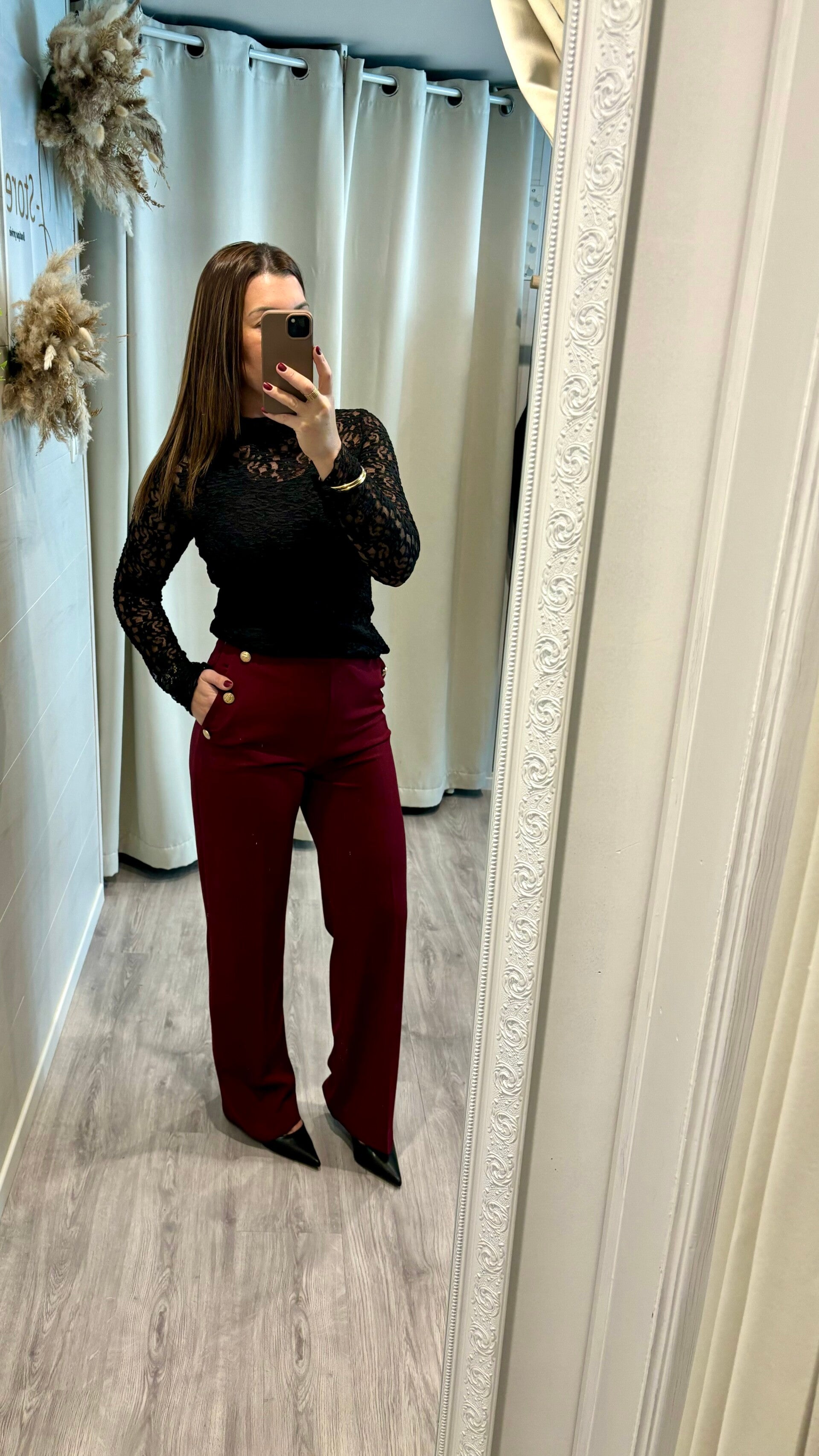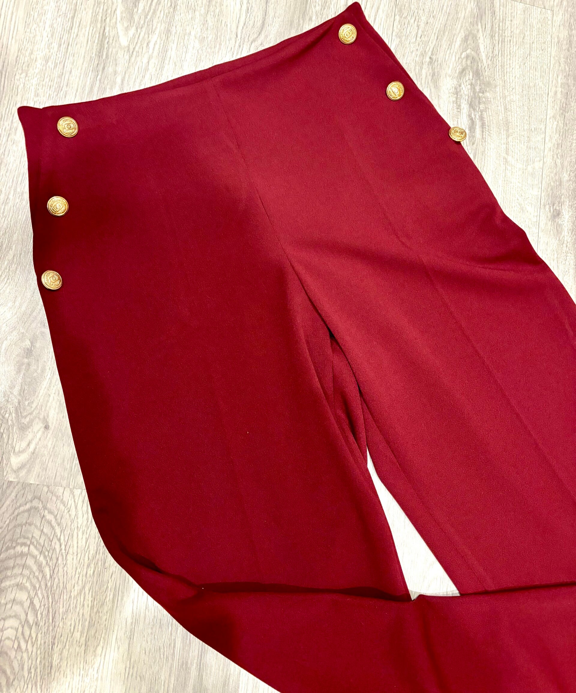 Adoptez l’élégance moderne avec notre pantalon bordeaux à boutons dorés, une pièce qui allie structure et raffinement.