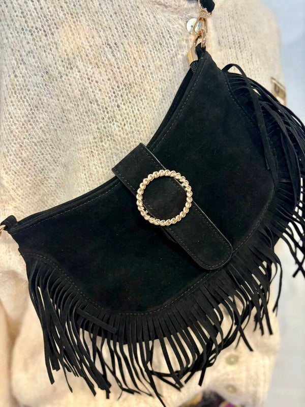 Laissez-vous séduire par le charme raffiné de notre sac en suédine à franges et boucle dorée.