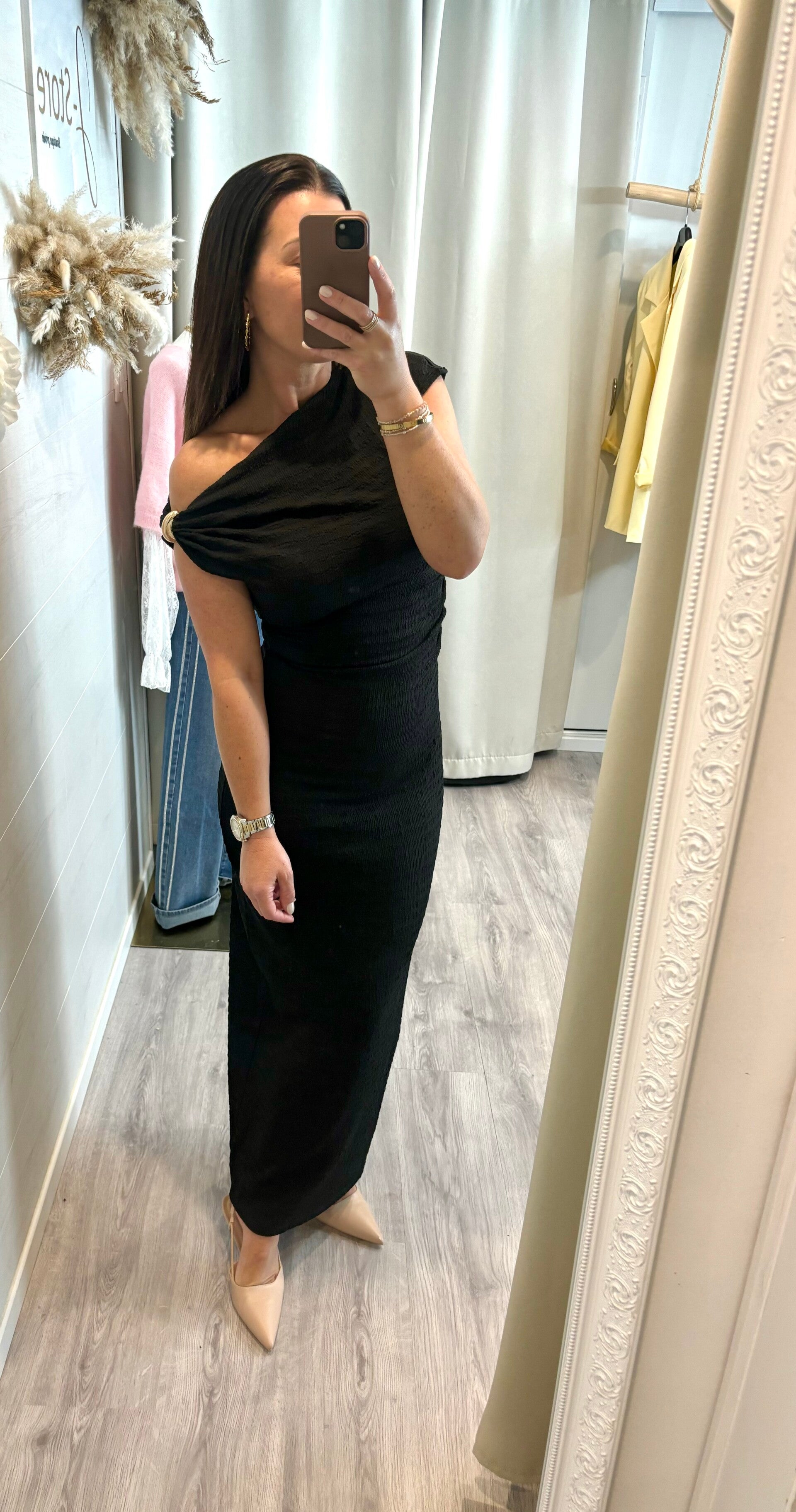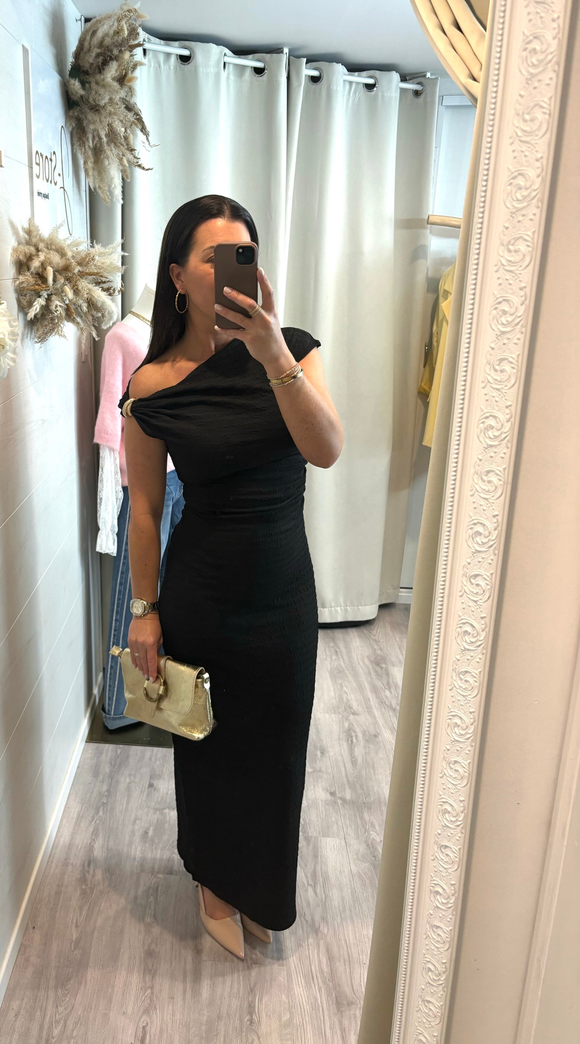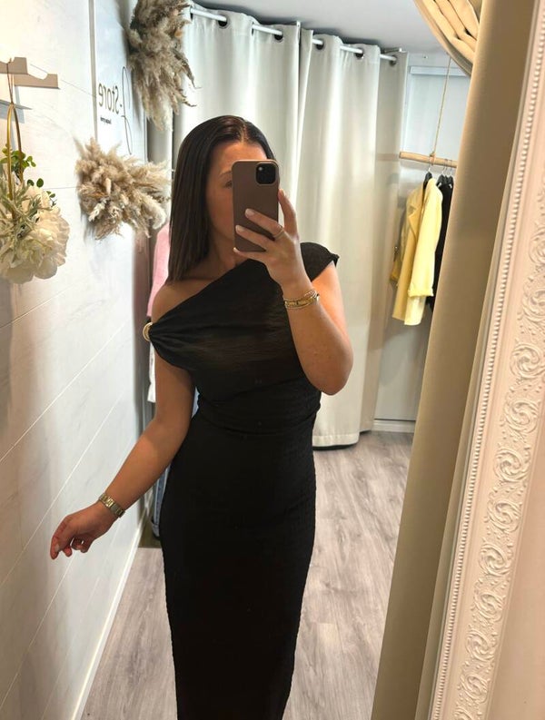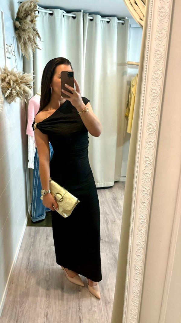Découvrez notre robe longue asymétrique noire, une pièce qui sublime la silhouette avec finesse et sophistication. Son drapé délicat souligne les courbes, tandis que sa coupe épurée apporte une allure à la fois moderne et résolument chic.