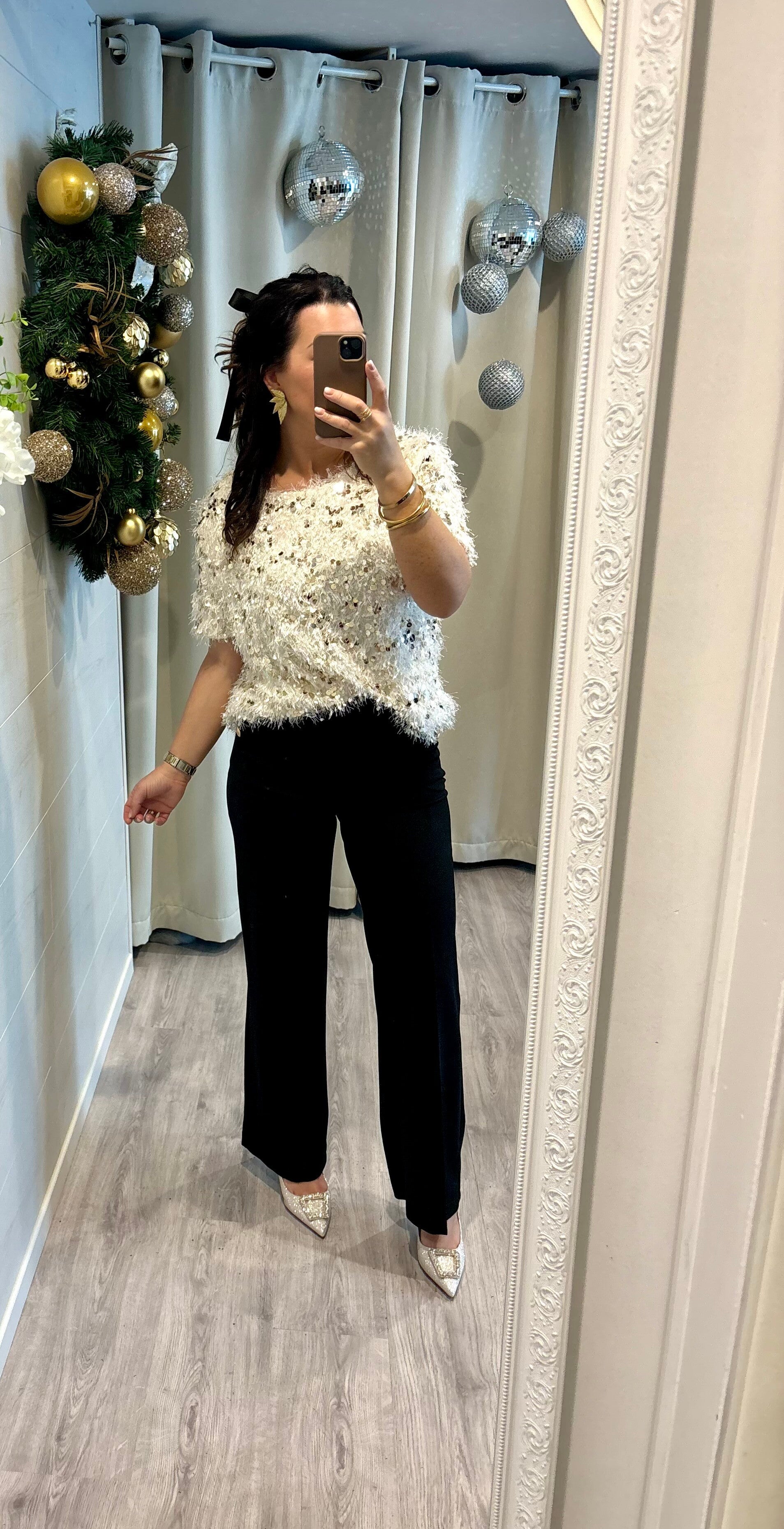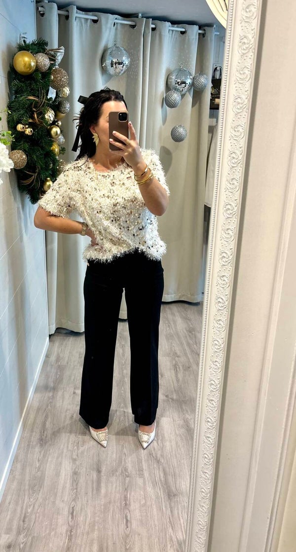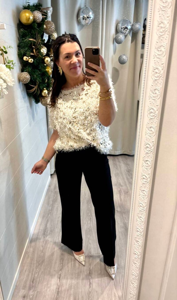 Notre blouse effet plume et strass dorés apporte une touche de glamour instantané. Légère, lumineuse et irrésistiblement chic — la pièce parfaite pour faire sensation. ✨