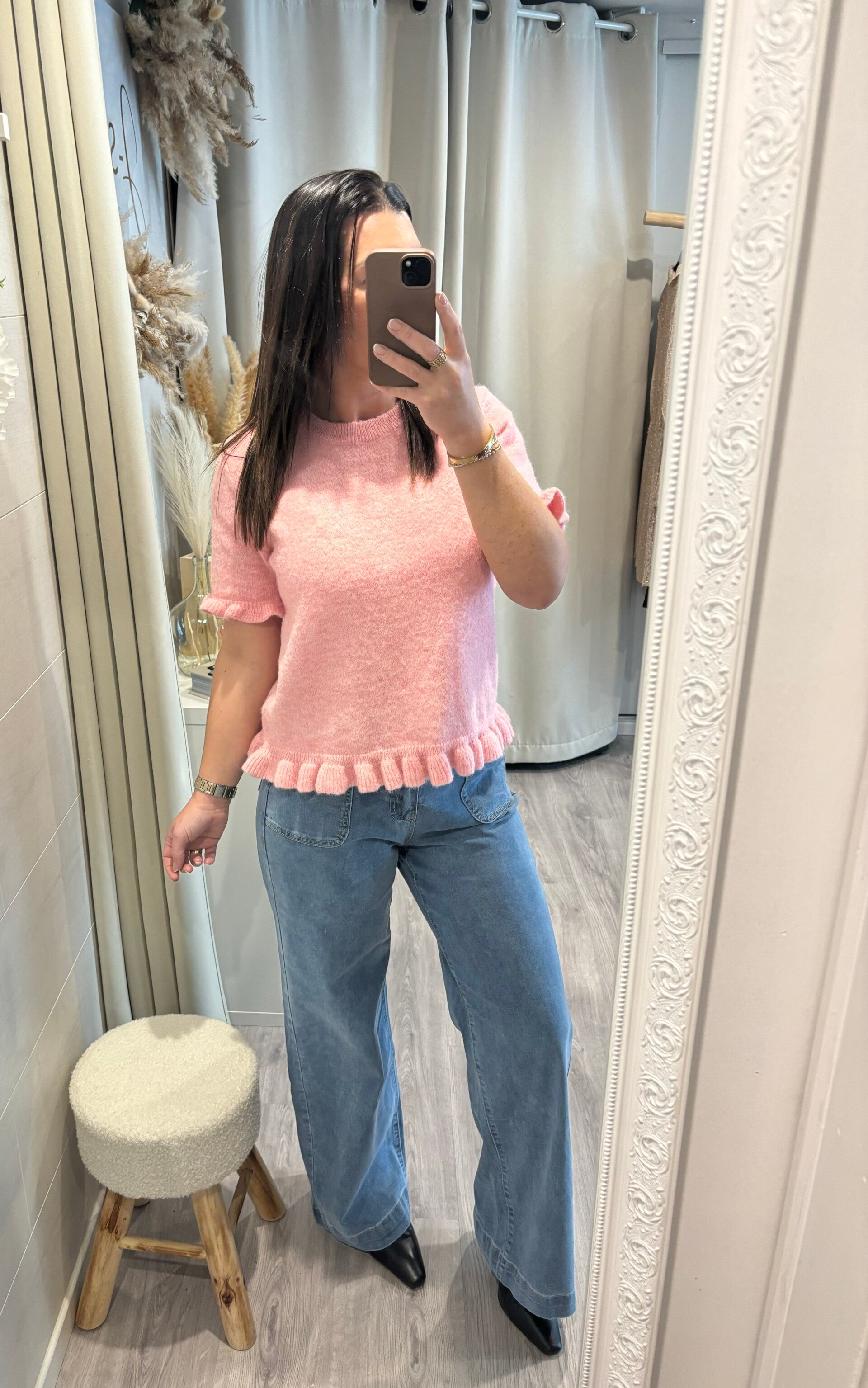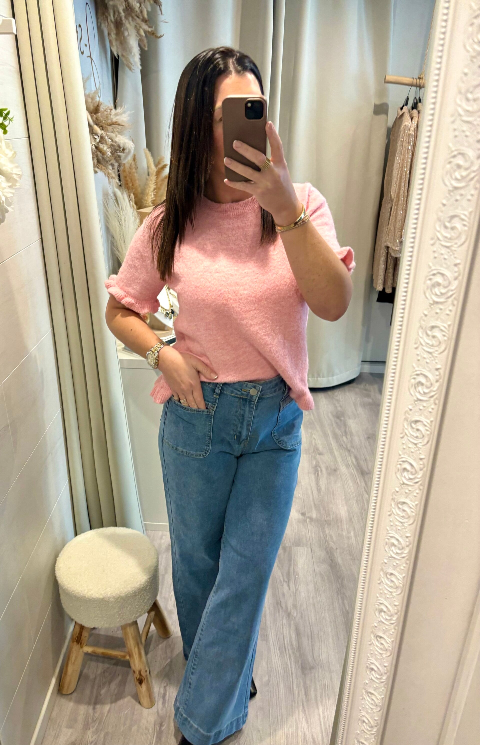 Ce petit pull rose est un vrai coup de cœur : une maille toute douce, une coupe flatteuse et de jolis volants aux manches et à la taille qui apportent une touche féminine et délicate.