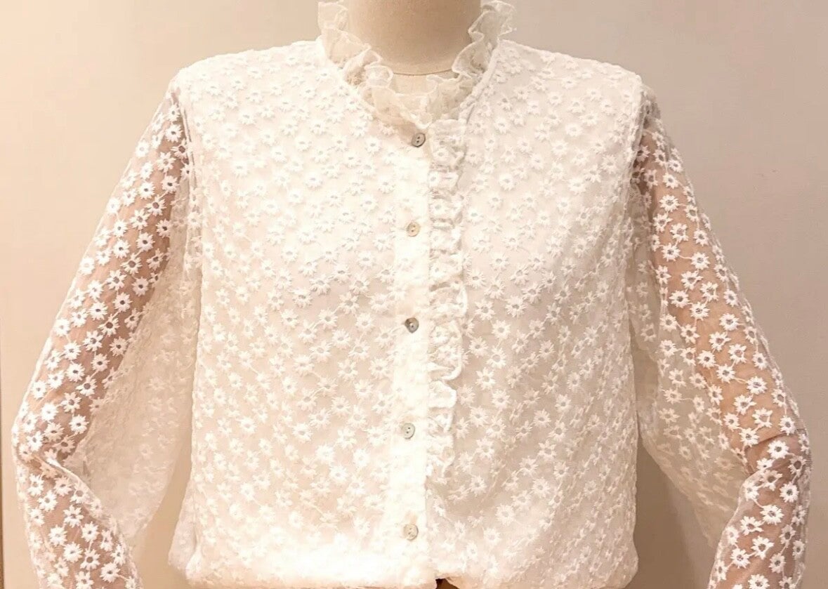 Délicate et intemporelle, cette blouse en broderie fleurie séduit par ses détails raffinés et ses jolis volants. Une pièce pleine de charme, parfaite pour illuminer vos tenues du quotidien.