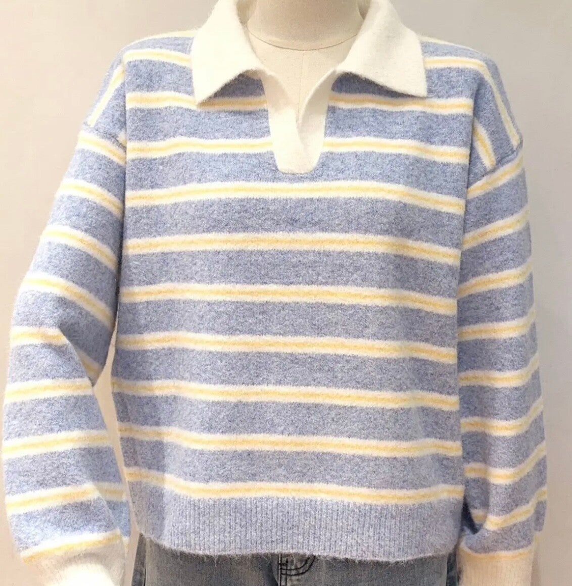 Avec ses rayures délicates et son col polo contrasté, ce pull allie confort et élégance décontractée. Une pièce facile à porter, parfaite pour un look doux et lumineux.