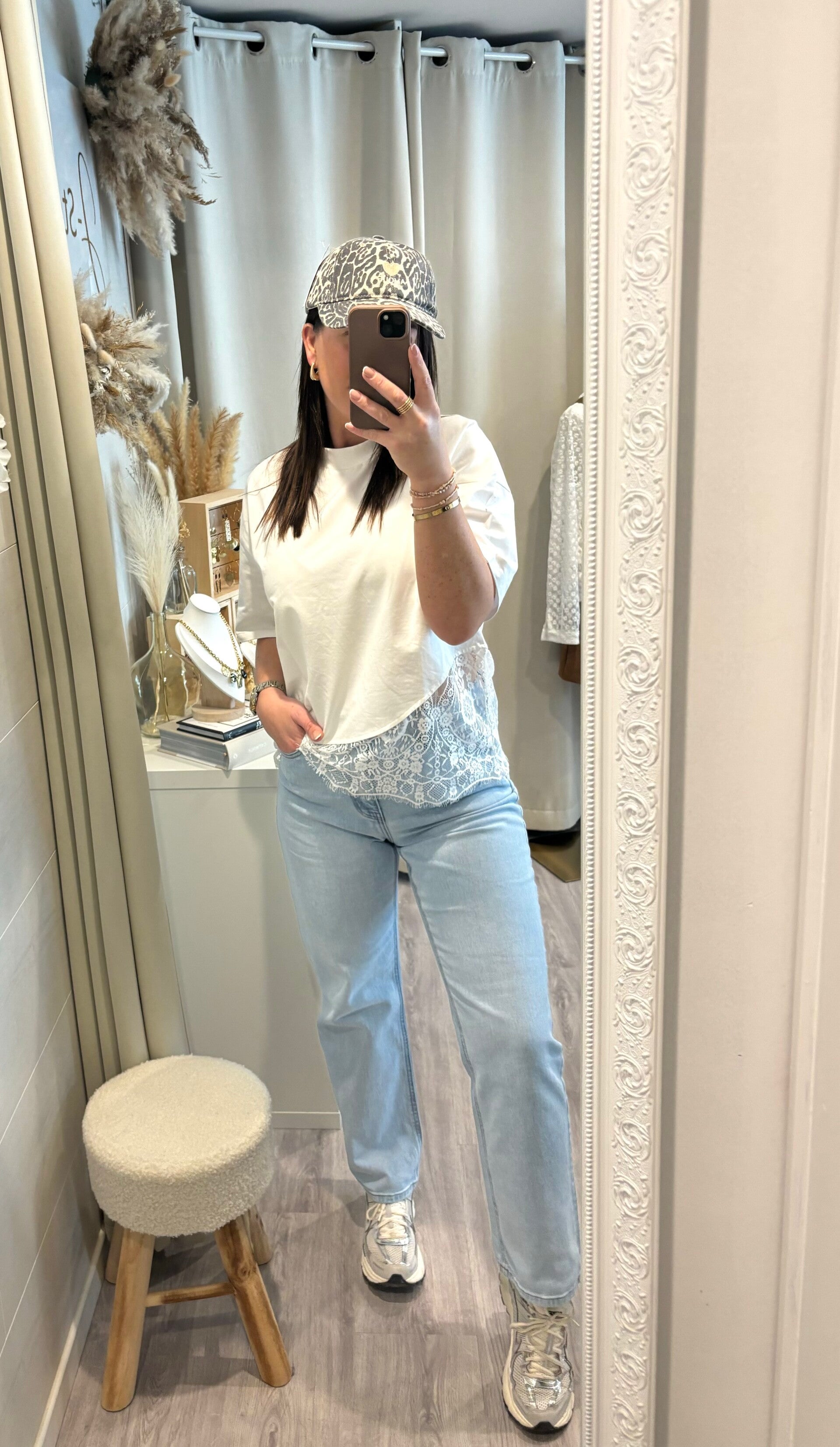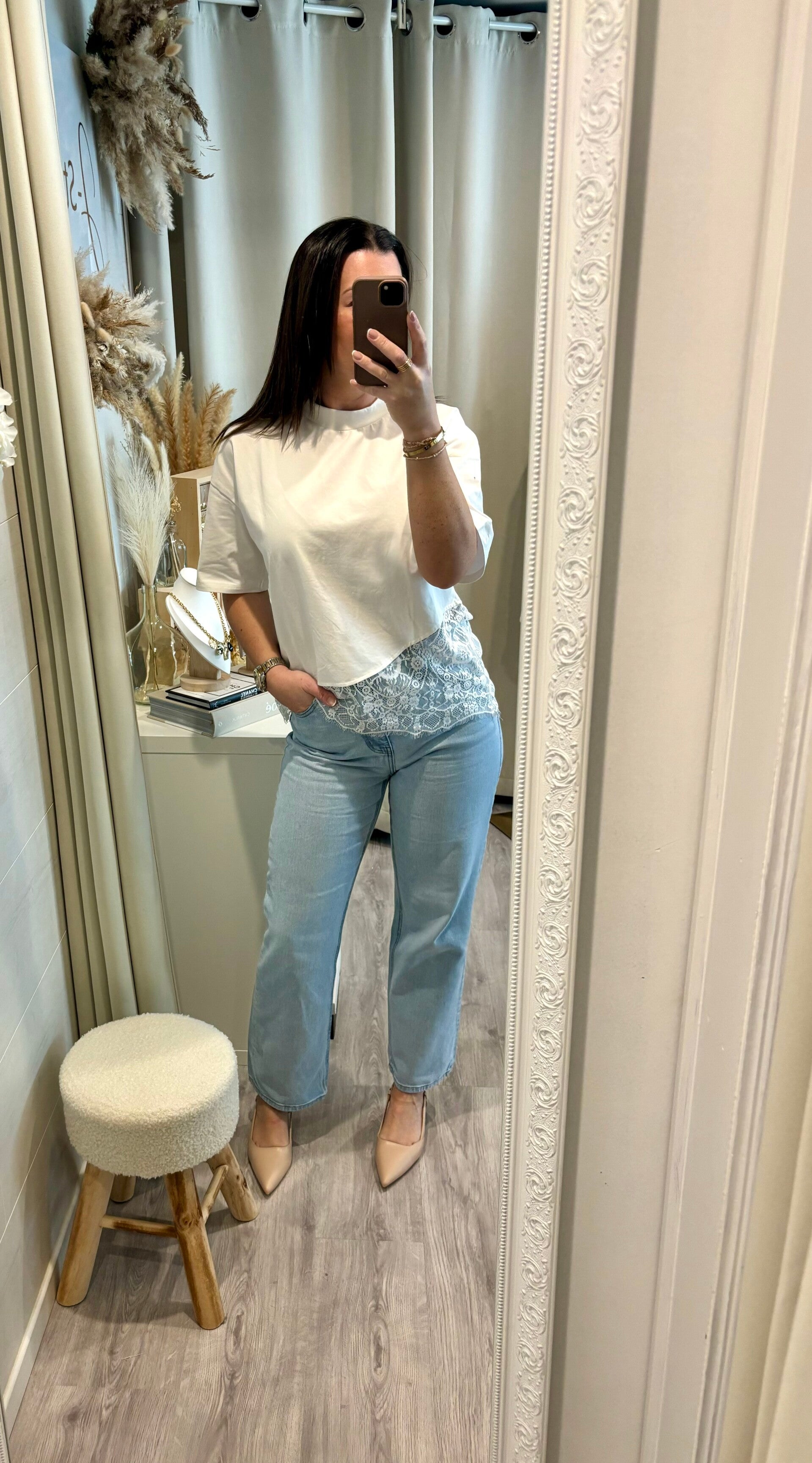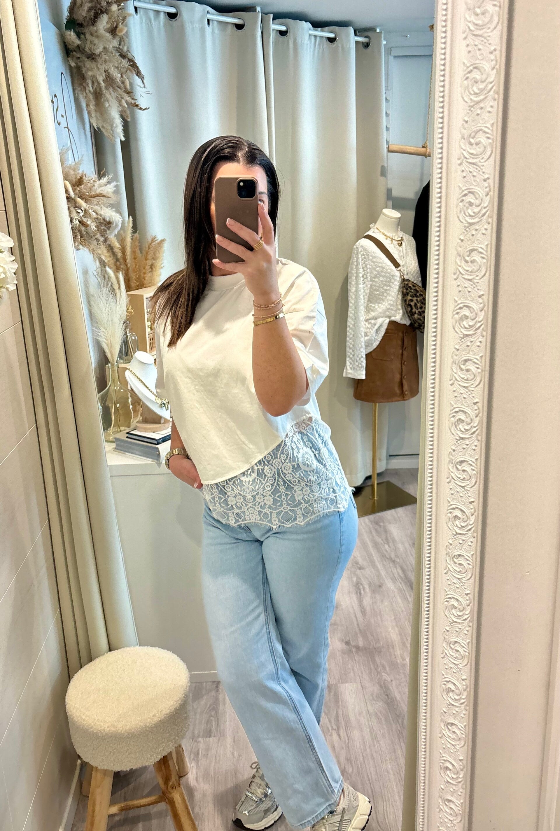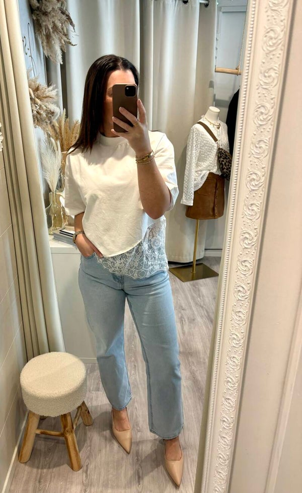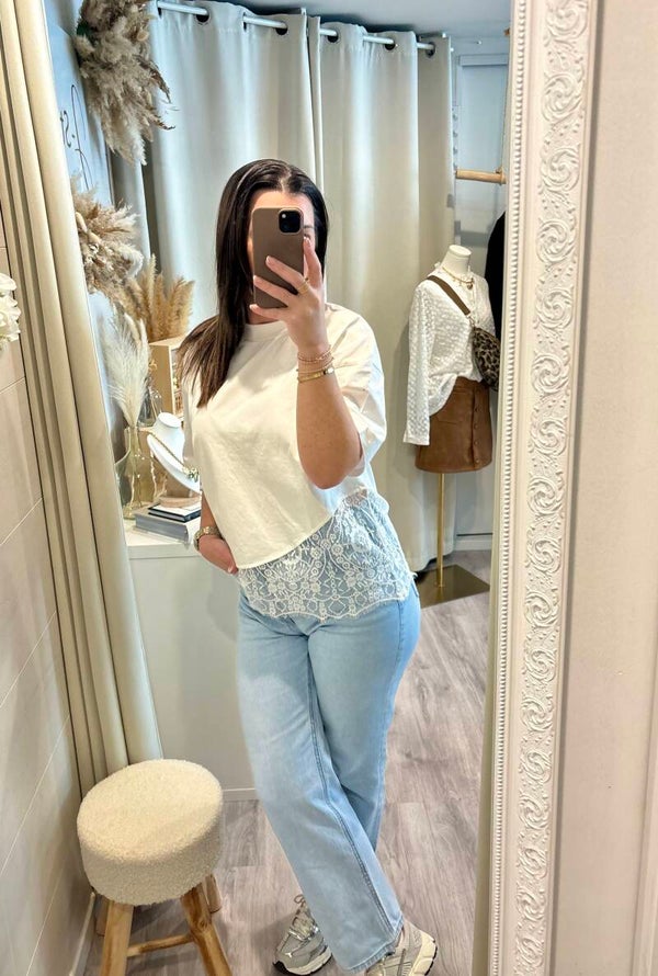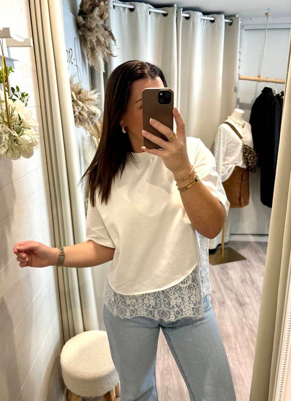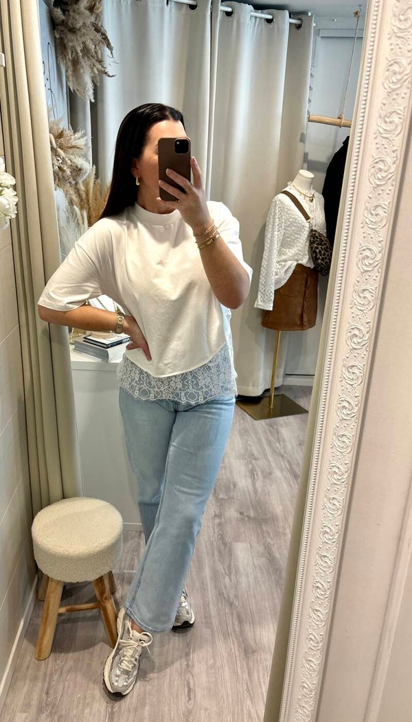 Le basique qui fait la différence. Avec sa finition en dentelle délicate, ce tee-shirt joue sur le contraste entre simplicité et sophistication. Facile à porter, impossible à oublier.