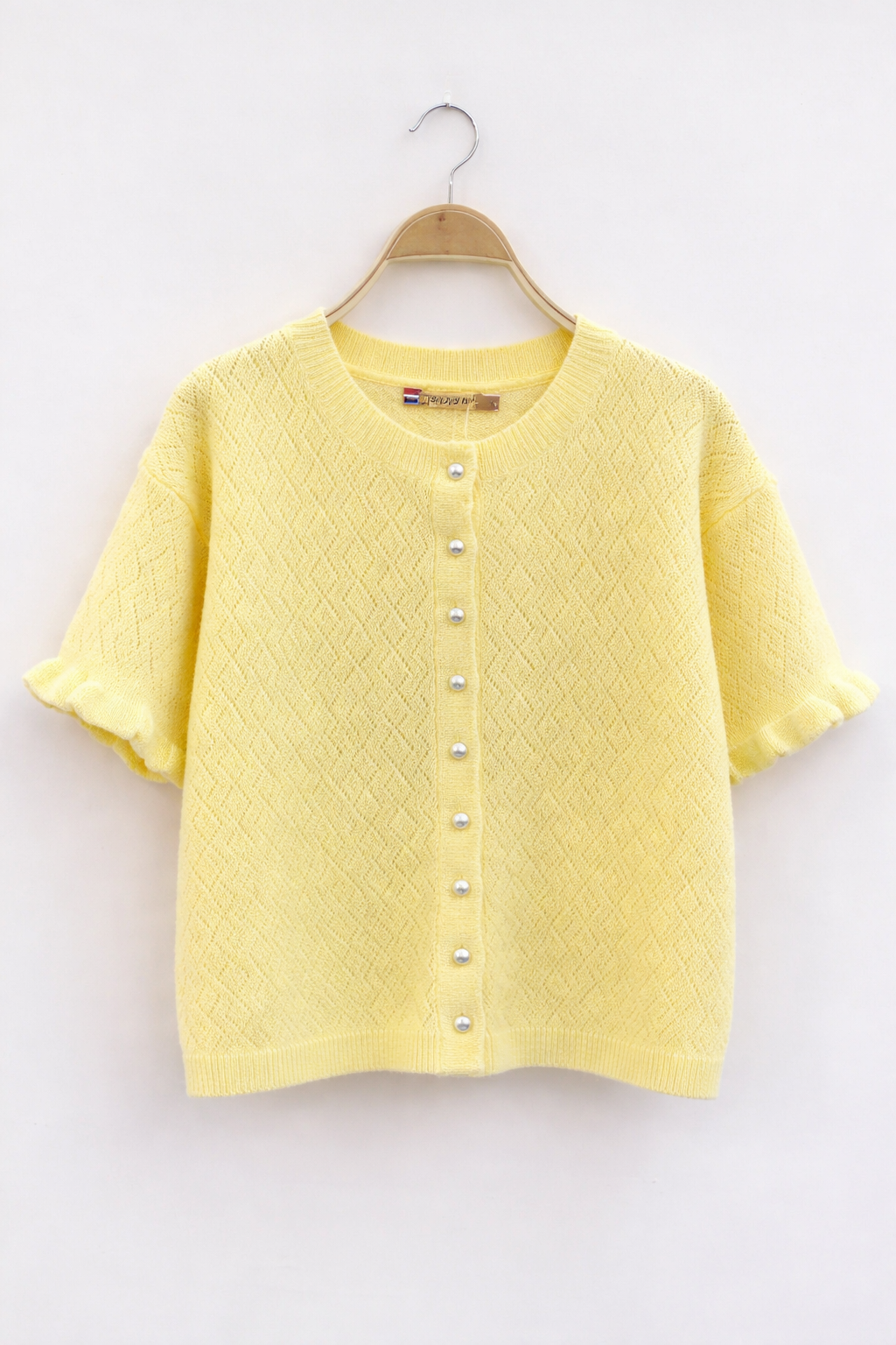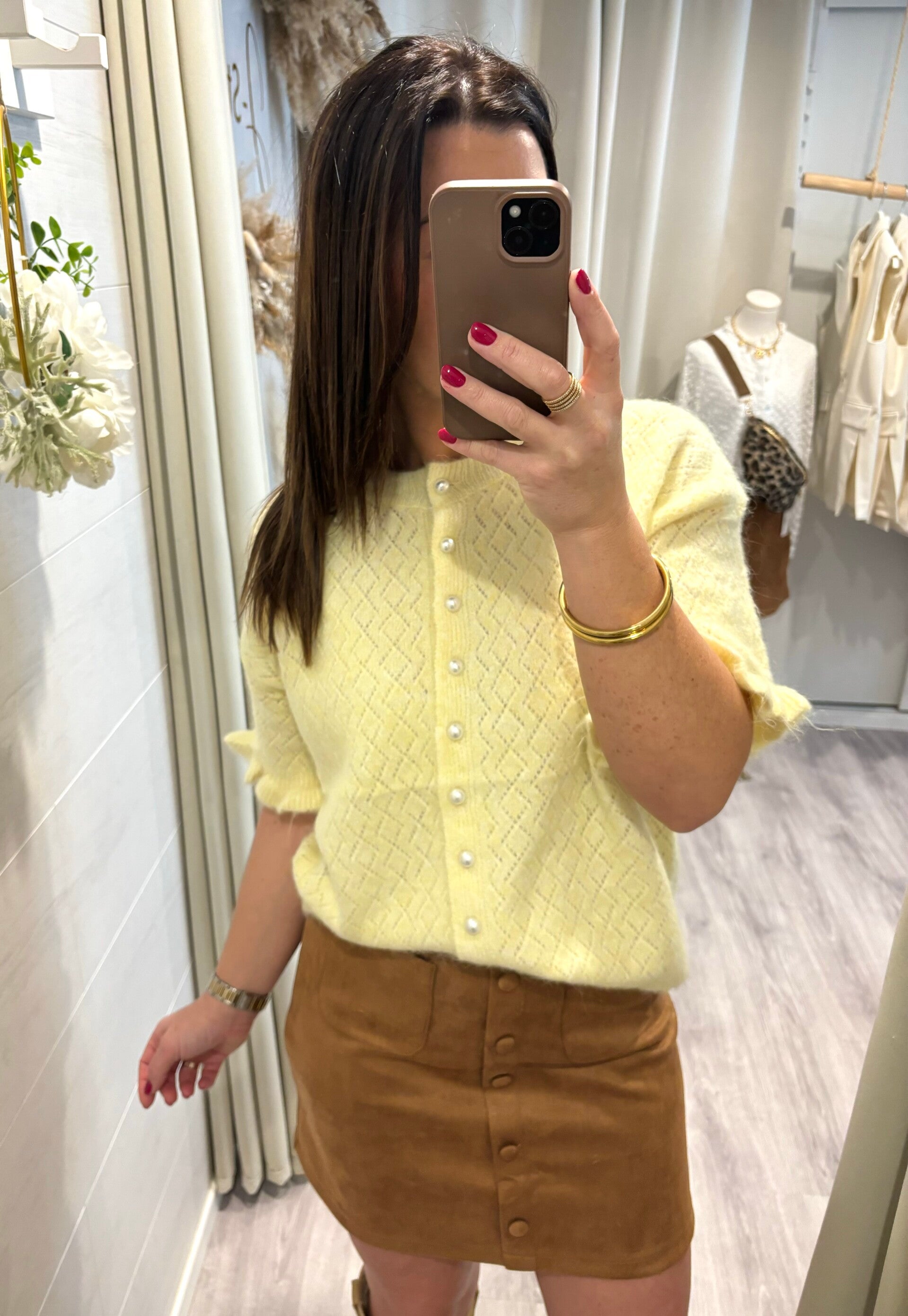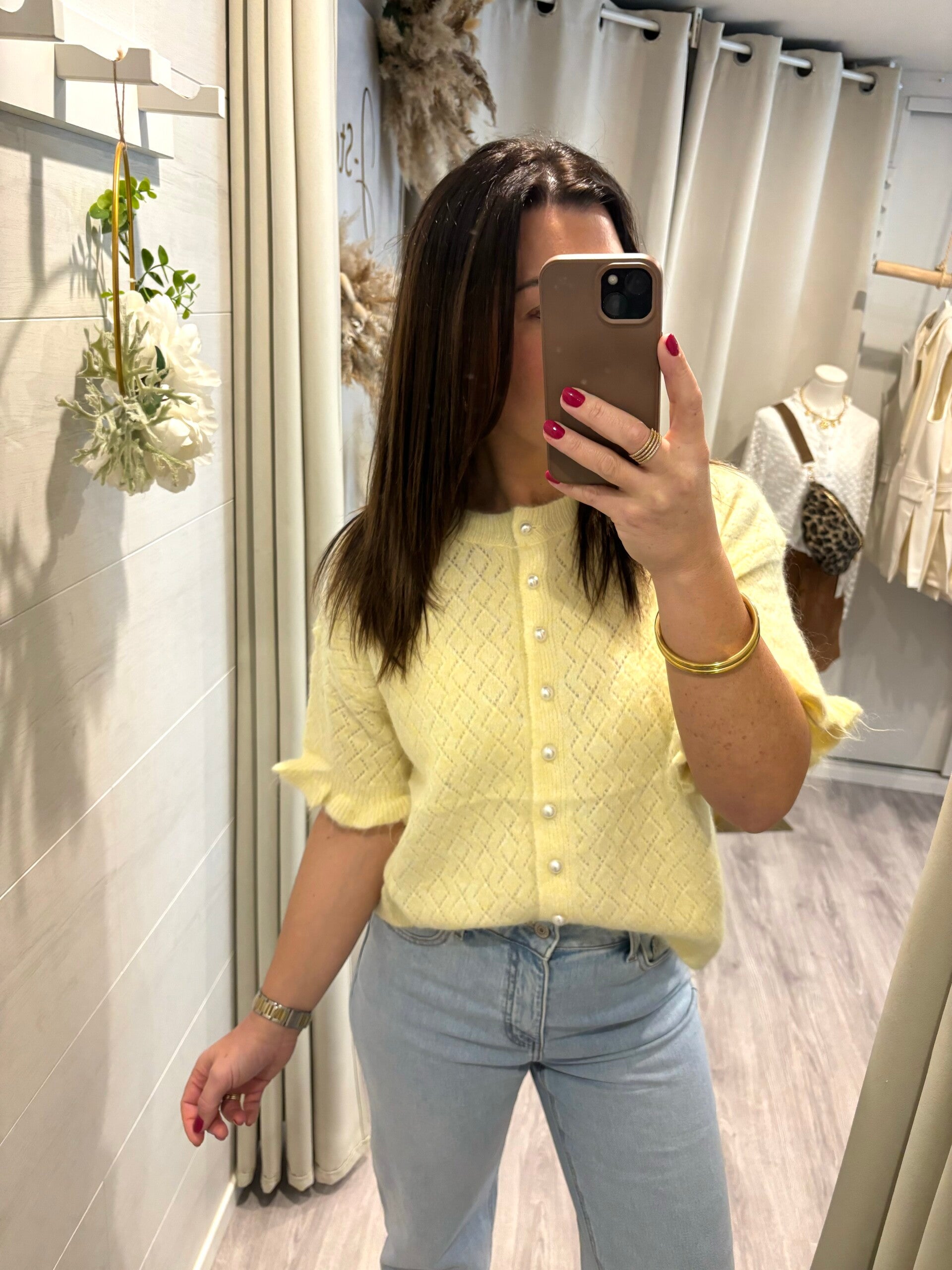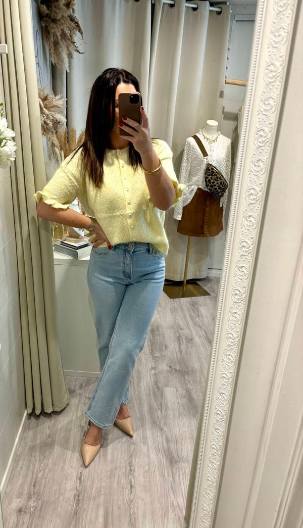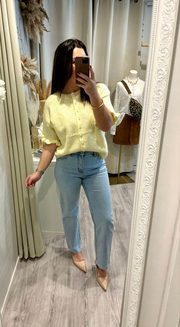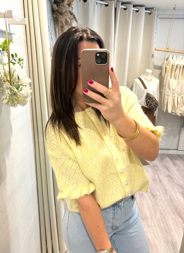 Illuminez votre silhouette avec ce gilet jaune pastel, délicat et féminin. Sa maille fine au motif raffiné épouse la silhouette avec légèreté, tandis que ses boutons nacrés apportent une touche chic et élégante.